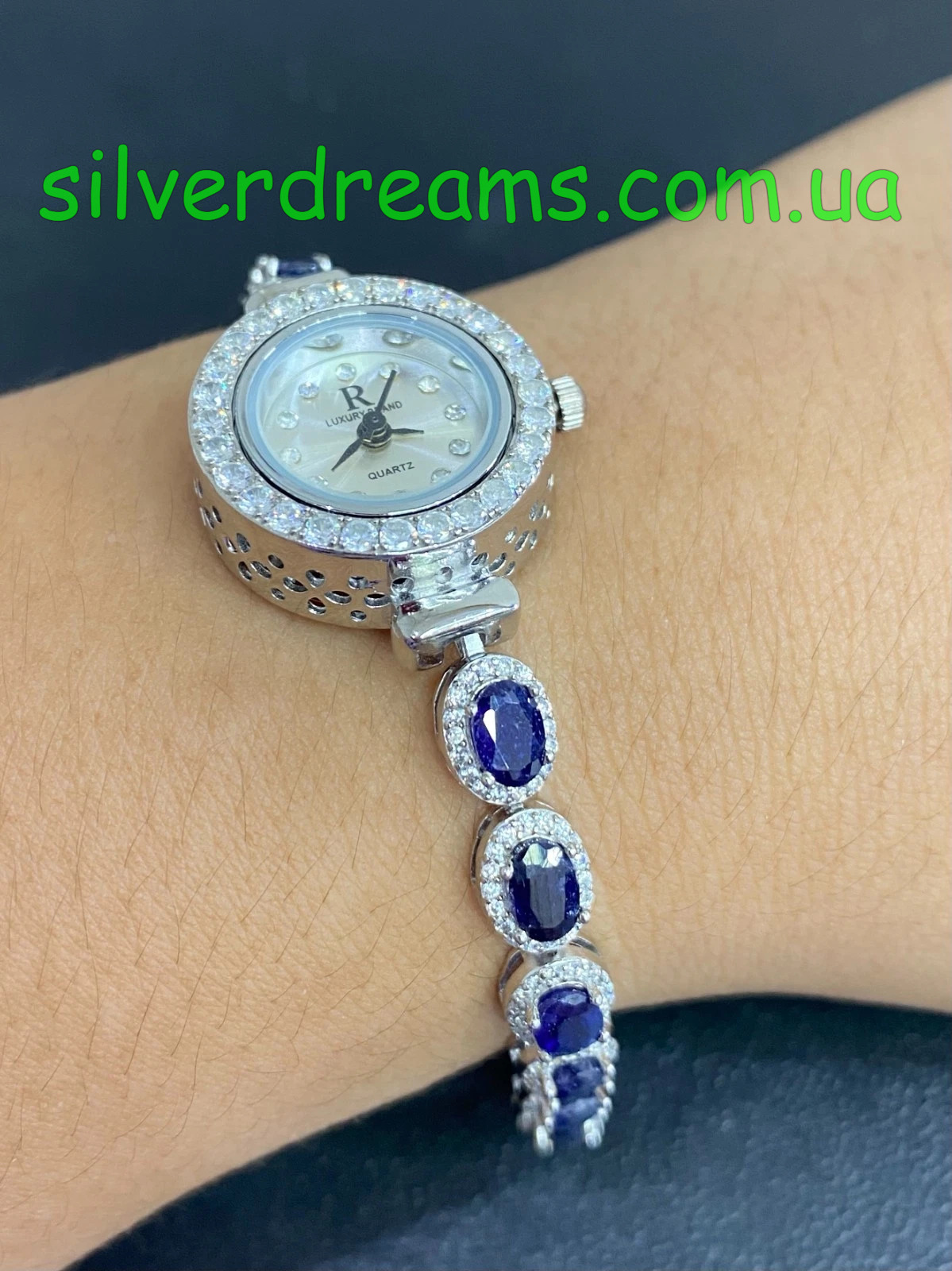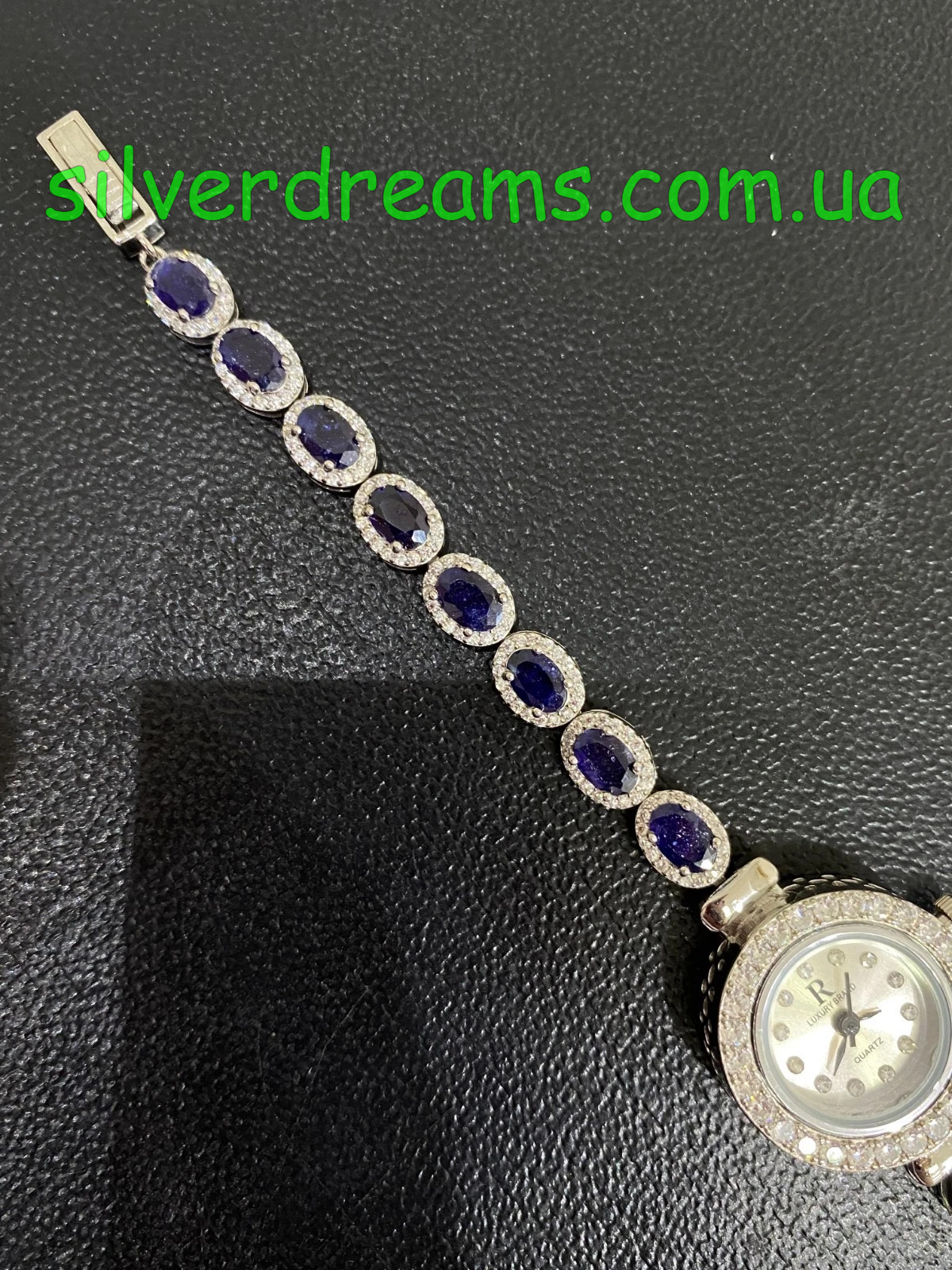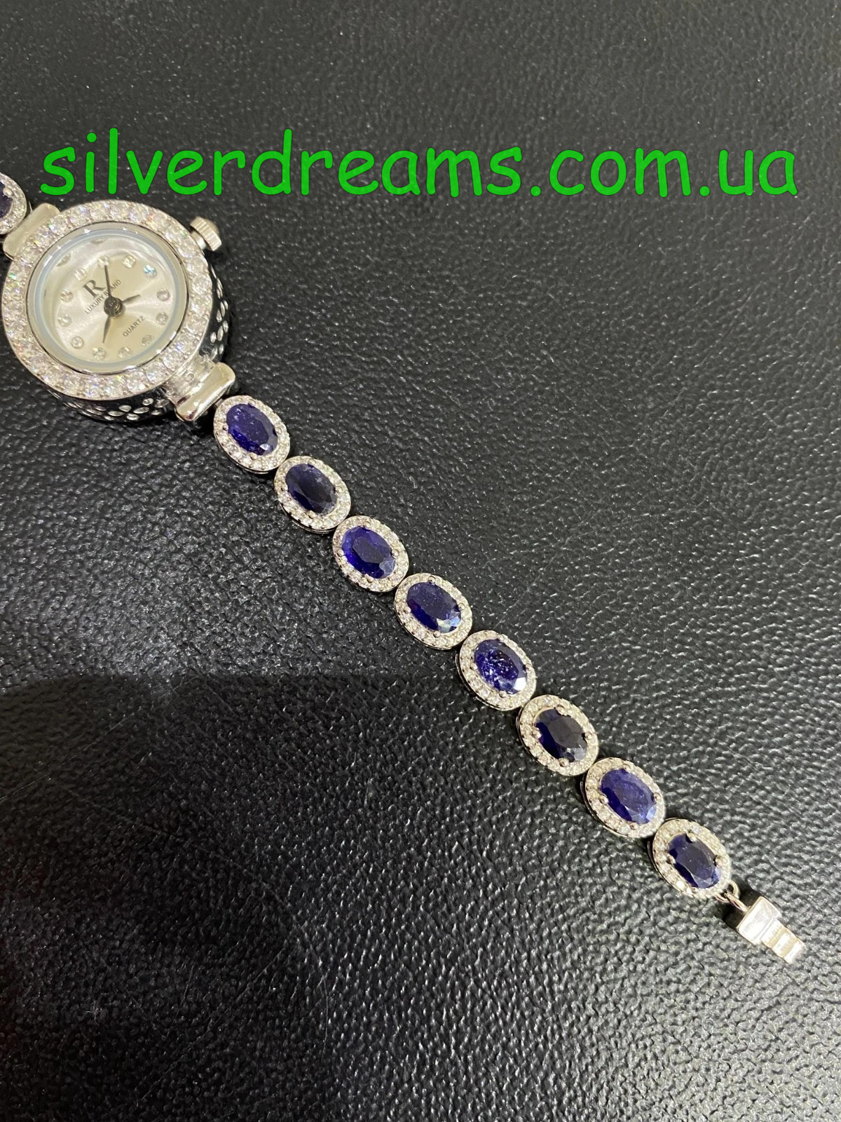 Комфортные элегантные часы/браслет из серебра 925 пробы, покрытого белым золотом, с натуральными сапфирами и россыпью фианитов.