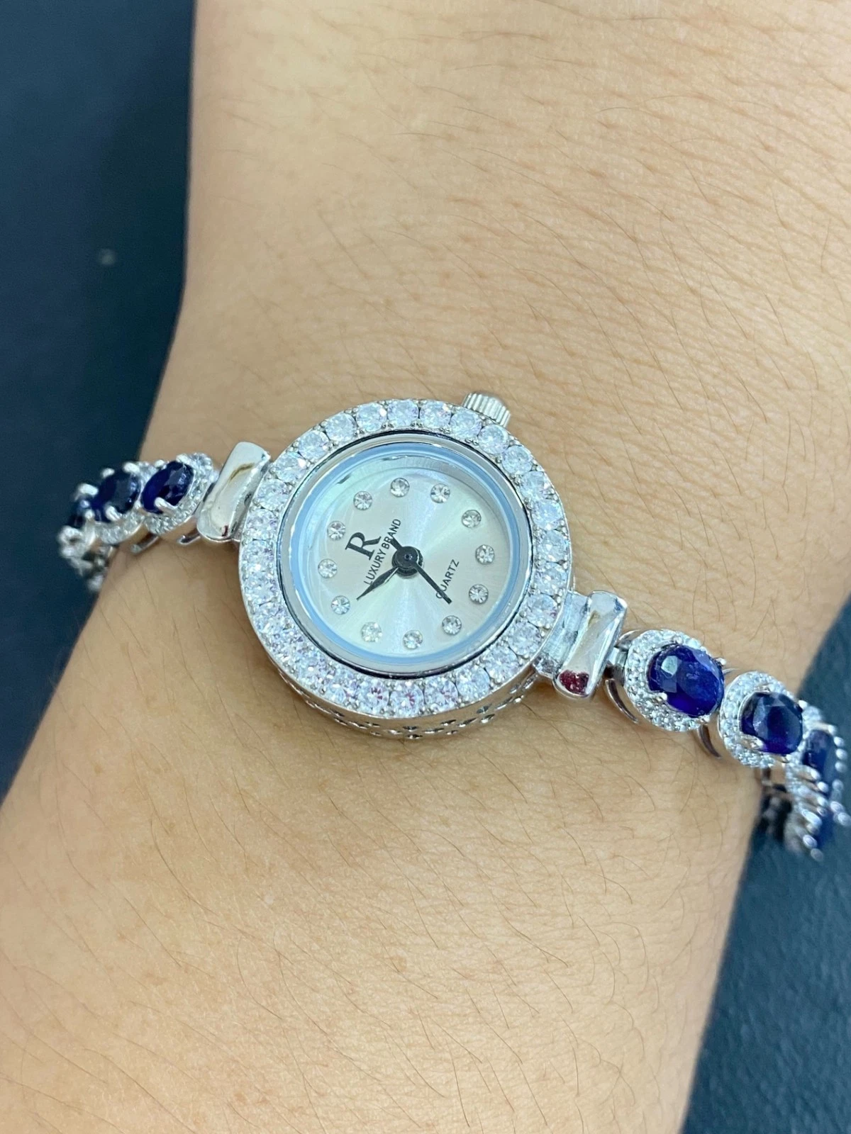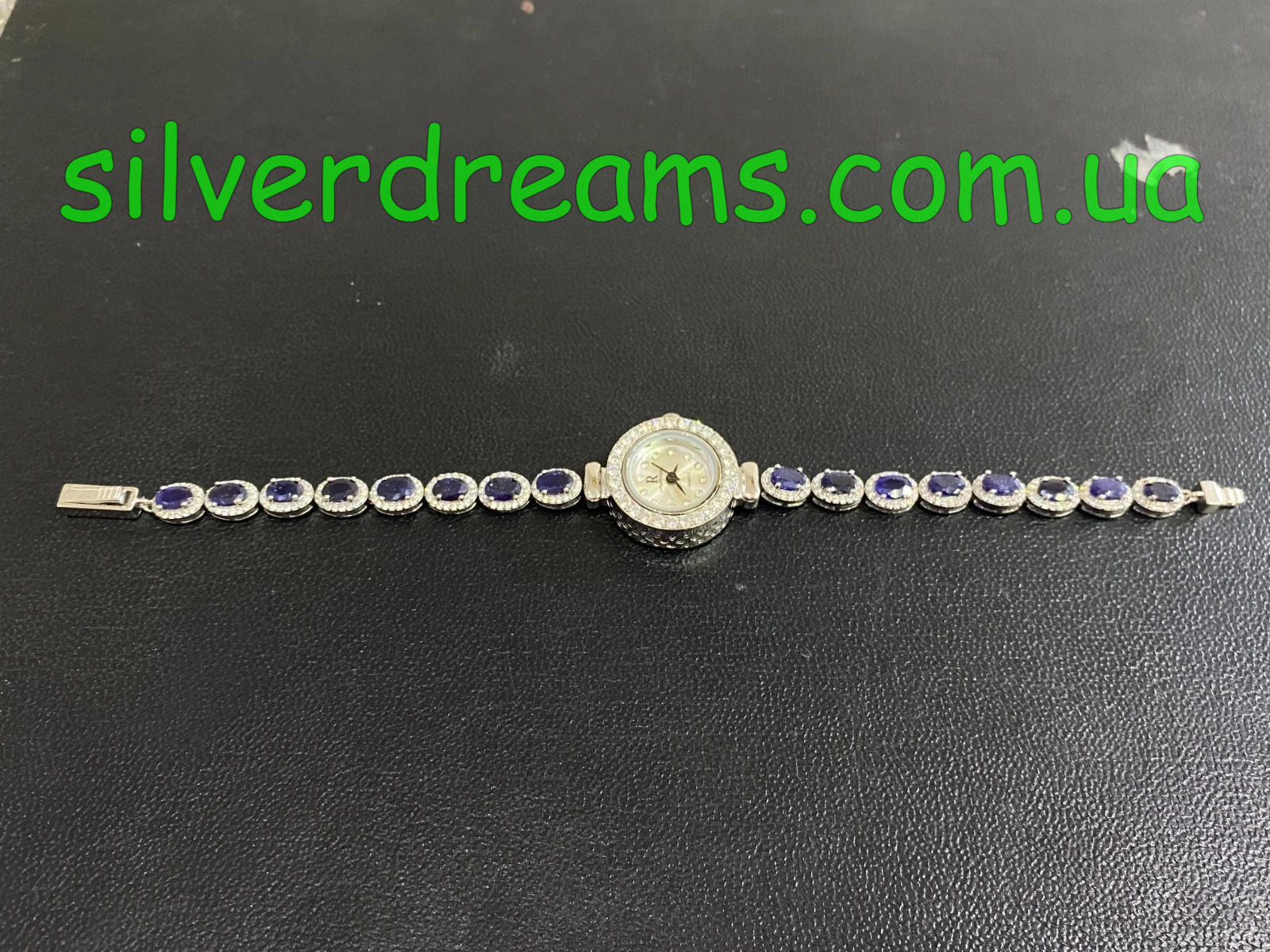 Размеры: сапфиры — 6х4 мм (16 штук), фианиты — 1-2,5 мм; общая длина изделия — 8 дюймов (20 см), диаметр циферблата — 25 мм.