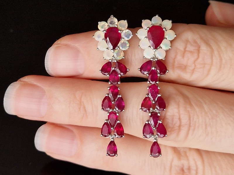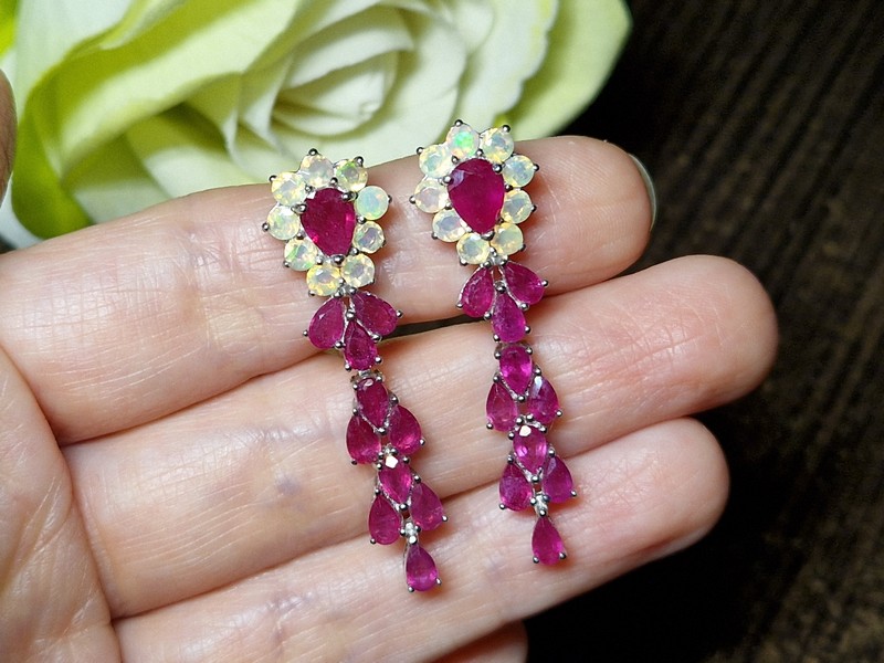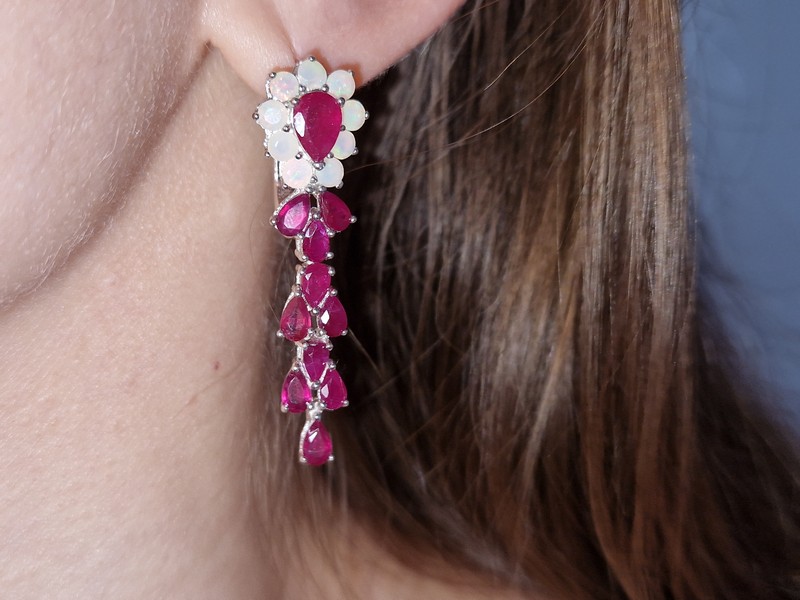 Размеры: рубины — 7х5 и 5х3 мм, опалы — 3 мм; серьги — 44х13 мм.