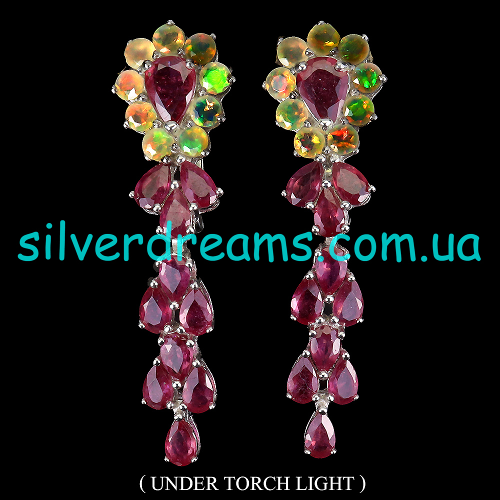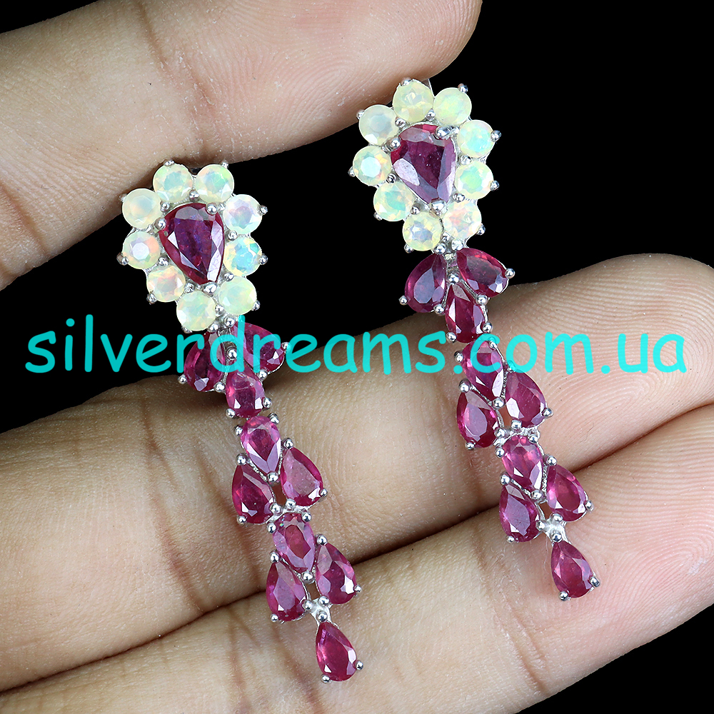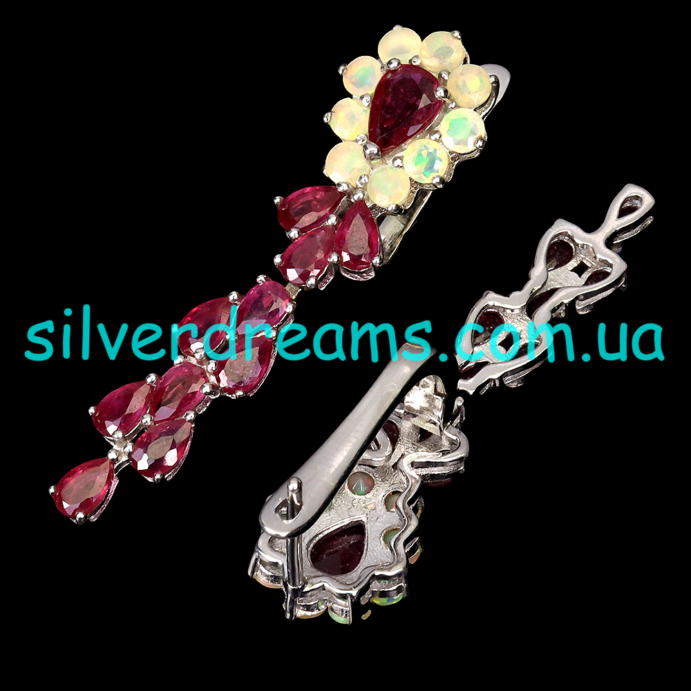 Гламурные обворожительные серьги из серебра 925 пробы, покрытого белым золотом, с натуральными рубинами и природными эфиопскими опалами, застёжка — английский замок.