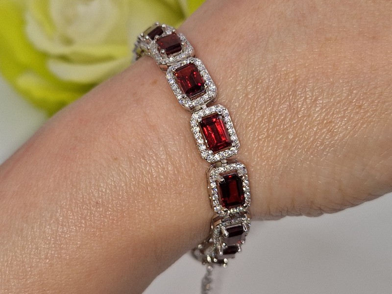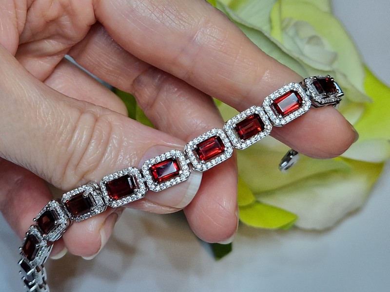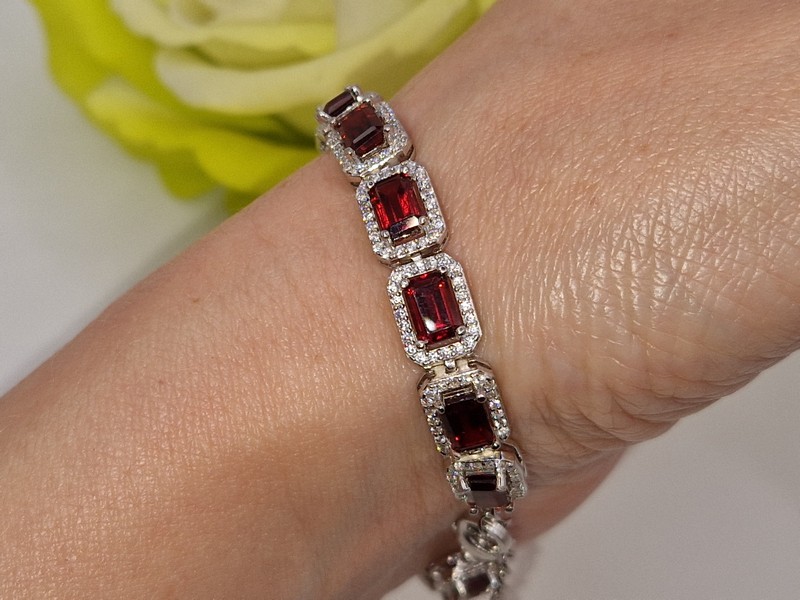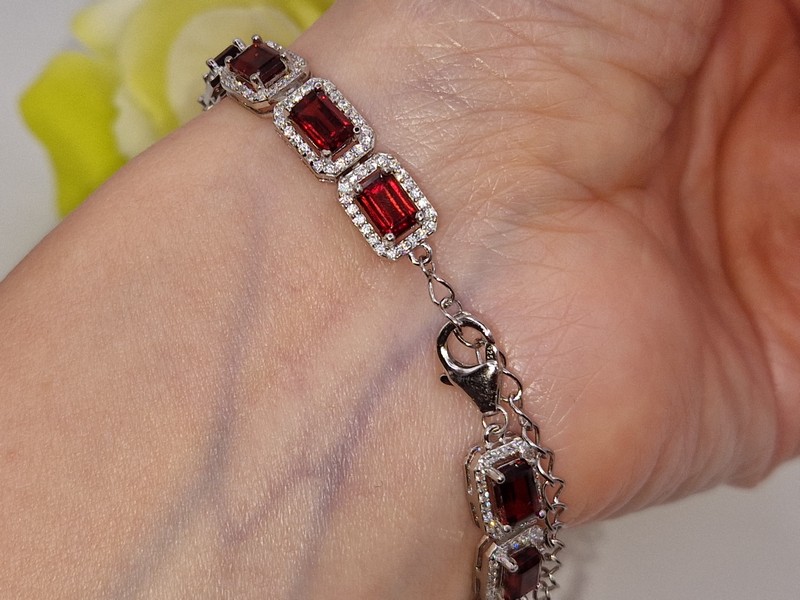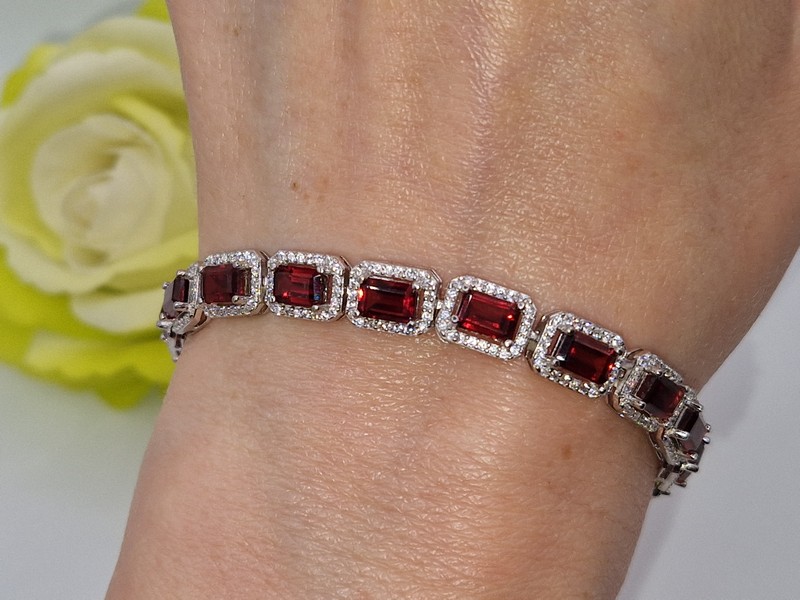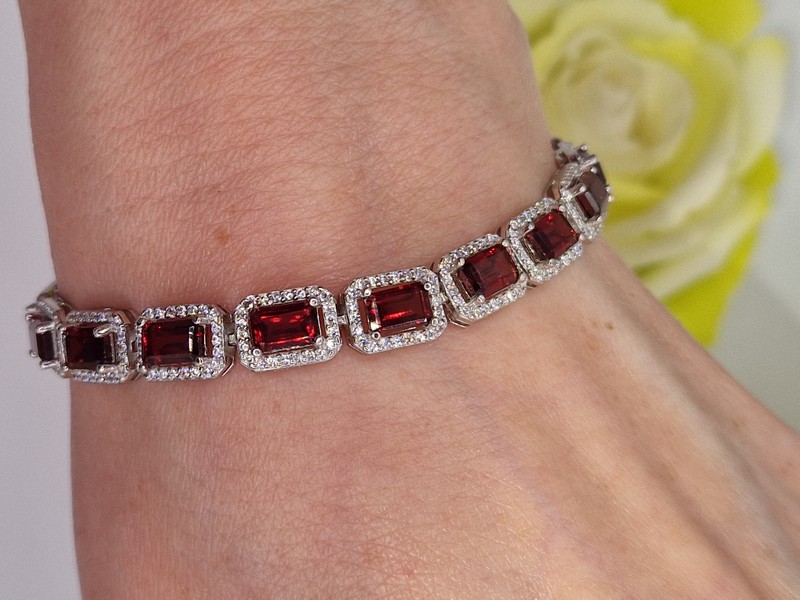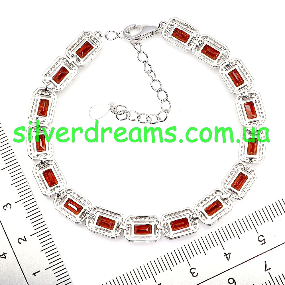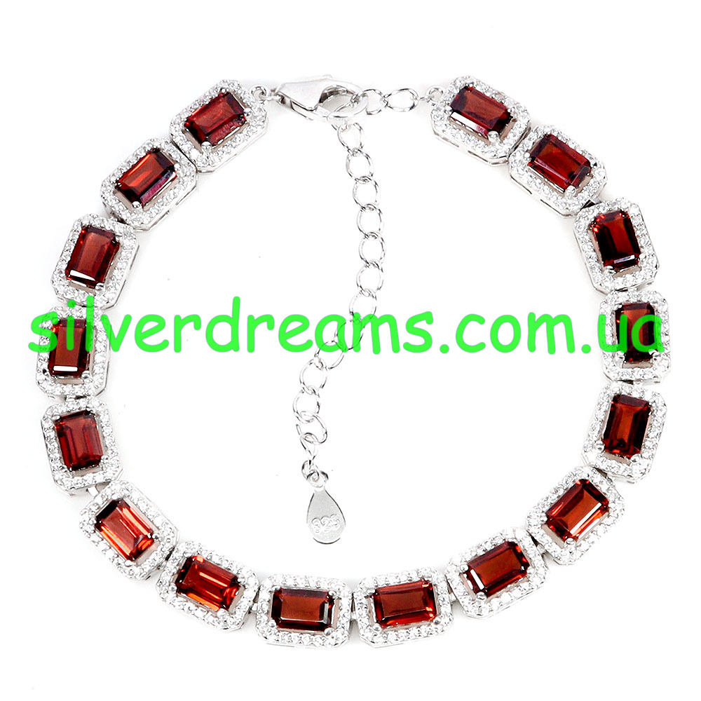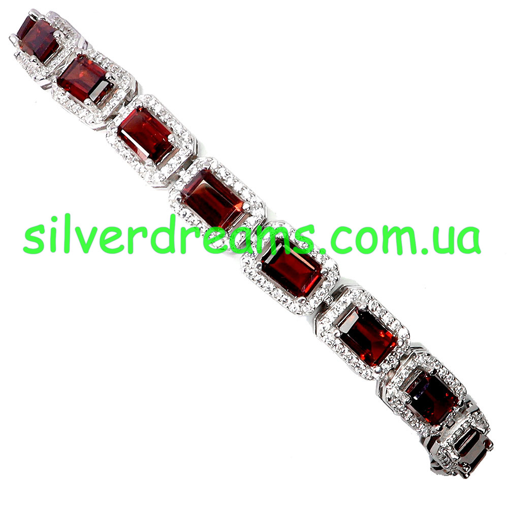 Стильный обворожительный браслет из серебра 925 пробы, инкрустированный натуральными красными гранатами и россыпью фианитов, застёжка — карабин.