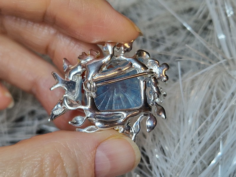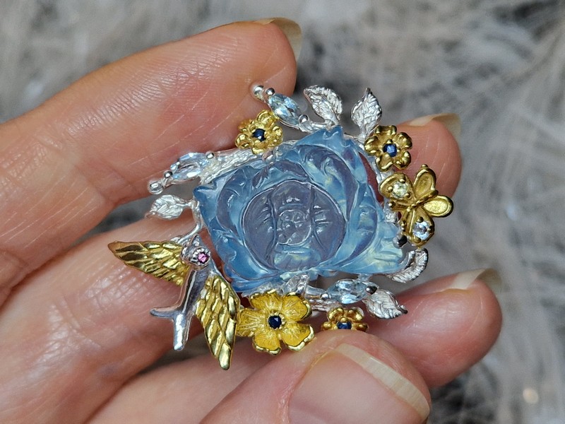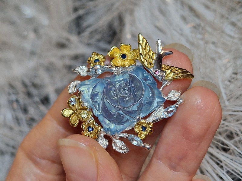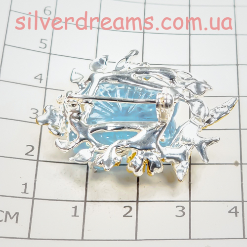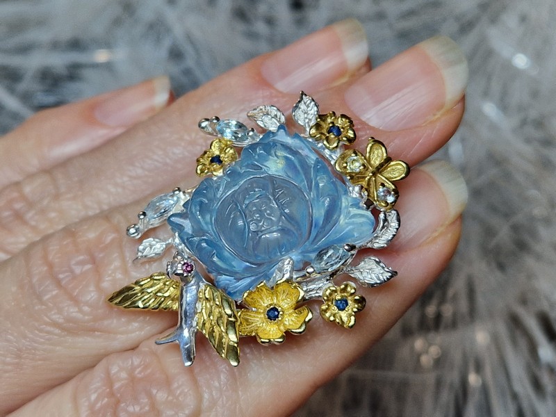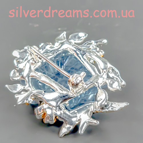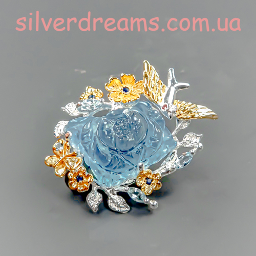 Уникальная брошь ручной работы из серебра 925 пробы в двухцветной позолоте (белое + лимонное золото), инкрустирована крупным натуральным резным аквамарином, природными топазами, сапфирами и родолитом.