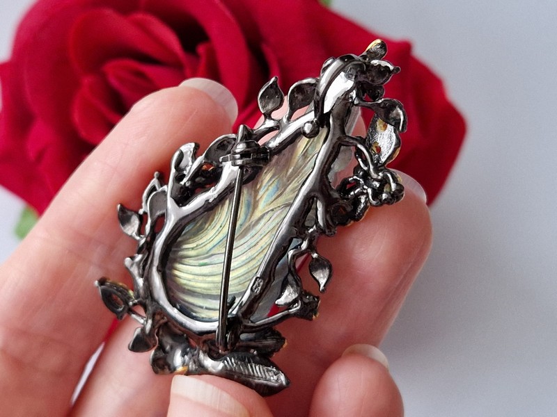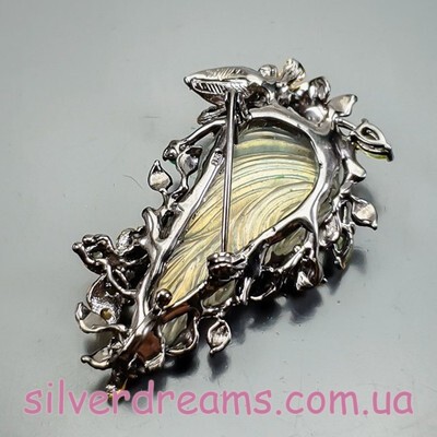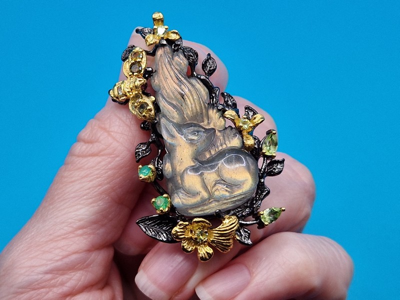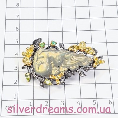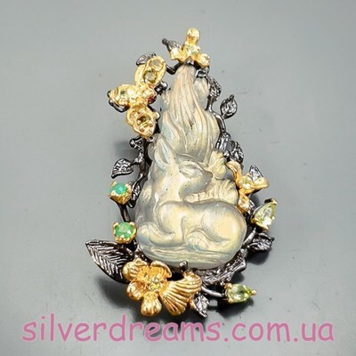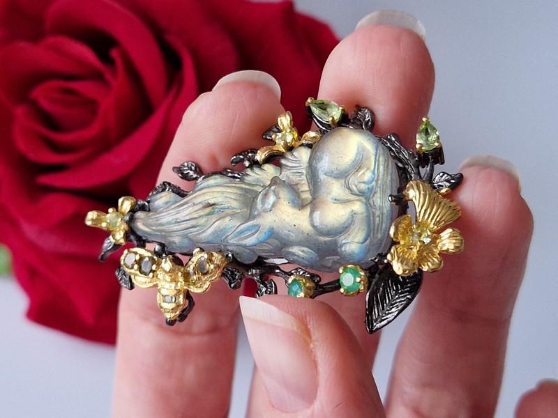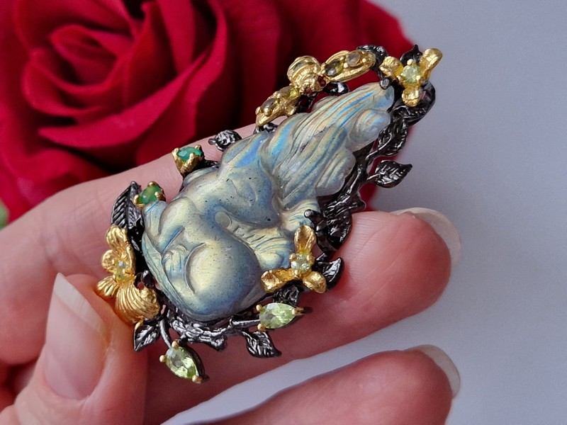 Уникальная брошь/подвеска ручной работы из серебра 925 пробы с двухцветным покрытием (чёрный родий + лимонное золото), инкрустирована крупным натуральным резным лабрадоритом, природными турмалинами, ониксом и хризолитами.