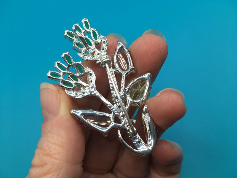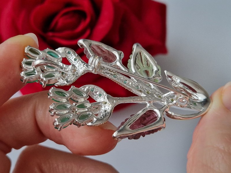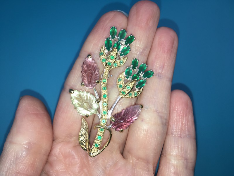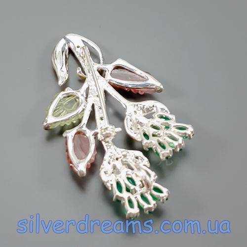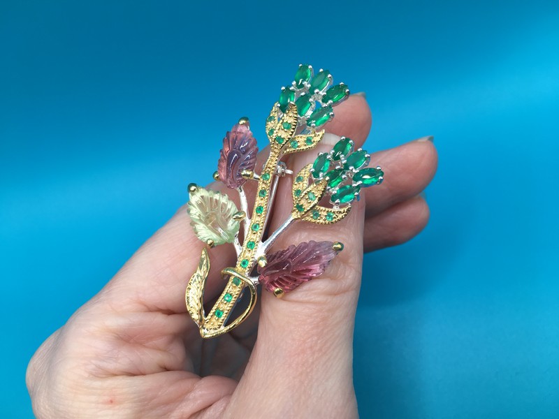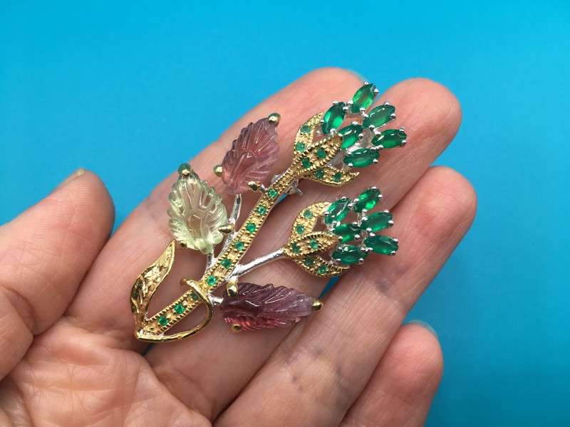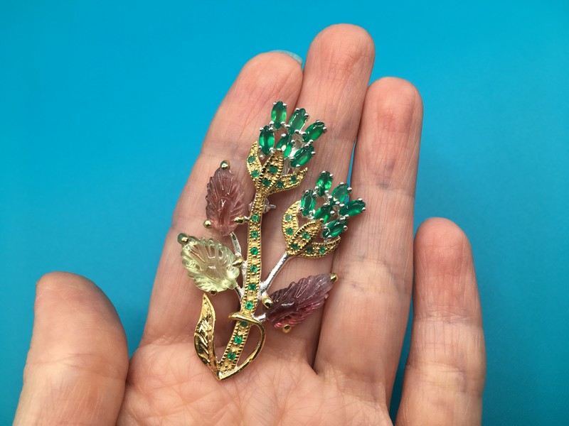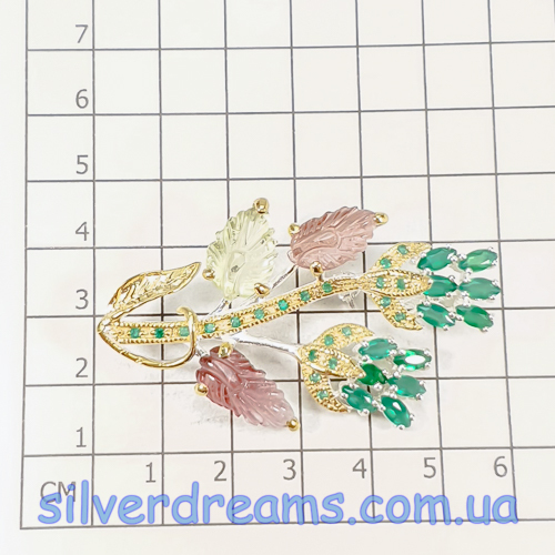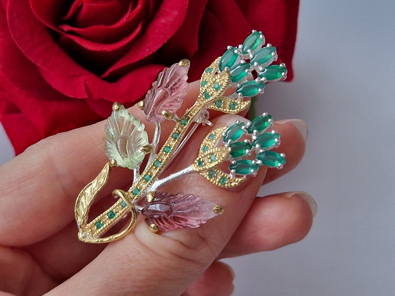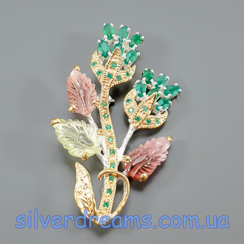 Уникальная брошь/подвеска ручной работы из серебра 925 пробы в двухцветной позолоте (белое + лимонное золото), инкрустирована натуральными резными турмалинами и природным зелёным ониксом.