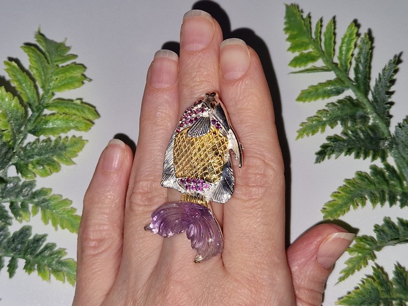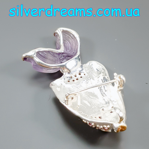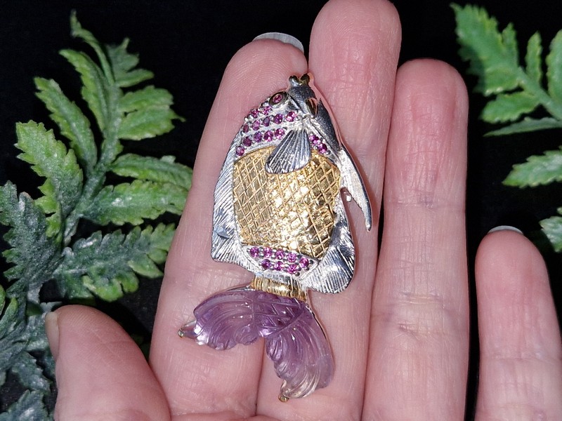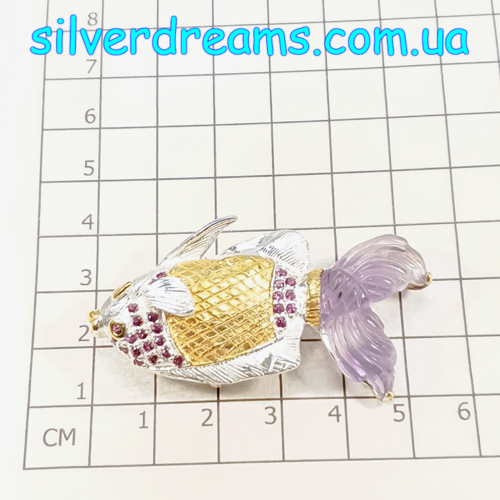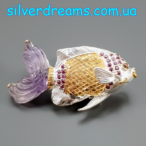 Уникальная брошь/подвеска ручной работы в виде рыбы из серебра 925 пробы в двухцветной позолоте (белое + лимонное золото), инкрустирована крупным натуральным резным аметистом и природными родолитами.