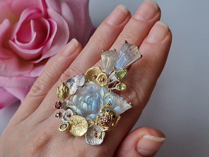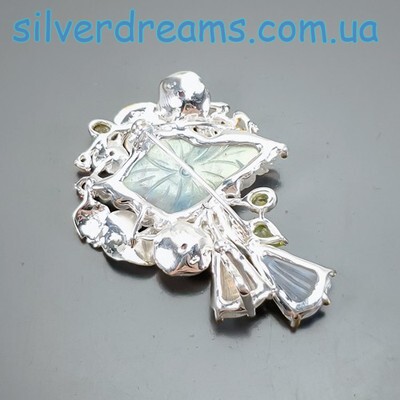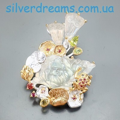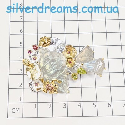 Уникальная брошь/кулон ручной работы из серебра 925 пробы в двухцветной позолоте (белое + лимонное золото), инкрустирована крупным натуральным резным лабрадоритом, природными турмалинами, хризолитами и родолитами.