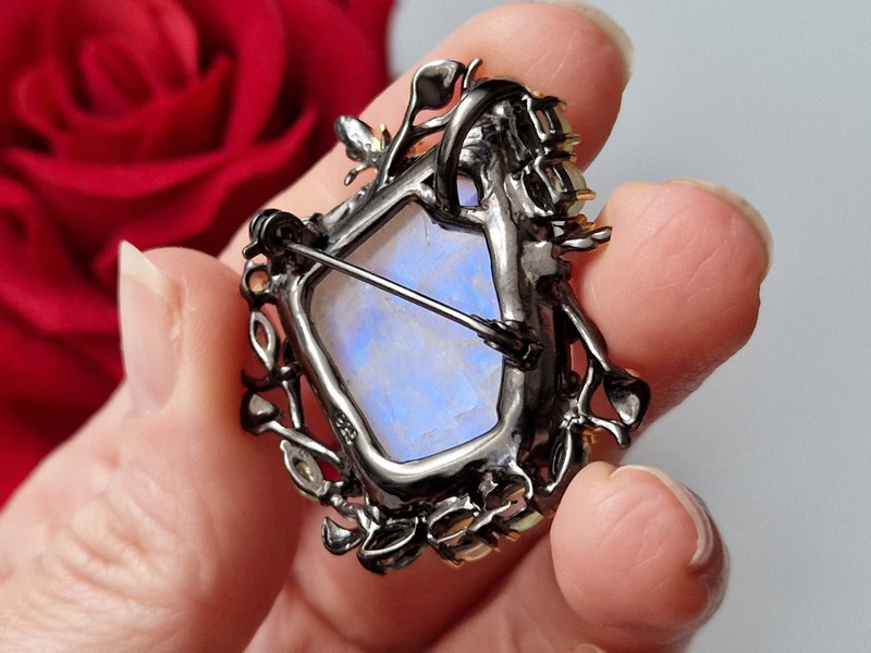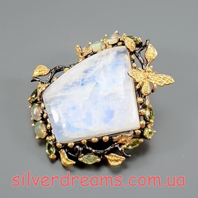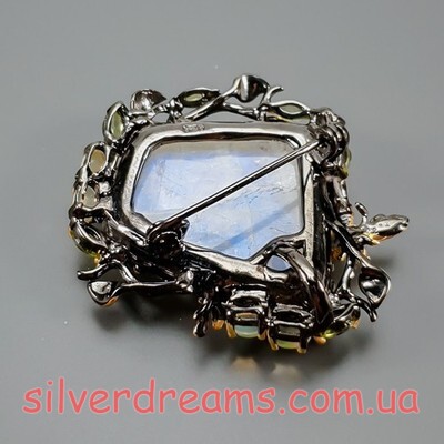 Уникальная брошь/кулон ручной работы из серебра 925 пробы с двухцветным покрытием (чёрный родий + лимонное золото), инкрустирована крупным натуральным лунным камнем сорта адуляр, природными опалами и хризолитами.