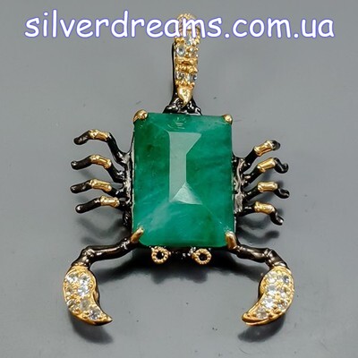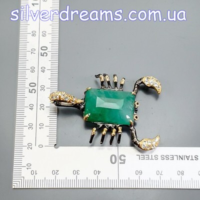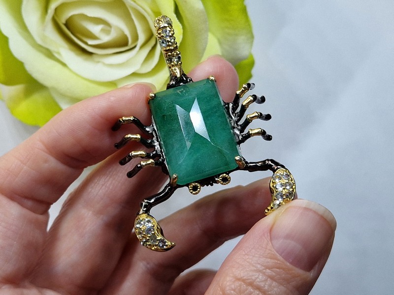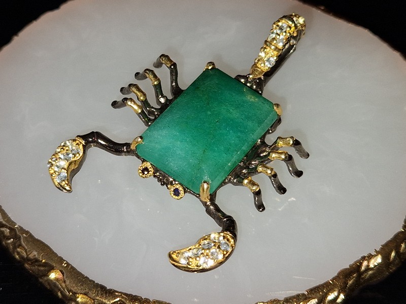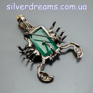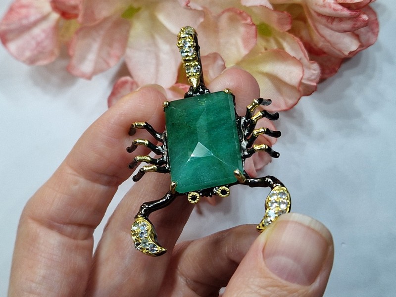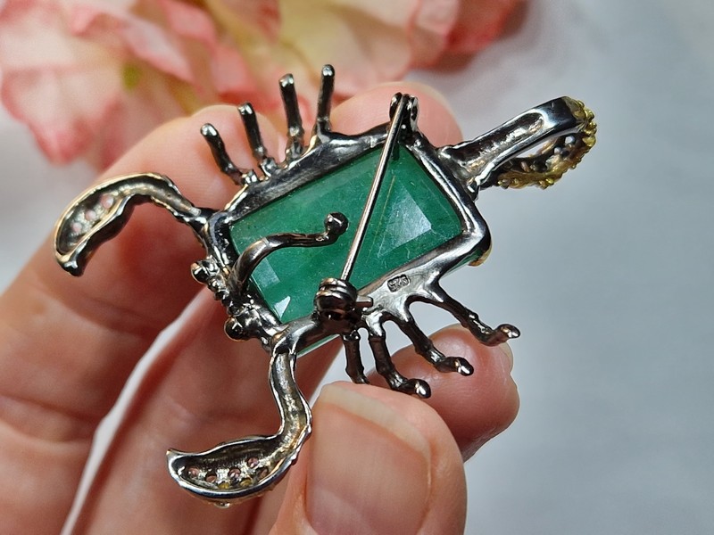 Уникальный кулон/брошь ручной работы в виде скорпиона из серебра 925 пробы с двухцветным покрытием (чёрный родий + лимонное золото), инкрустирован крупным натуральным зелёным бериллом, природными топазами и сапфирами.