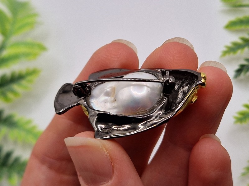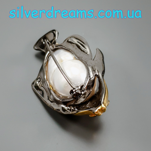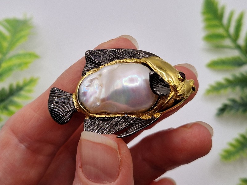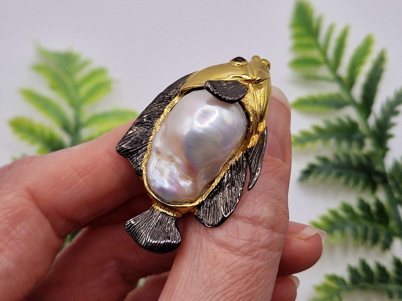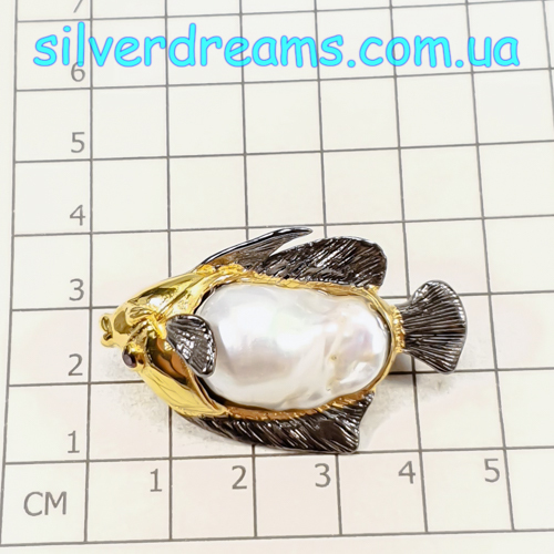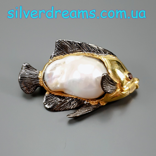 Уникальная брошь ручной работы в виде рыбы из серебра 925 пробы с двухцветным покрытием (чёрный родий + лимонное золото), инкрустирована крупной натуральной барочной жемчужиной и природным родолитом.