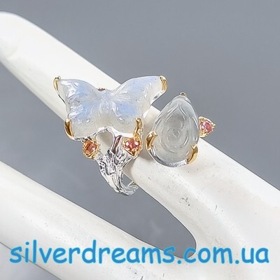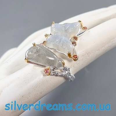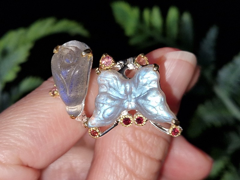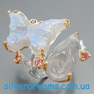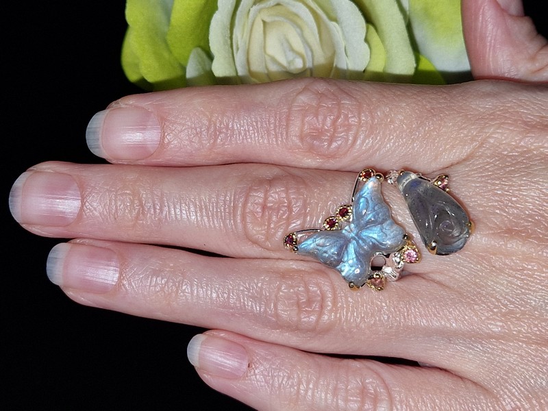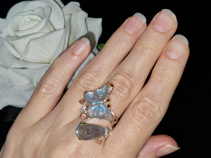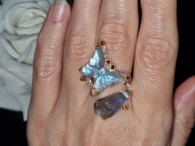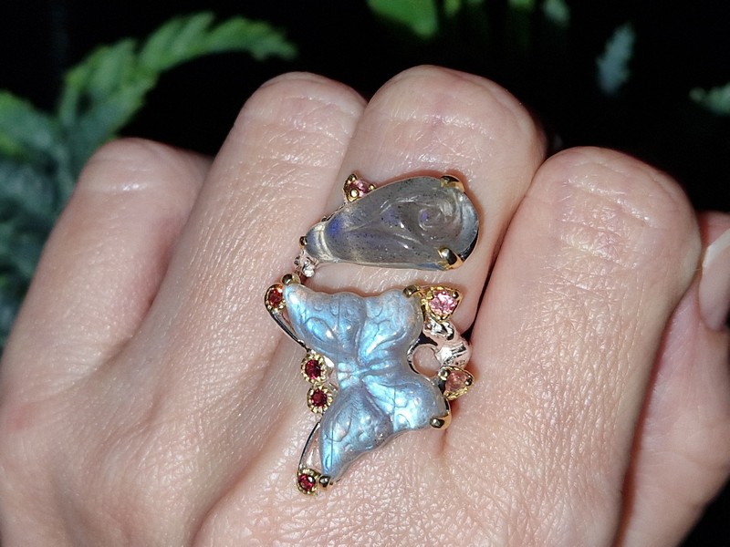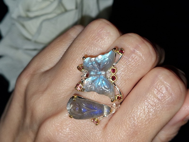 Уникальное кольцо ручной работы из серебра 925 пробы в двухцветной позолоте (белое + лимонное золото), инкрустировано крупными натуральными лабрадоритами и природными родолитами.
