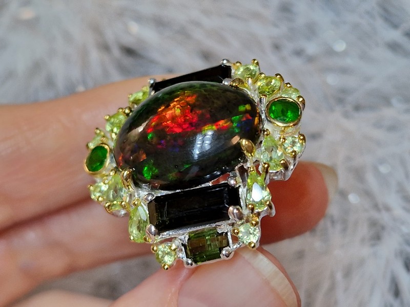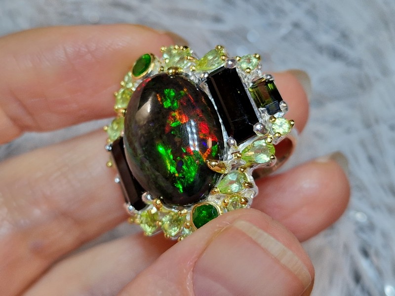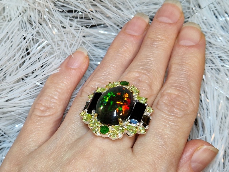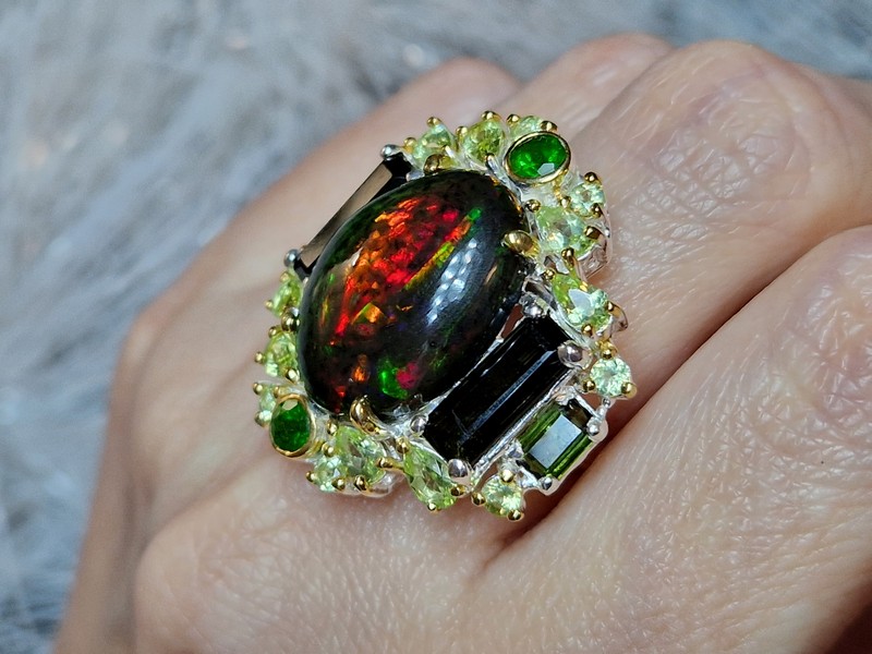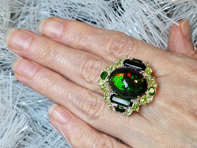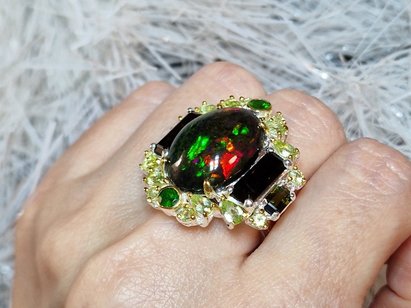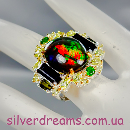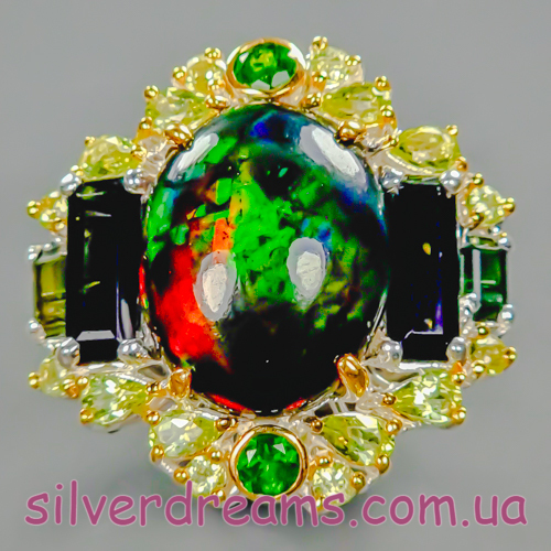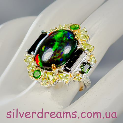 Уникальный перстень ручной работы из серебра 925 пробы в двухцветной позолоте (белое + лимонное золото), инкрустирован крупным натуральным радужным чёрным опалом, природными турмалинами, хромдиопсидами и хризолитами.
