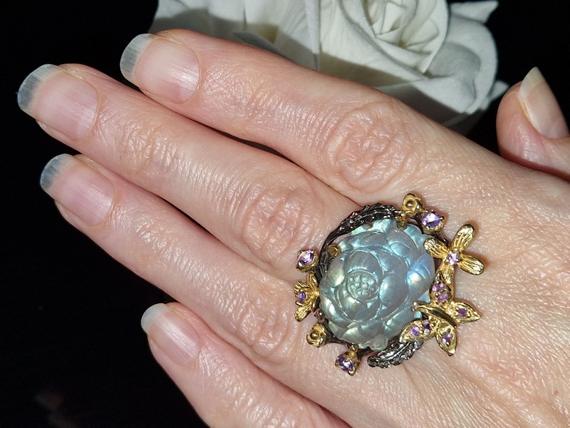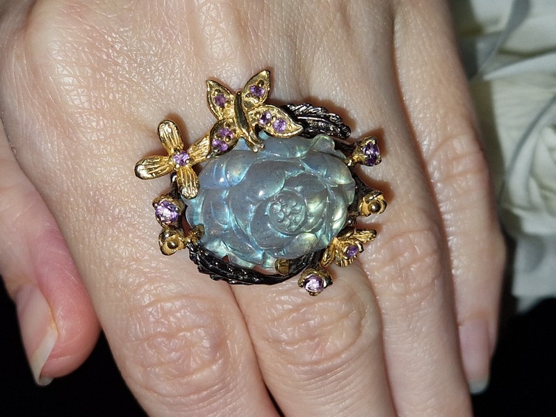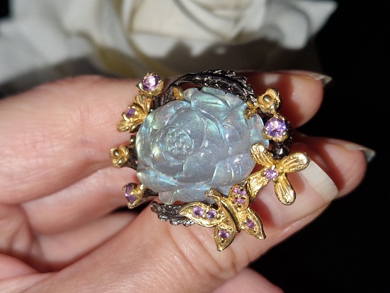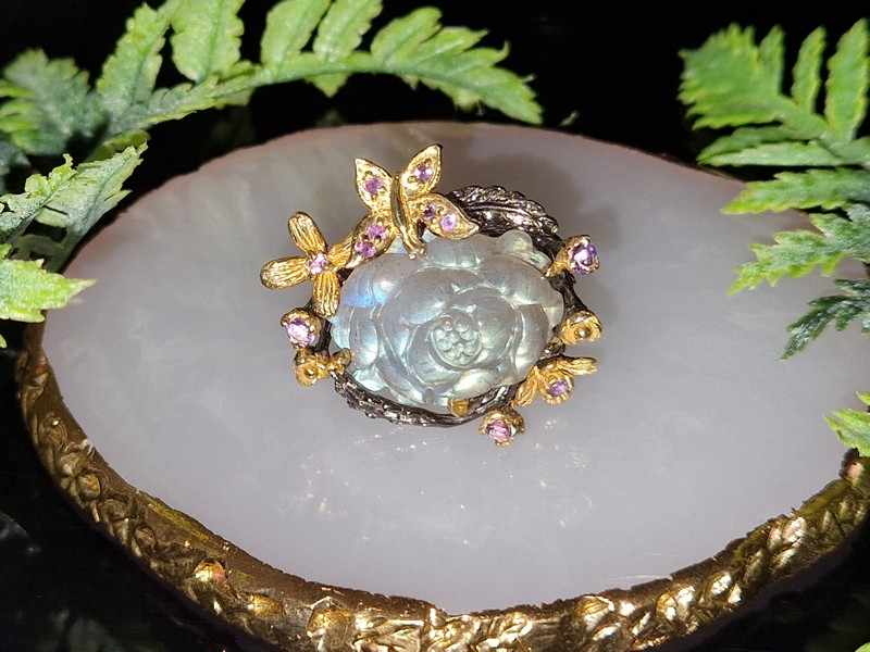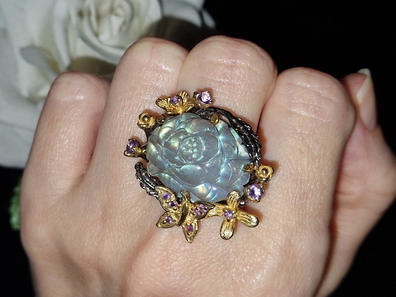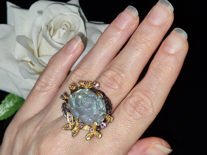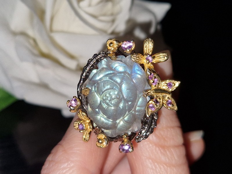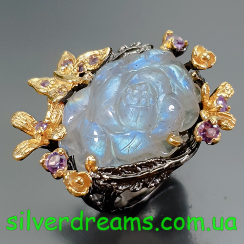 HANDMADE! Серебряное кольцо Цветок из 35-каратного резного лабрадора + аметист р.18,5