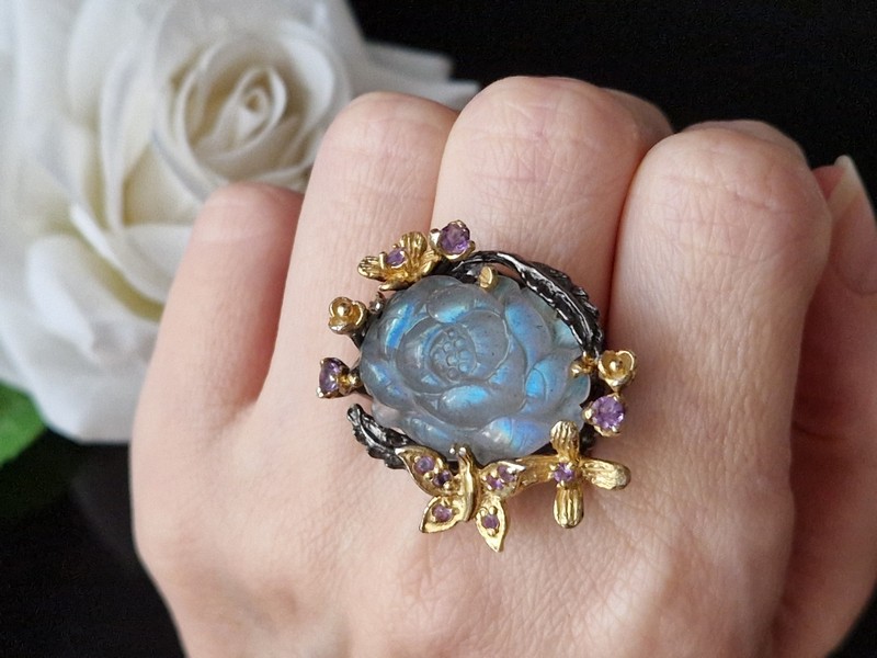 Дизайнерский перстень из серебра 925 пробы с двухцветным покрытием (чёрный родий + лимонное золото), инкрустирован крупным натуральным резным лабрадоритом и природными аметистами.