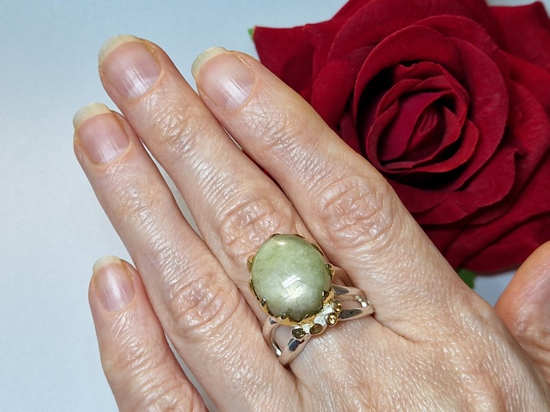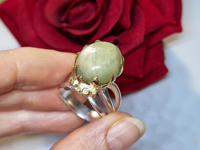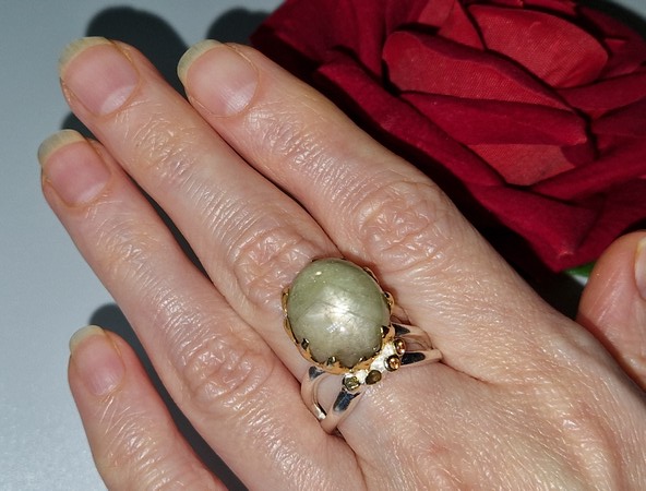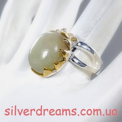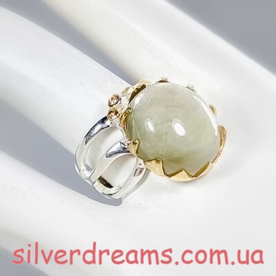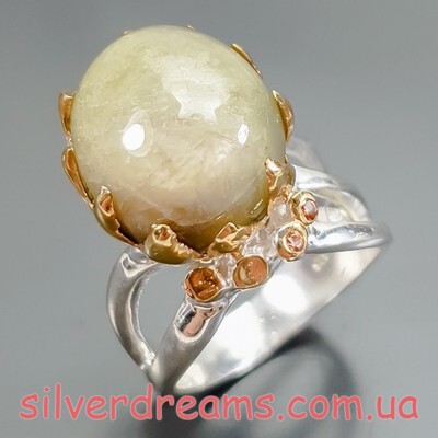 Уникальный перстень ручной работы из серебра 925 пробы в двухцветной позолоте (белое + лимонное золото), инкрустирован крупным натуральным жёлтым сапфиром с эффектом астеризма.
