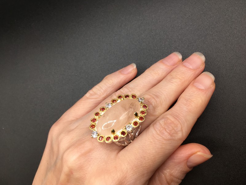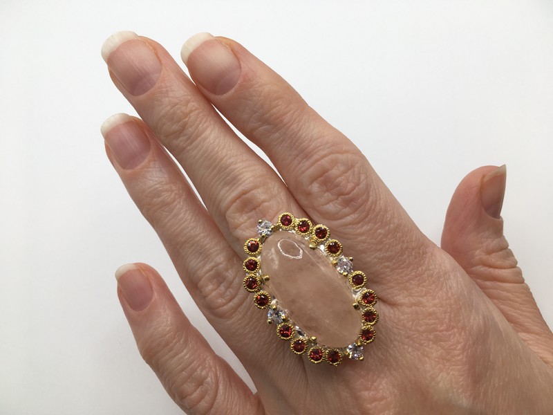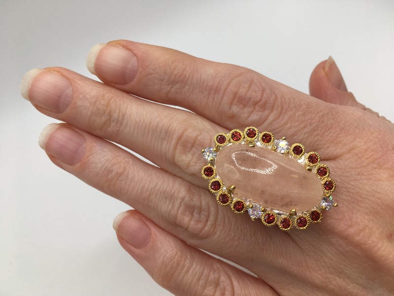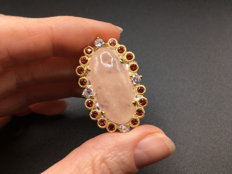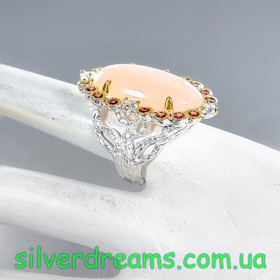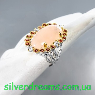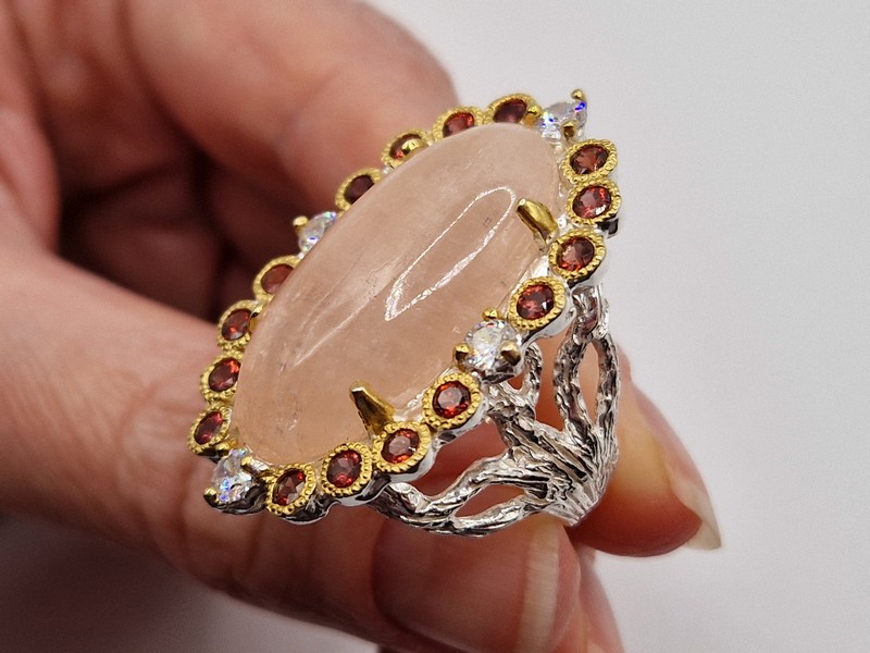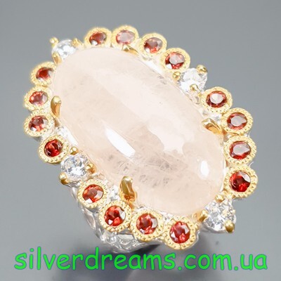 Уникальный перстень ручной работы из серебра 925 пробы в двухцветной позолоте (белое + лимонное золото), инкрустирован крупным натуральным морганитом в обрамлении природных красных гранатов.