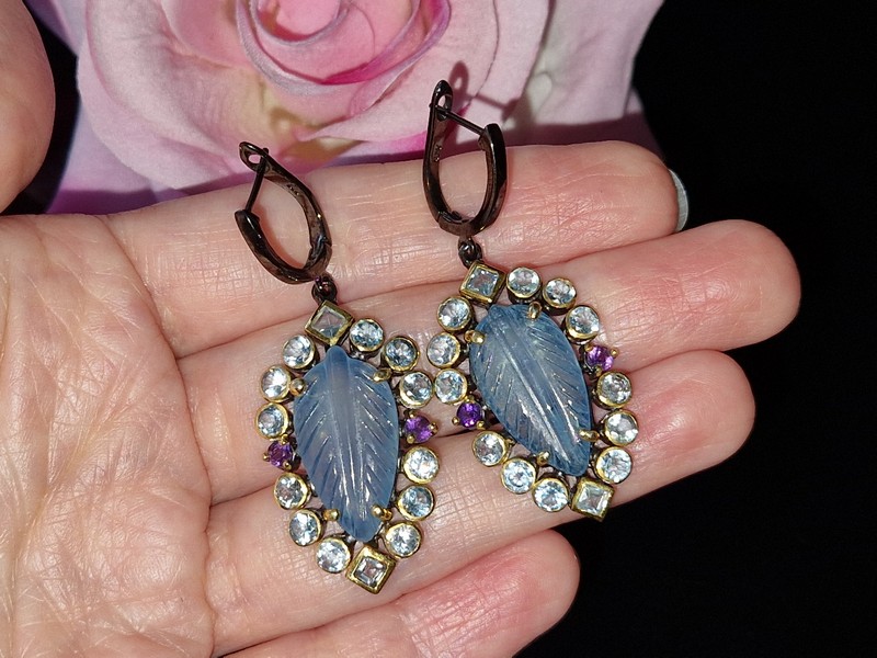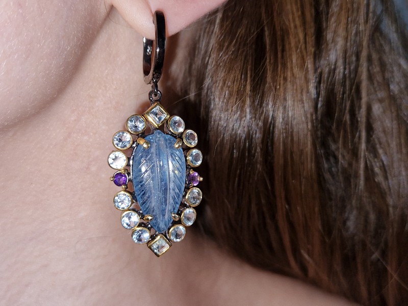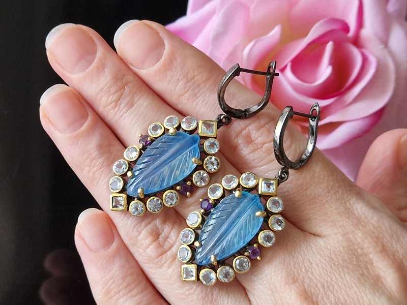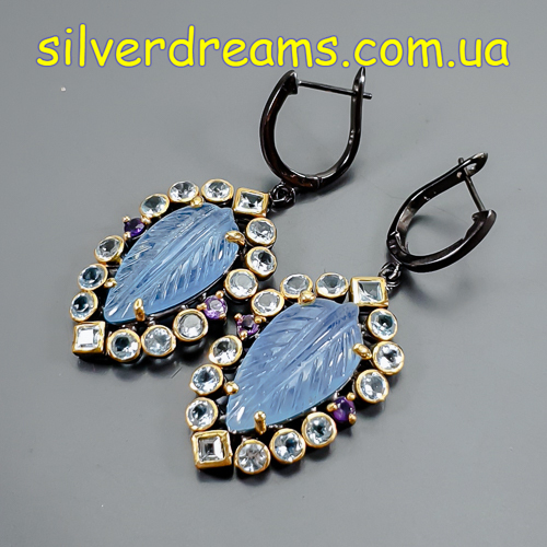 Дизайнерские серьги из серебра 925 пробы с двухцветным покрытием (чёрный родий + лимонное золото), инкрустированы крупным натуральным резным аквамарином в обрамлении природных топазов и аметистов, застёжка — английский замок.