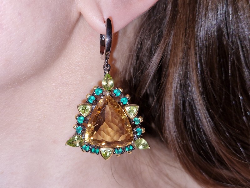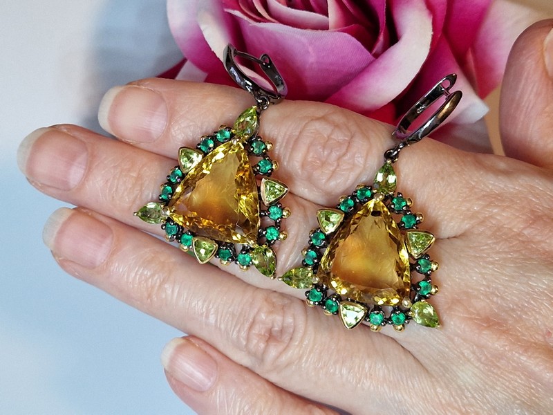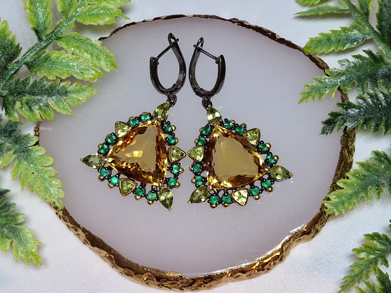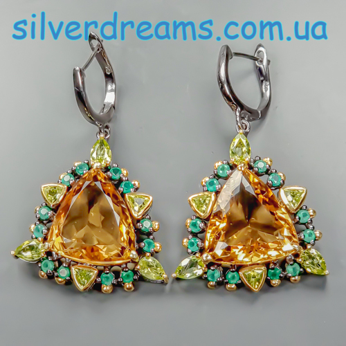 Уникальные серьги ручной работы из серебра 925 пробы с двухцветным покрытием (чёрный родий + лимонное золото), инкрустированы крупным натуральным цитрином, природными хризолитами и зелёным ониксом.
