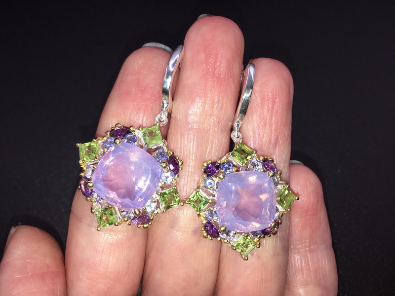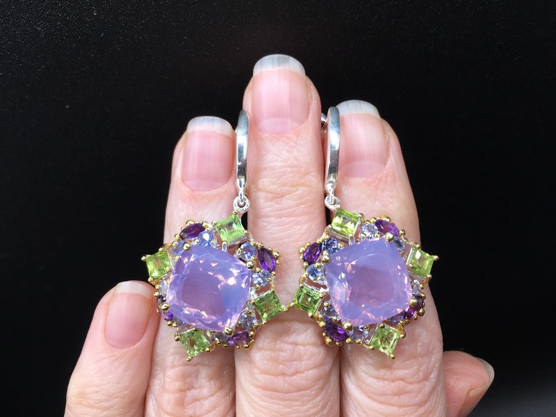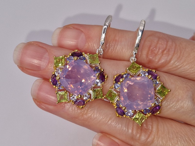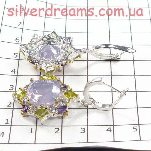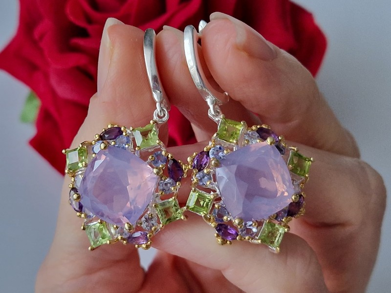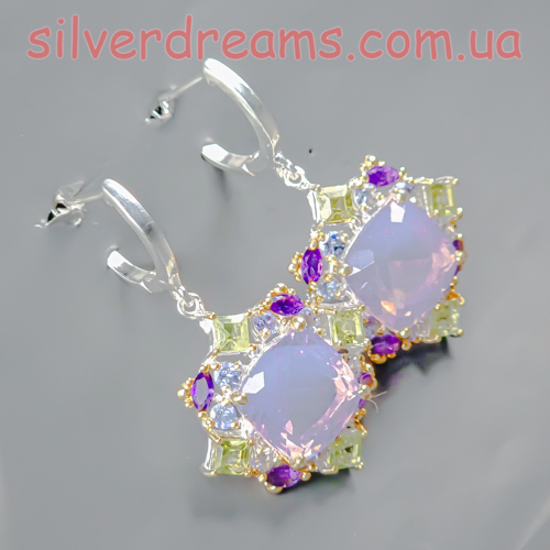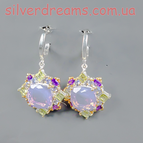 Уникальные серьги ручной работы из серебра 925 пробы в двухцветной позолоте (белое + лимонное золото), инкрустированы натуральным лавандовым кварцем, природными аметистами, хризолитами и танзанитами.