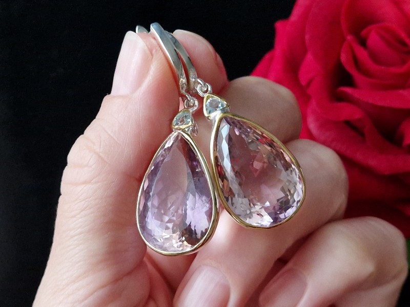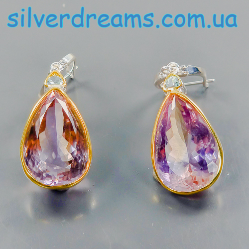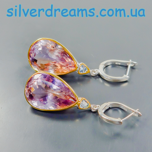 Уникальные серьги ручной работы из серебра 925 пробы в двухцветной позолоте (белое + лимонное золото), инкрустированы крупным натуральным аметрином и природным голубым топазом, застёжка — английский замок.