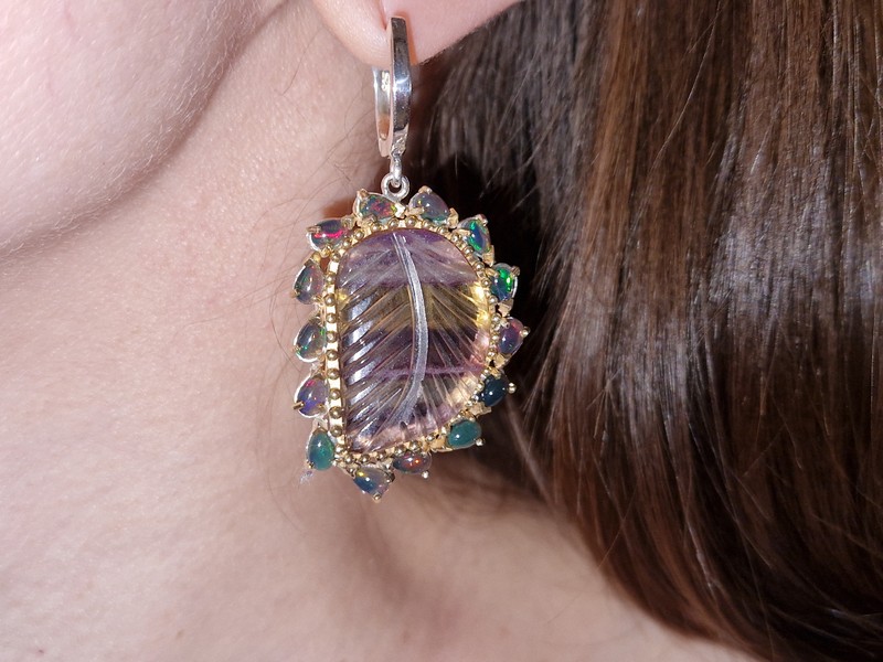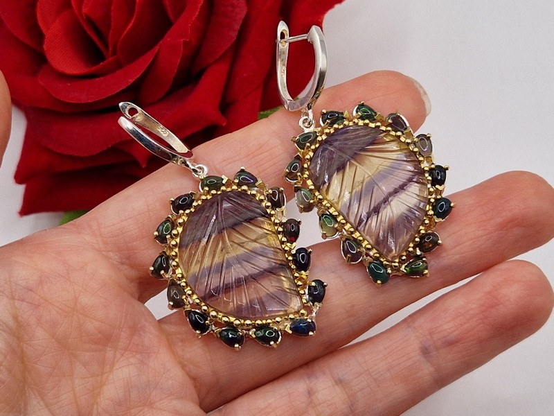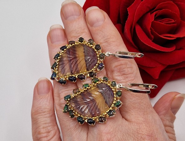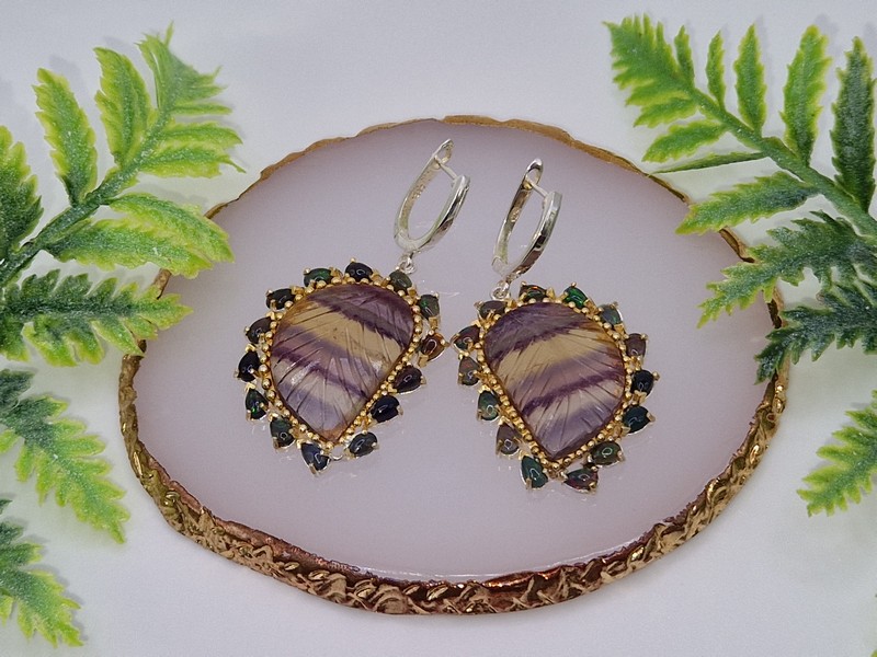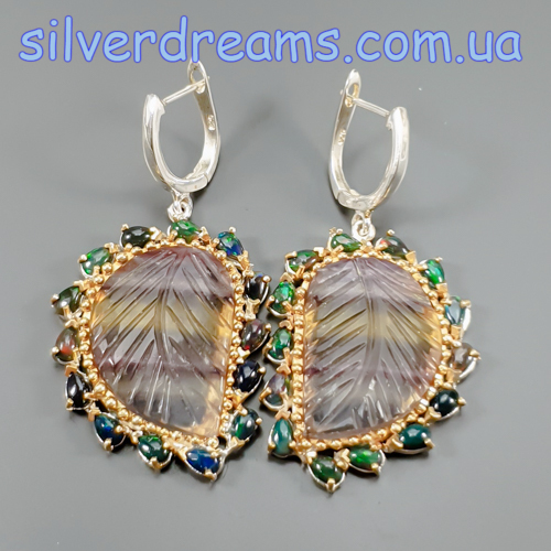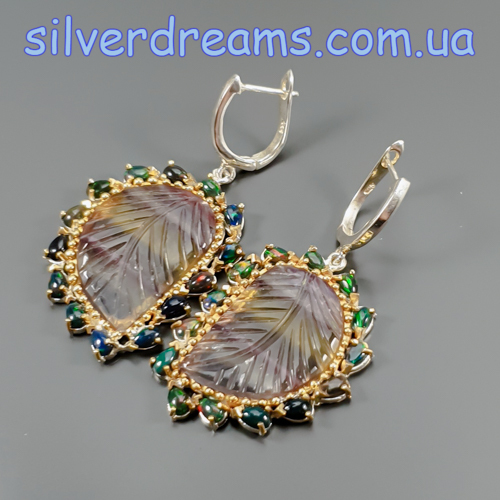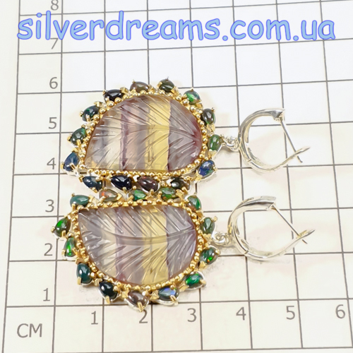 Уникальные серьги ручной работы из серебра 925 пробы в двухцветной позолоте (белое + лимонное золото), инкрустированы крупным натуральным трёхцветным флюоритом в обрамлении природных радужных чёрных опалов, застёжка — английский замок.