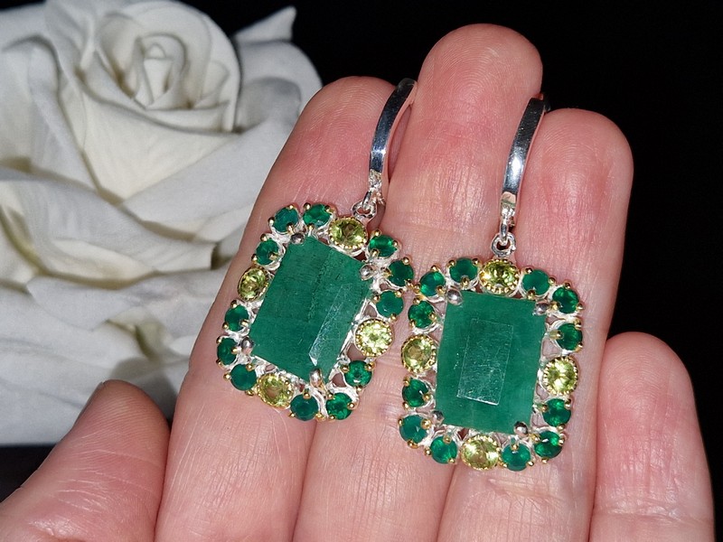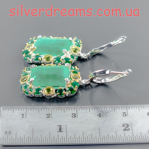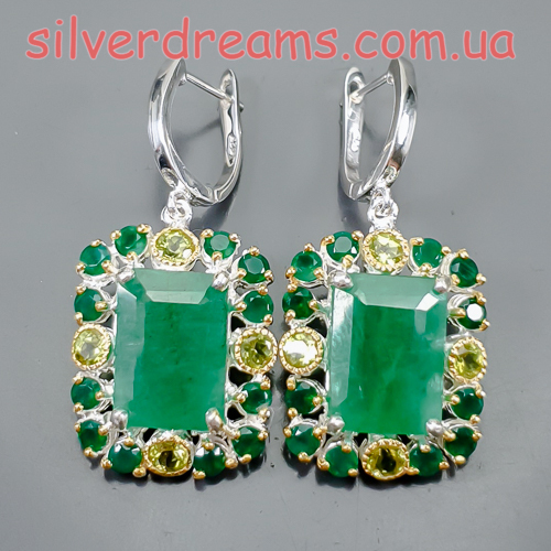 Уникальные серьги ручной работы из серебра 925 пробы в двухцветной позолоте (белое + лимонное золото), инкрустированы крупным натуральным зелёным бериллом, природным ониксом и хризолитами.