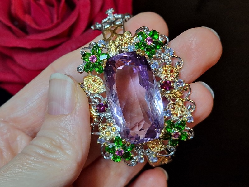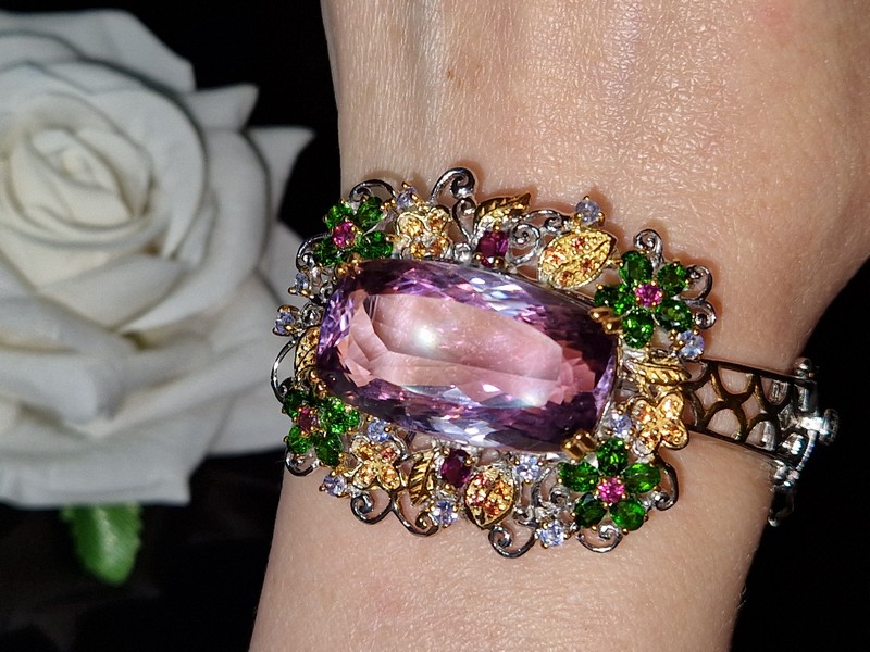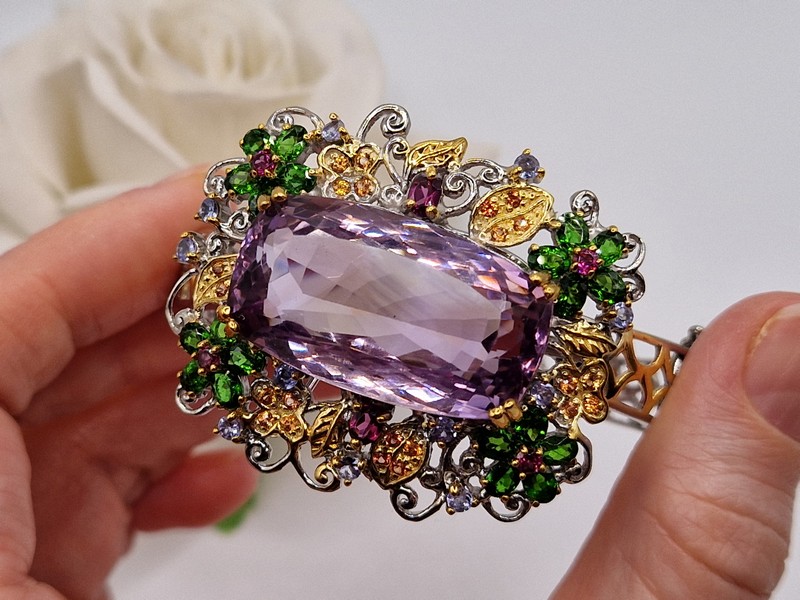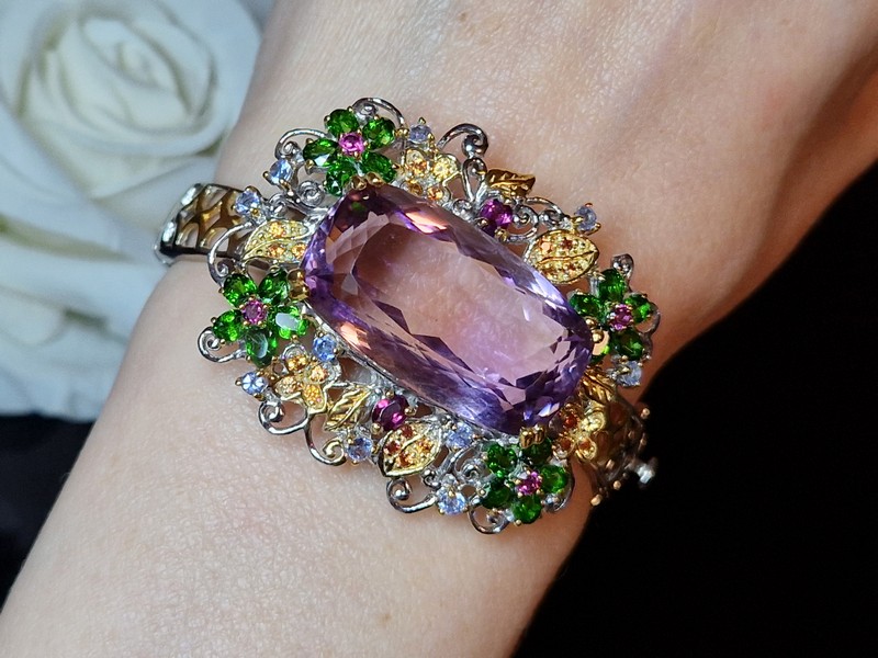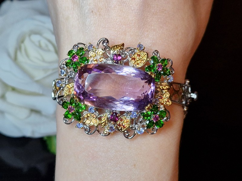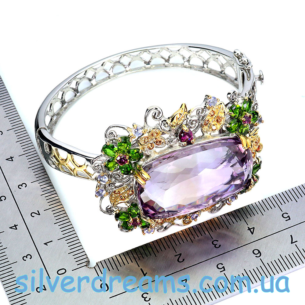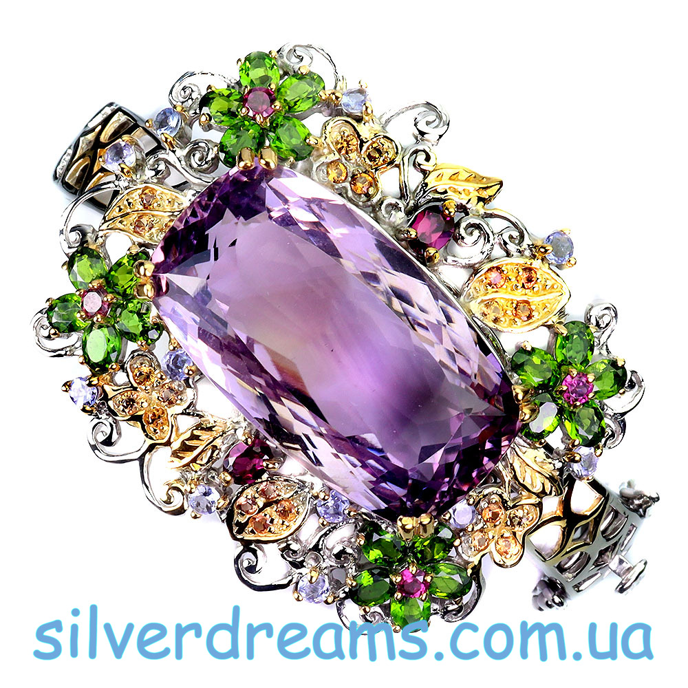 Уникальный жёсткий браслет ручной работы из серебра 925 пробы в двухцветной позолоте (белое + лимонное золото), инкрустирован крупным натуральным аметрином в обрамлении природных самоцветов (хромдиопсид, родолит, сапфир, танзанит).
