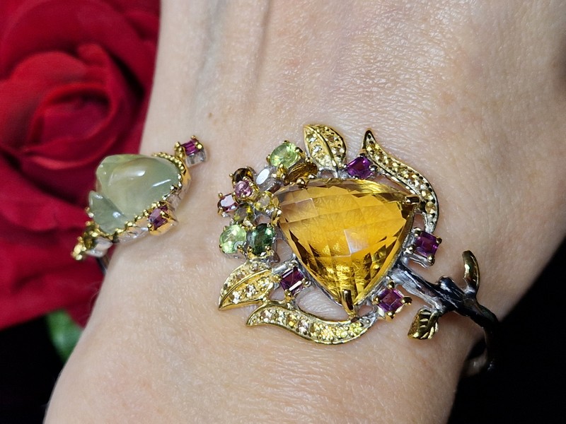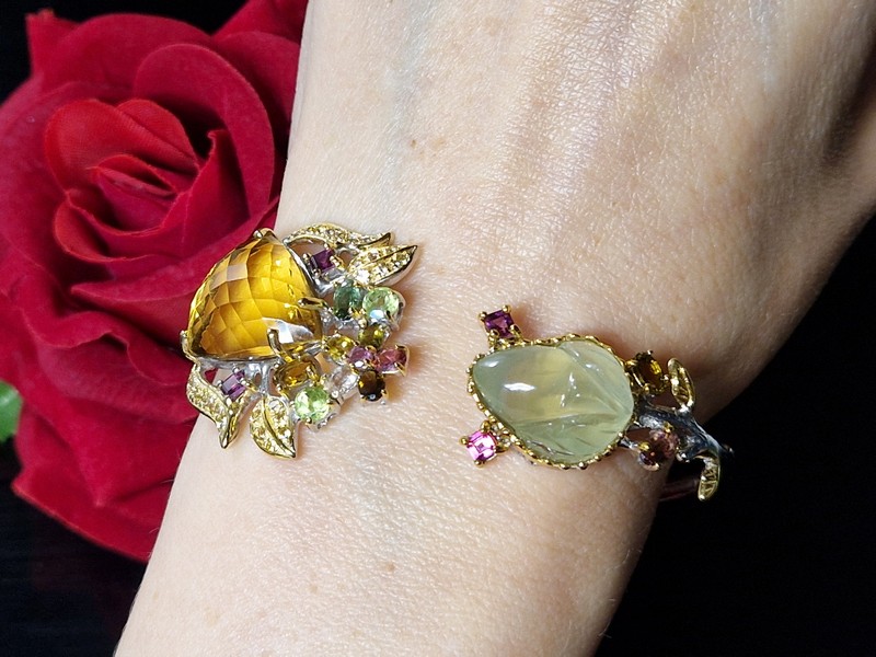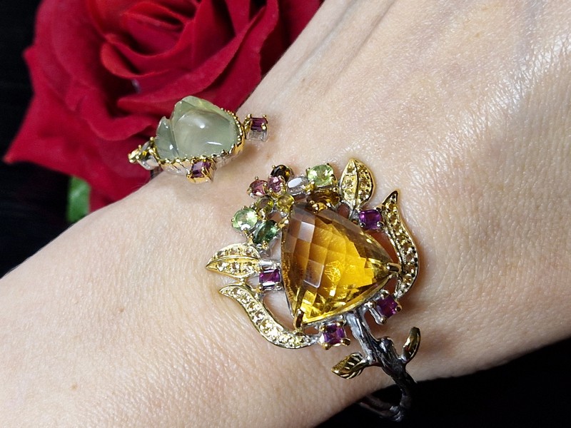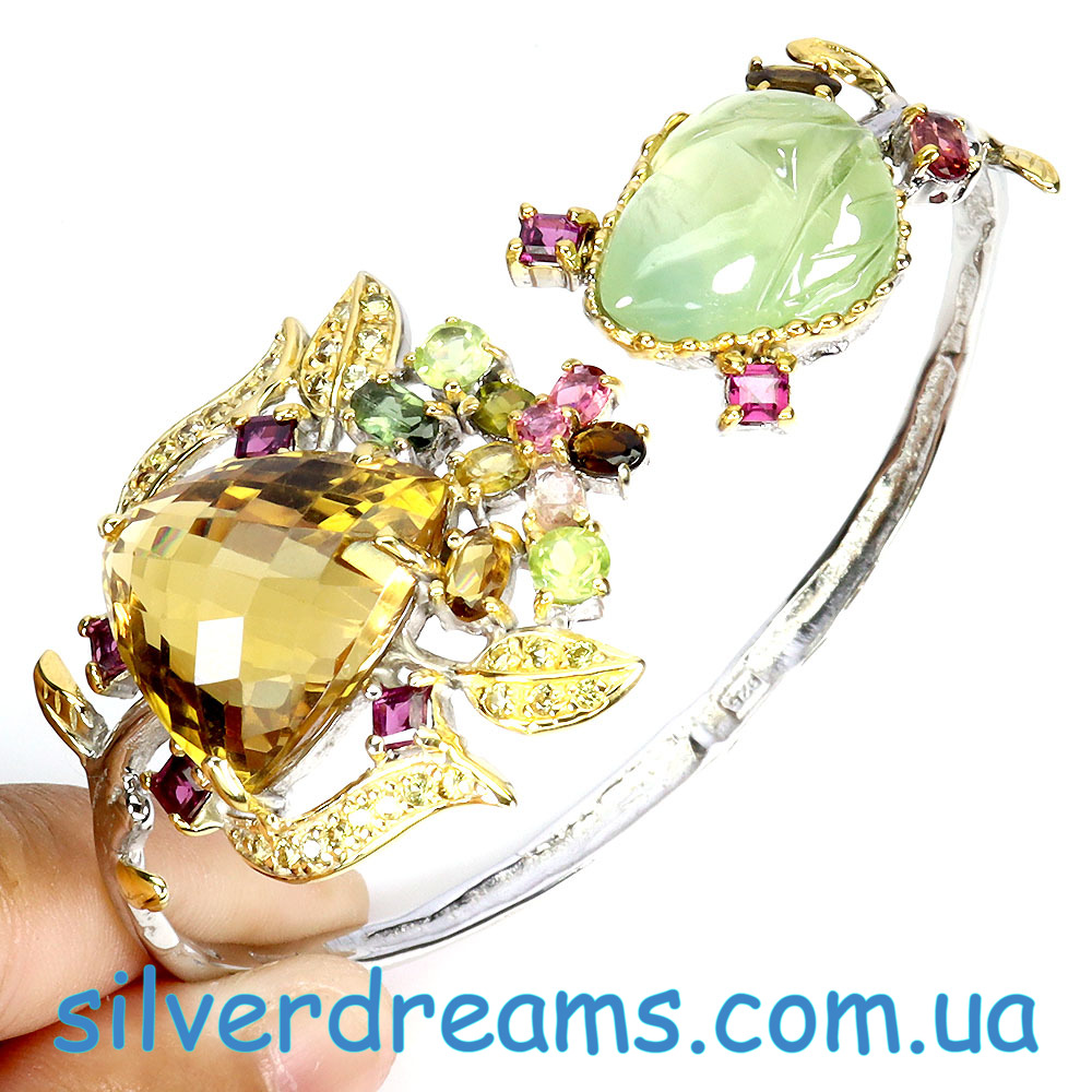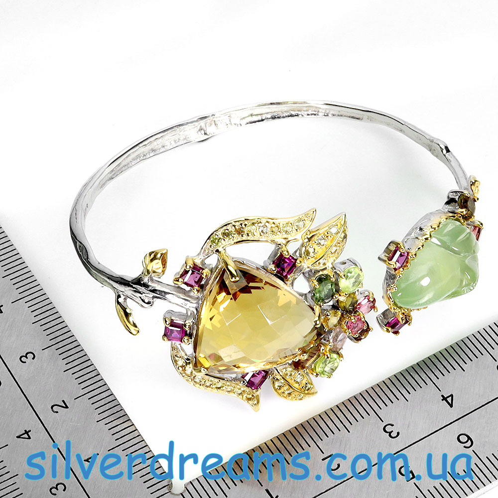 Уникальный манжетный браслет ручной работы из серебра 925 пробы в двухцветной позолоте (белое + лимонное золото), инкрустирован крупным натуральным цитрином, резным пренитом, природными турмалинами, родолитами и хризолитами.