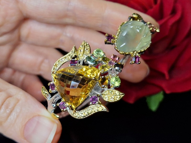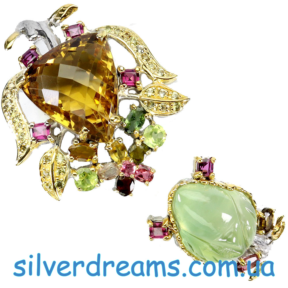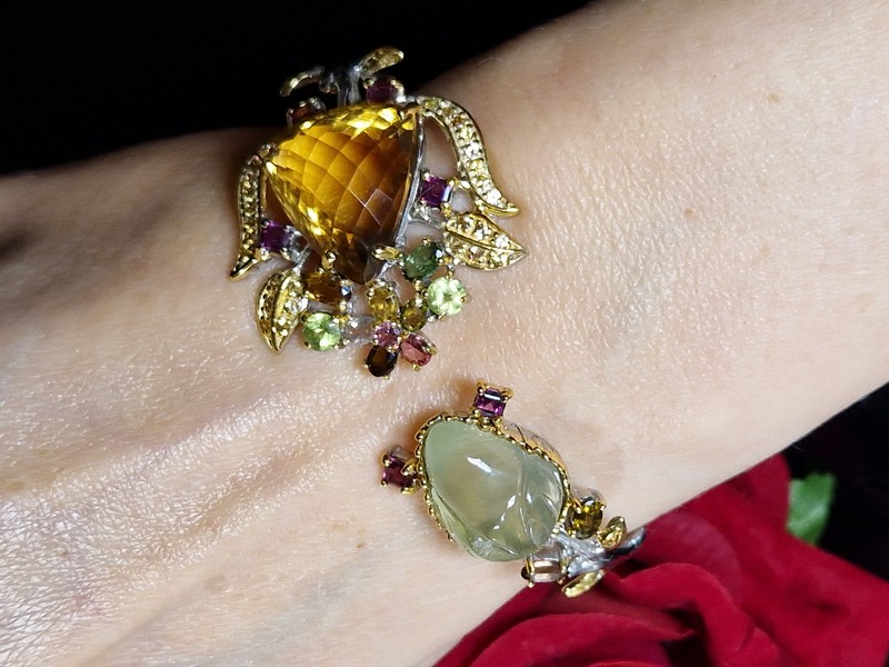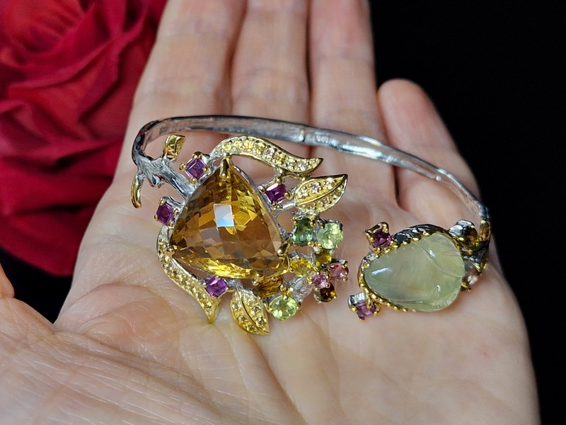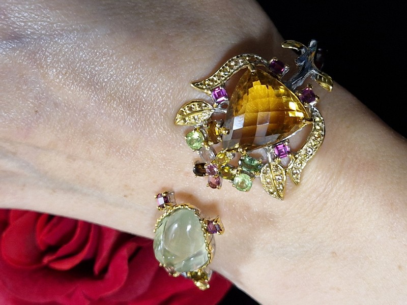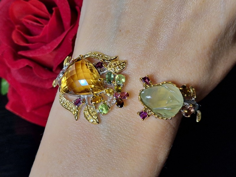 Уникальный манжетный браслет ручной работы из серебра 925 пробы в двухцветной позолоте (белое + лимонное золото), инкрустирован крупным натуральным цитрином, резным пренитом, природными турмалинами, родолитами и хризолитами.