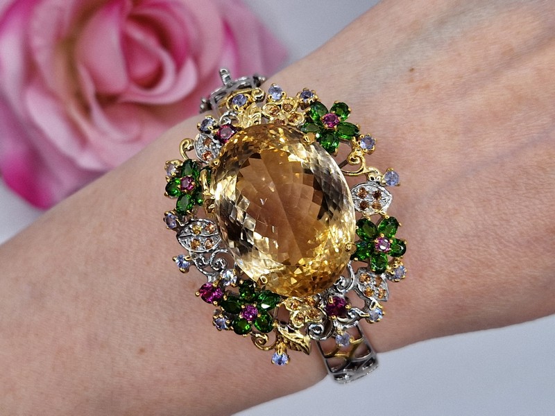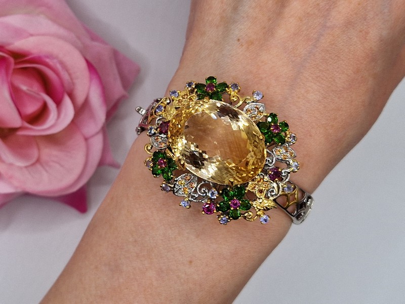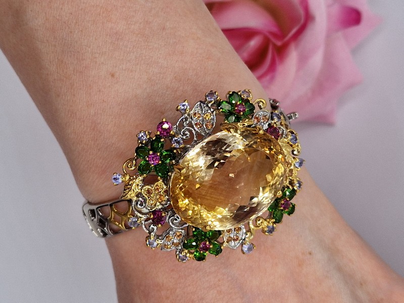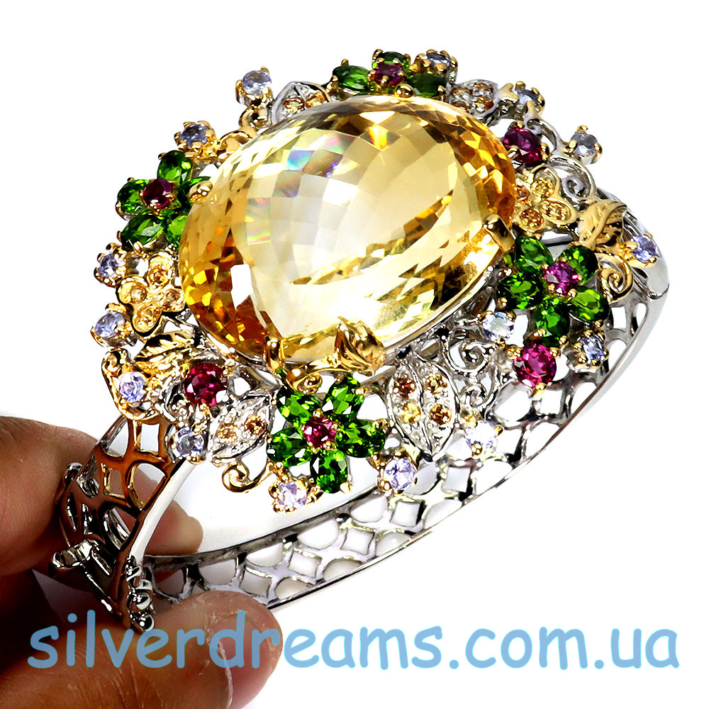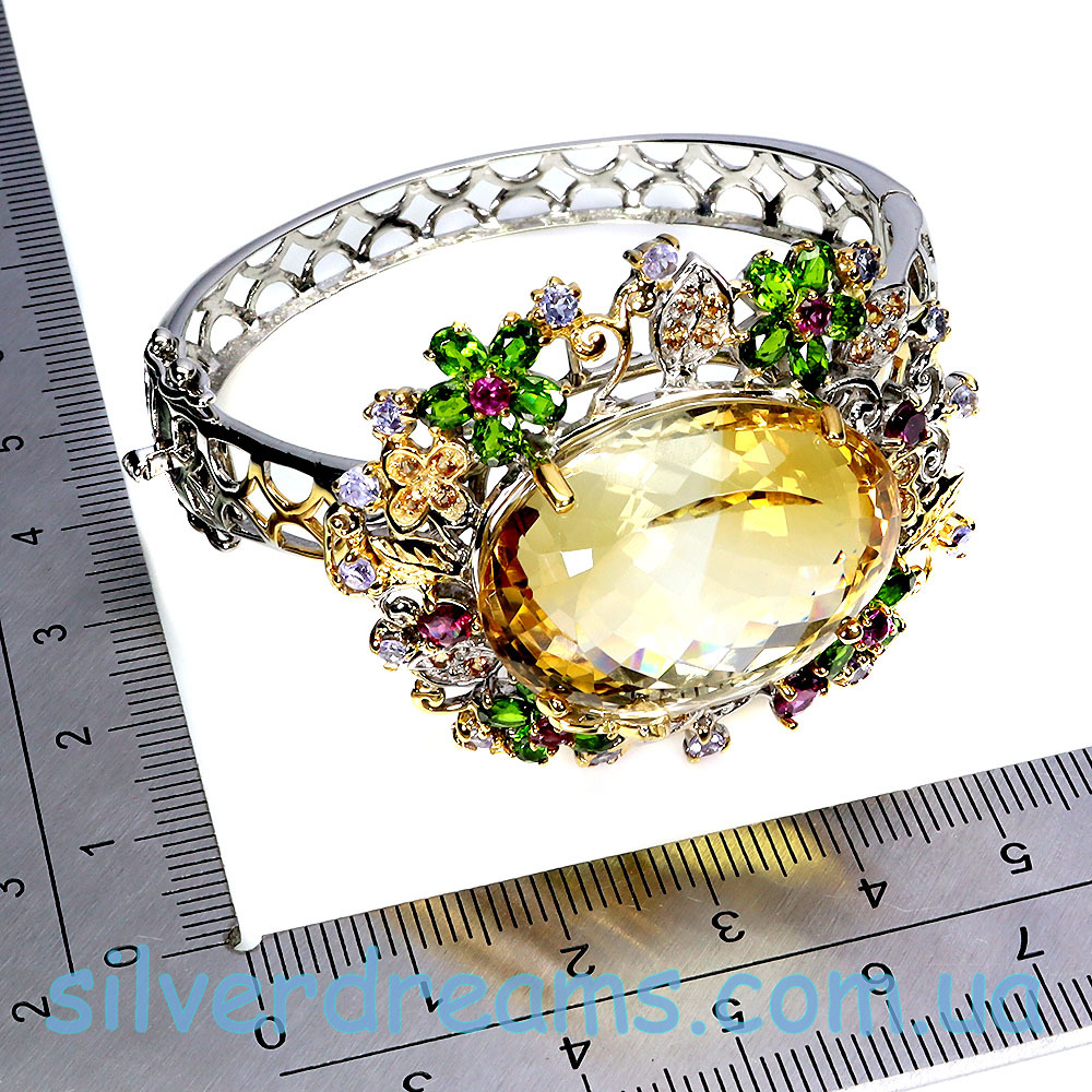 Уникальный жёсткий браслет ручной работы из серебра 925 пробы в двухцветной позолоте (белое + лимонное золото), инкрустирован крупным натуральным цитрином, природными хромдиопсидами, родолитами, сапфирами и танзанитами.