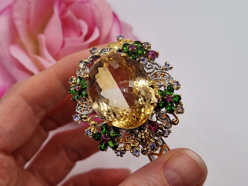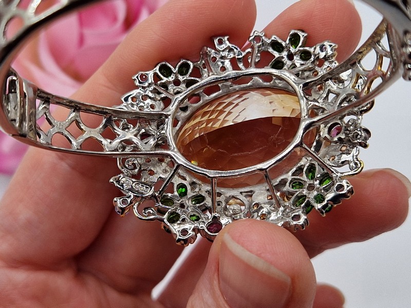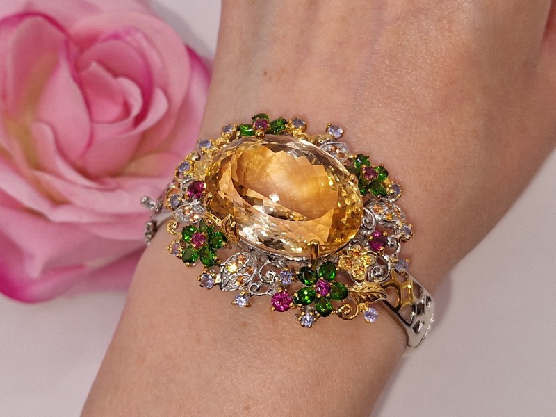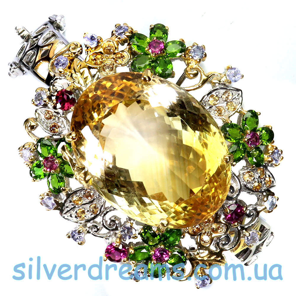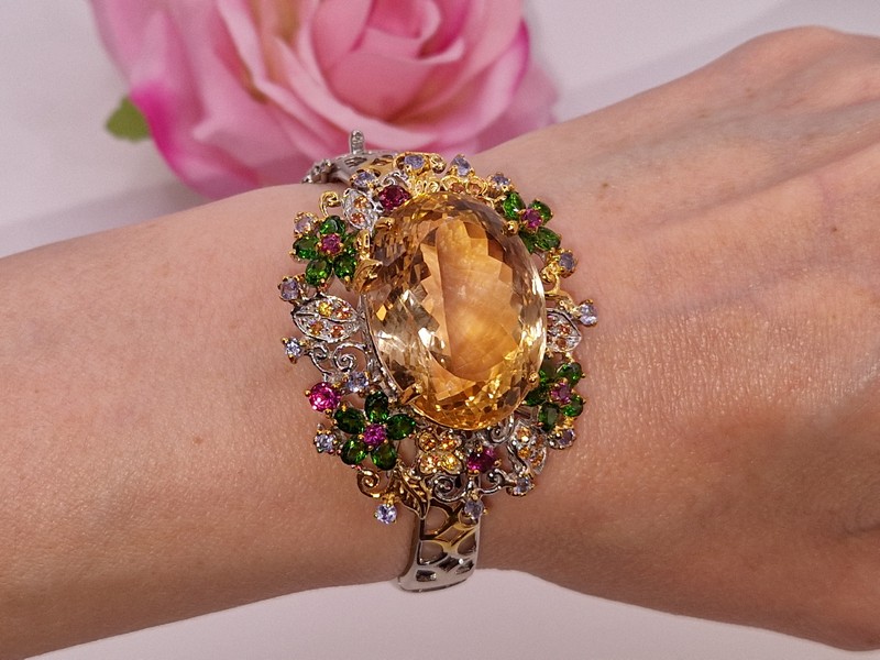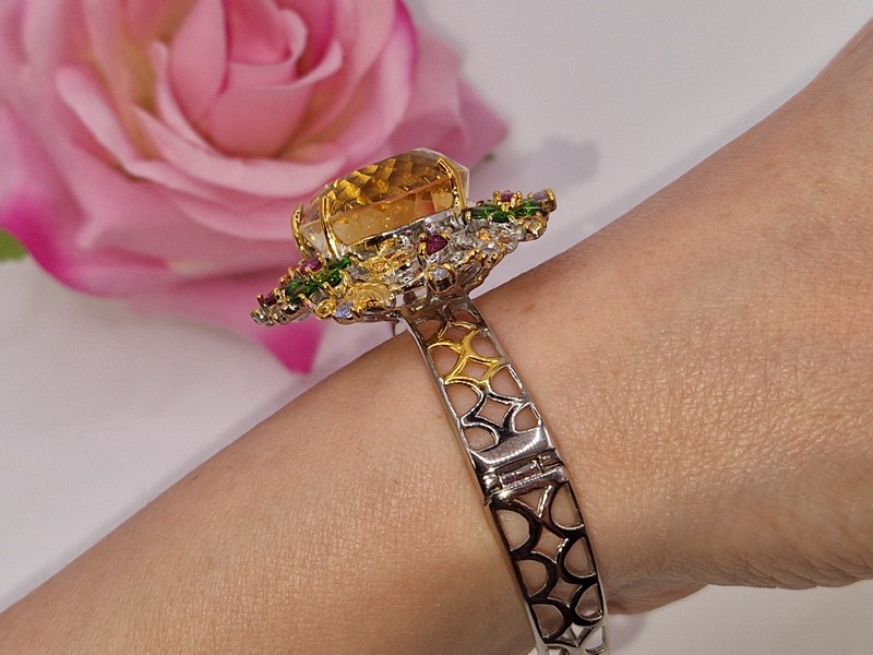 Уникальный жёсткий браслет ручной работы из серебра 925 пробы в двухцветной позолоте (белое + лимонное золото), инкрустирован крупным натуральным цитрином, природными хромдиопсидами, родолитами, сапфирами и танзанитами.