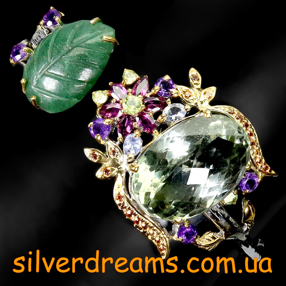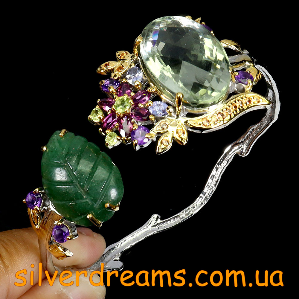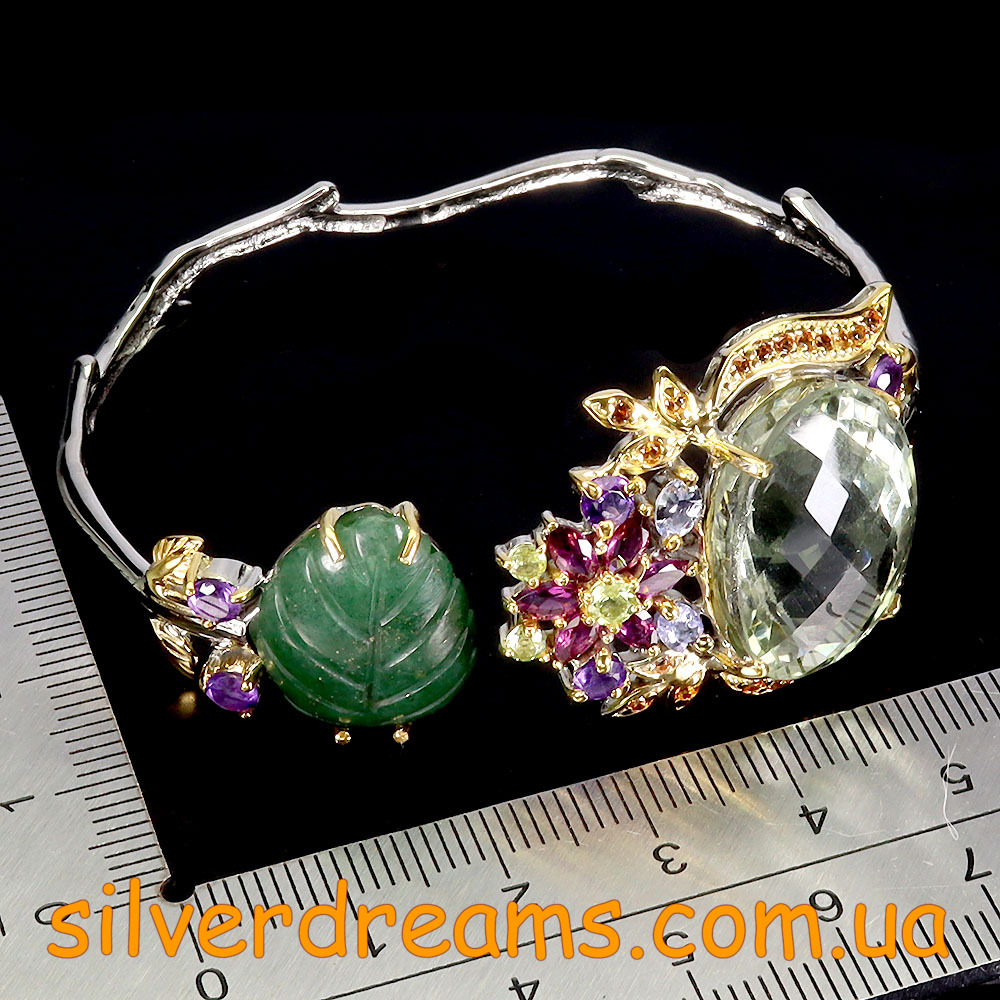 Уникальный манжетный браслет ручной работы из серебра 925 пробы в двухцветной позолоте (белое + лимонное золото), инкрустирован крупным натуральным празиолитом (зелёный аметист), резным авантюрином, природными аметистами, аквамаринами, родолитами, сапфирами и танзанитами.