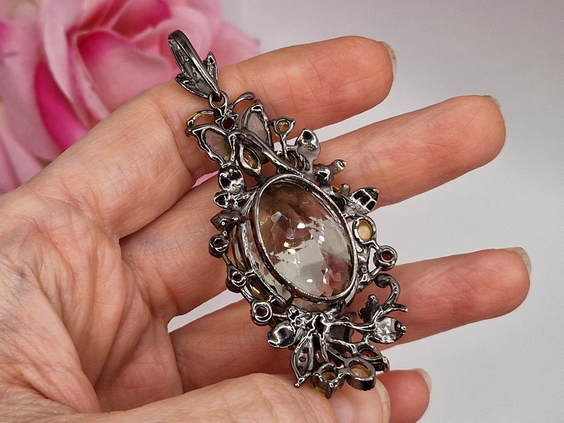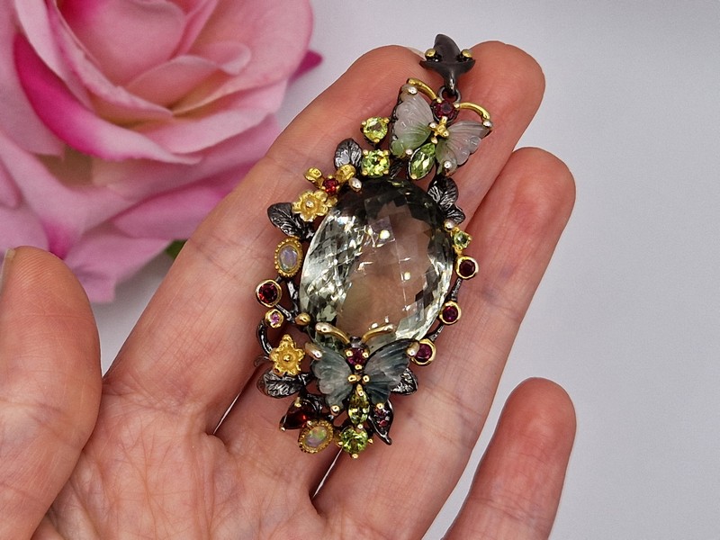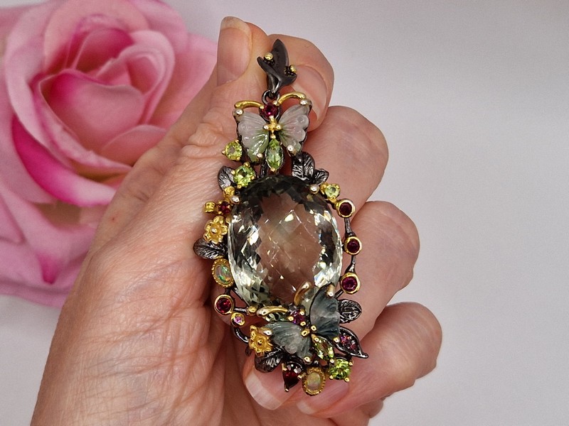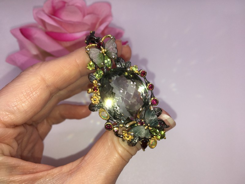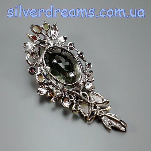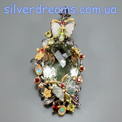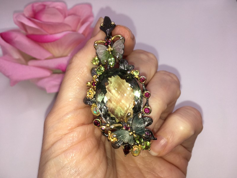 Уникальный подвес ручной работы из серебра 925 пробы с двухцветным покрытием (чёрный родий + лимонное золото), инкрустирован крупным натуральным празиолитом (зелёный аметист), природными турмалинами, опалами и хризолитами.