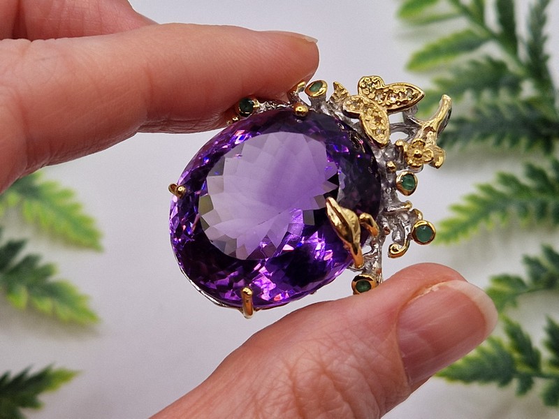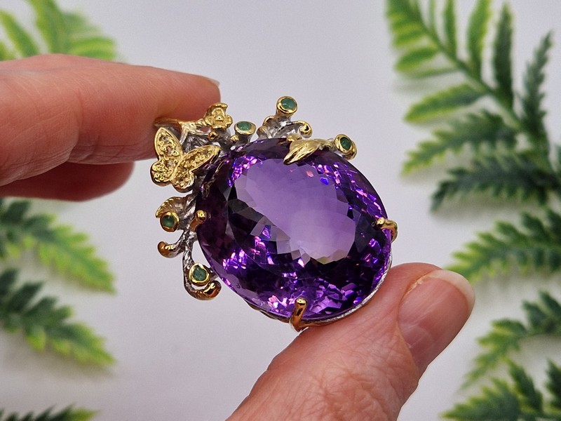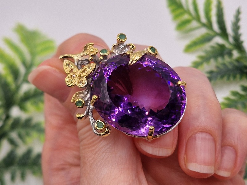 HANDMADE! Серебряный кулон с 67-каратным уругвайским аметистом и изумрудами