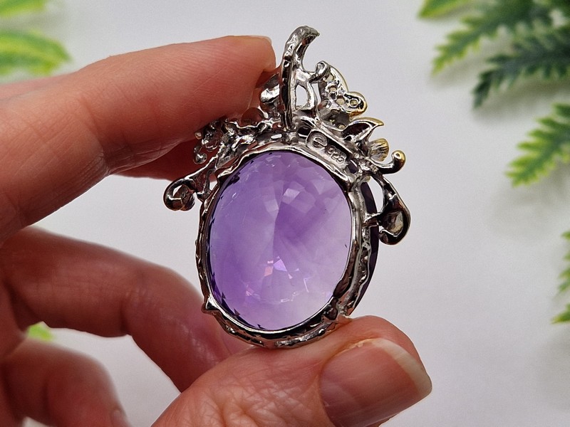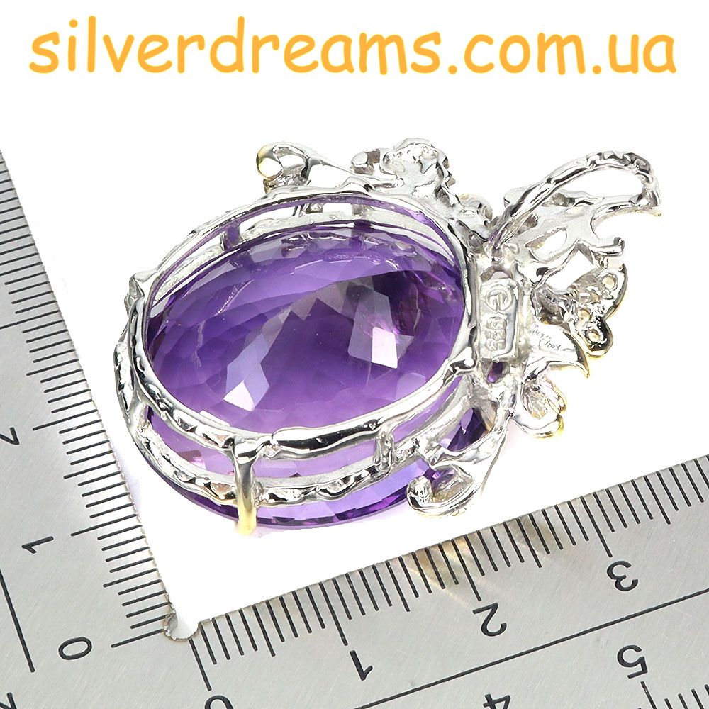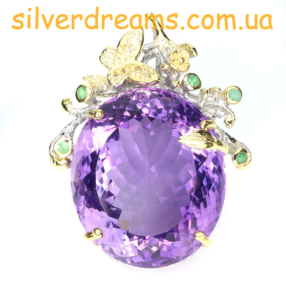Дизайнерский подвес из серебра 925 пробы в двухцветной позолоте (белое + лимонное золото), инкрустирован крупным натуральным аметистом, природными изумрудами и шампань-сапфирами.