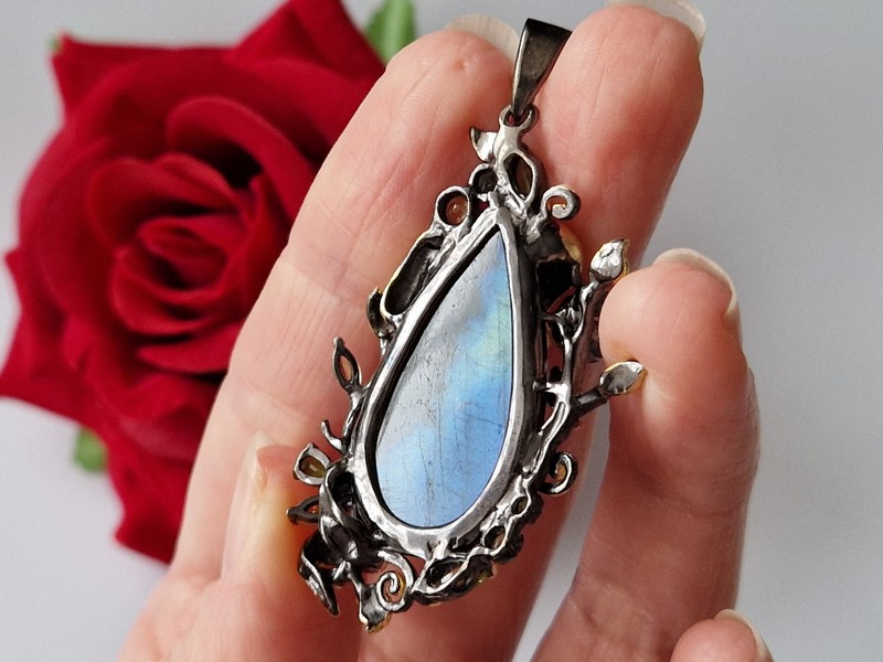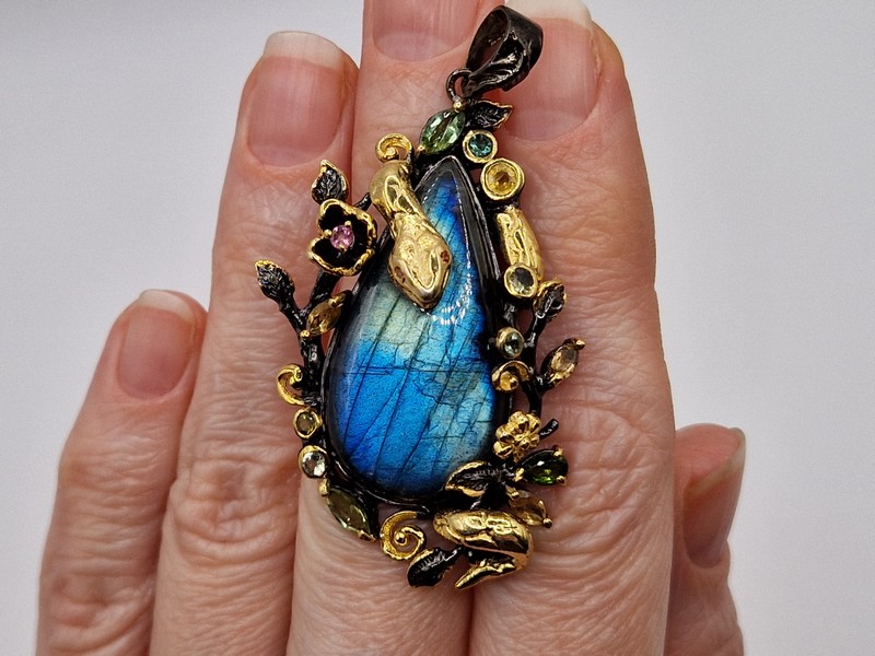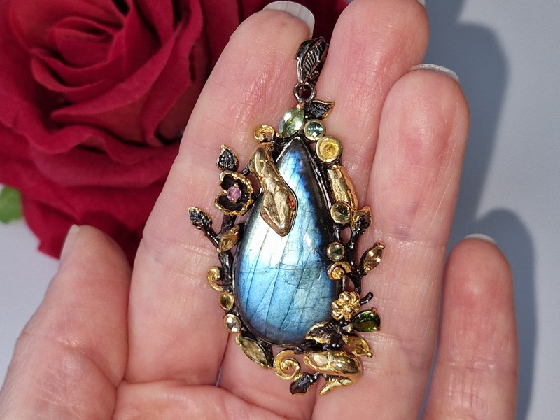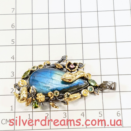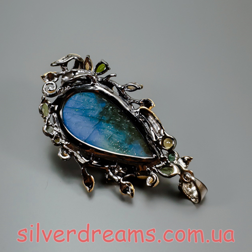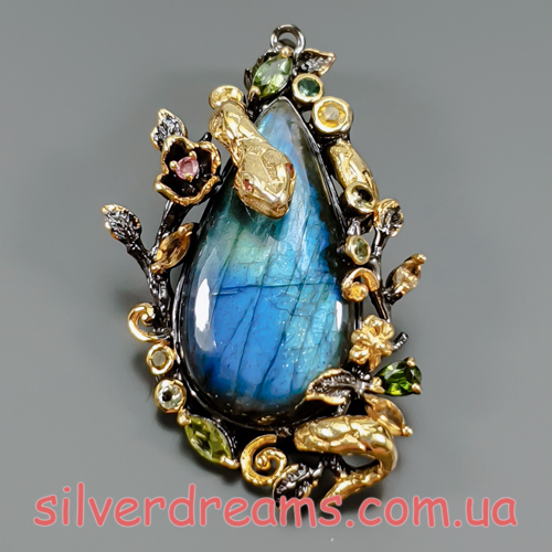 Дизайнерский подвес из серебра 925 пробы с двухцветным покрытием (чёрный родий + лимонное золото), инкрустирован крупным натуральным лабрадоритом, природными диопсидами, цитринами и хризолитами.
