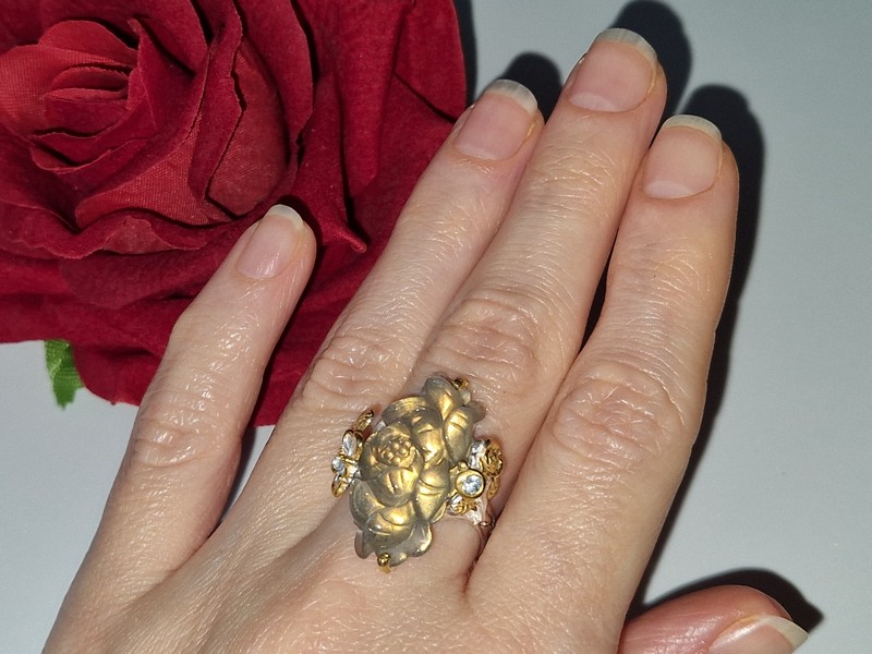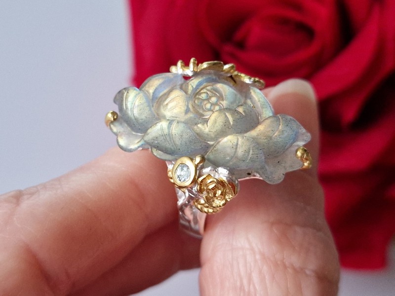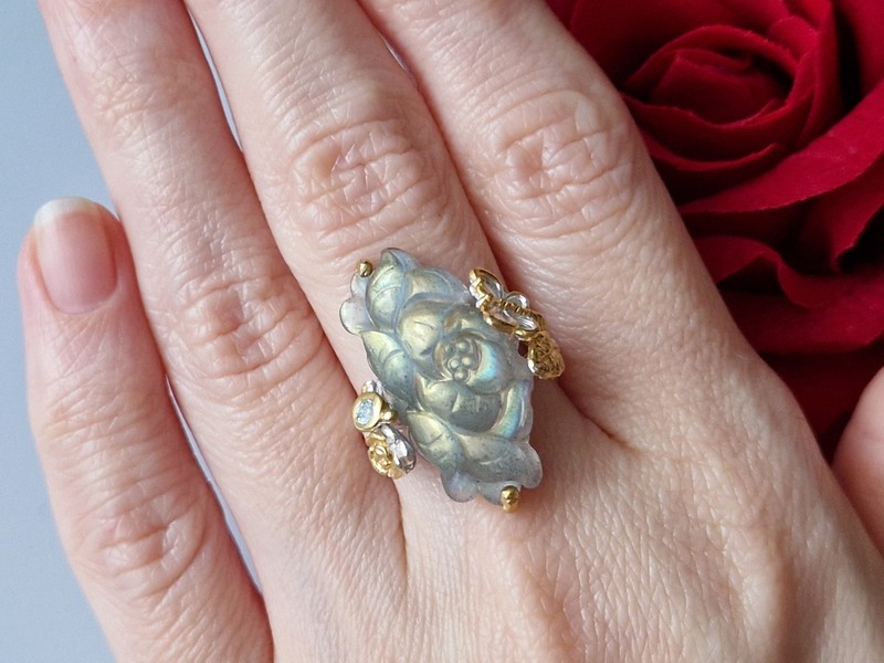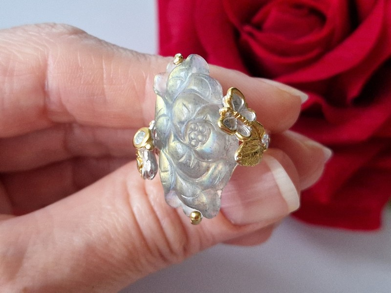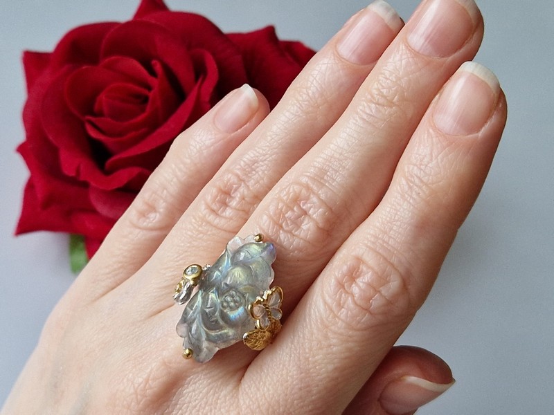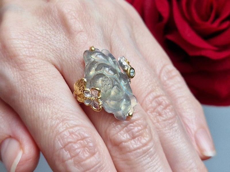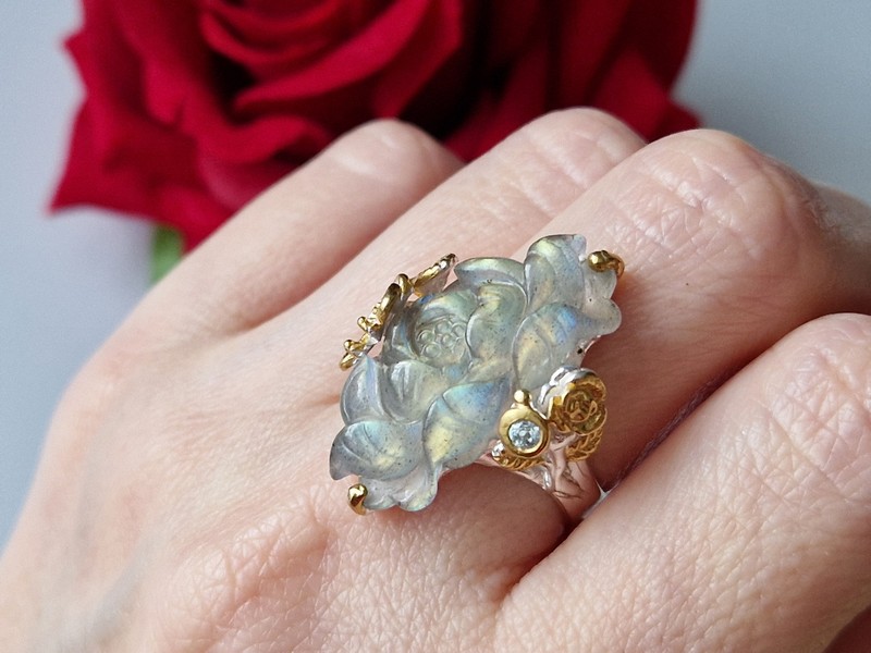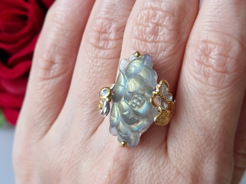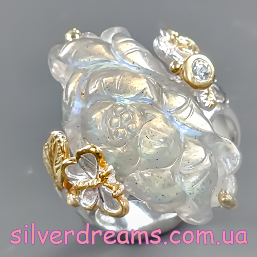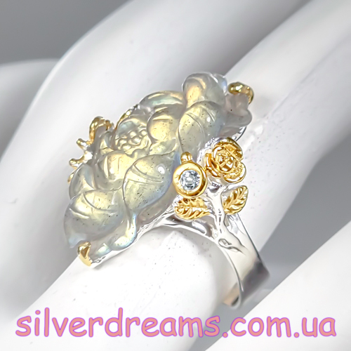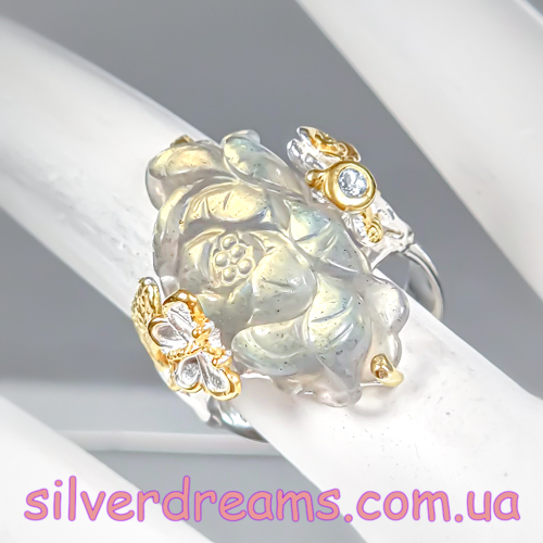 Уникальное кольцо ручной работы из серебра 925 пробы в двухцветной позолоте (белое + лимонное золото), инкрустировано крупным натуральным лабрадоритом и природными топазами.