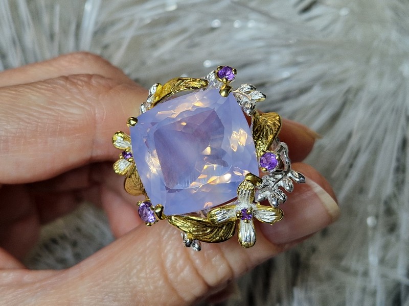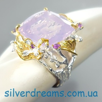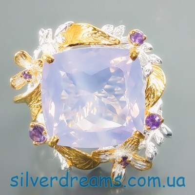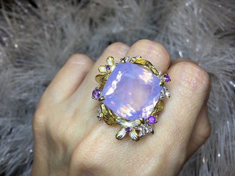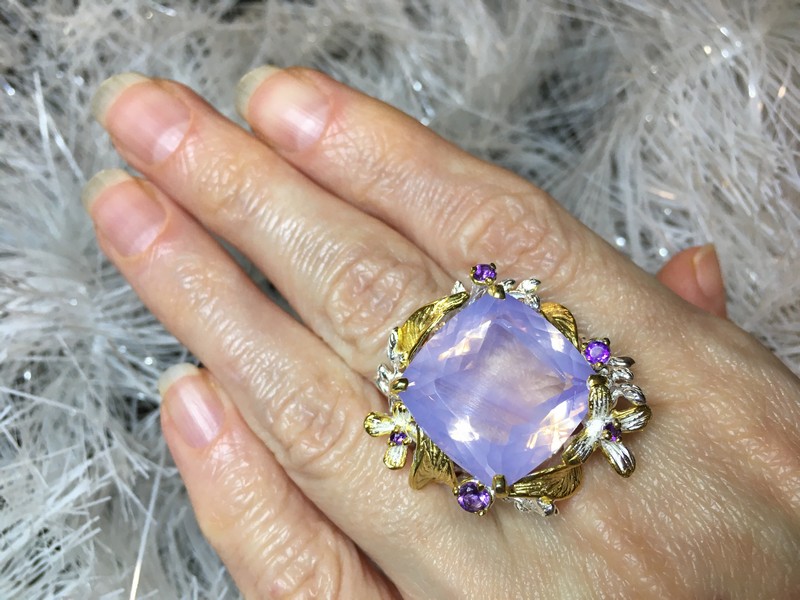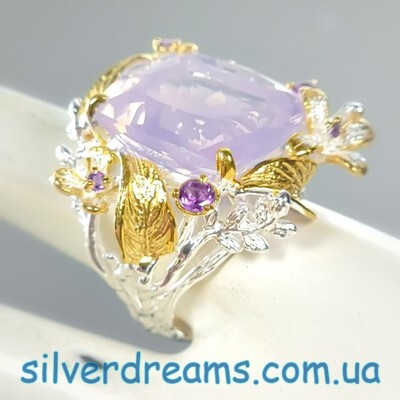 Уникальное кольцо ручной работы из серебра 925 пробы в двухцветной позолоте (белое + лимонное золото) с крупным натуральным лавандовым кварцем и природными аметистами.