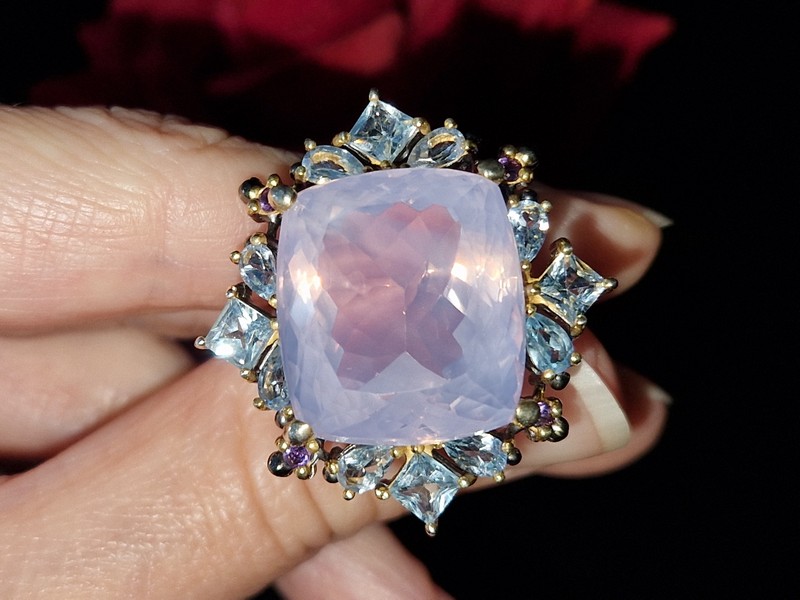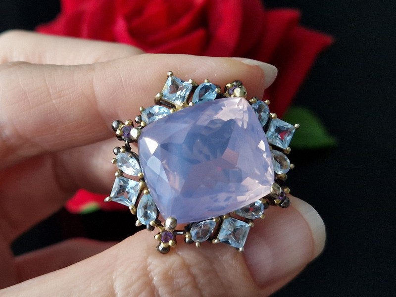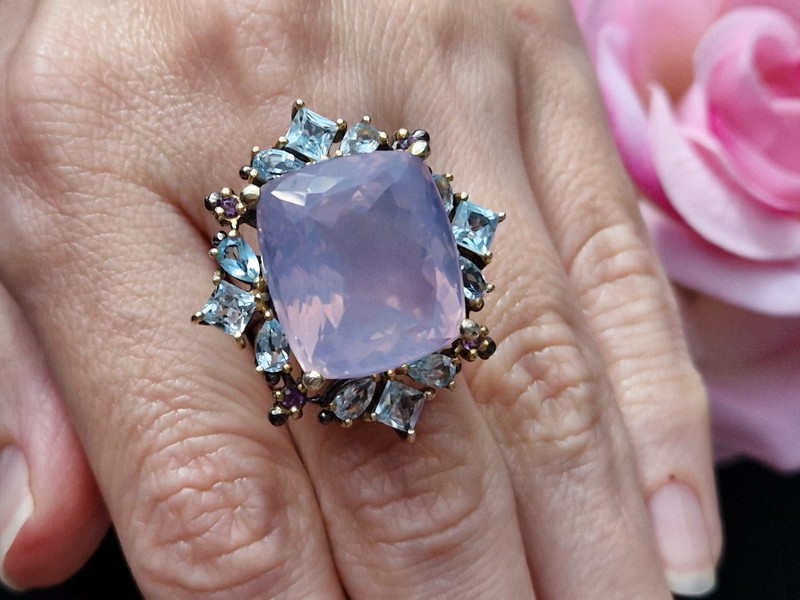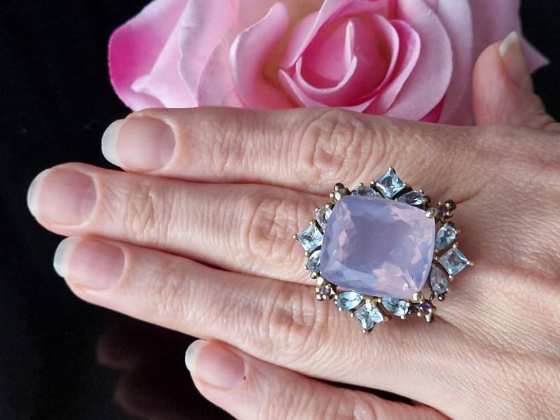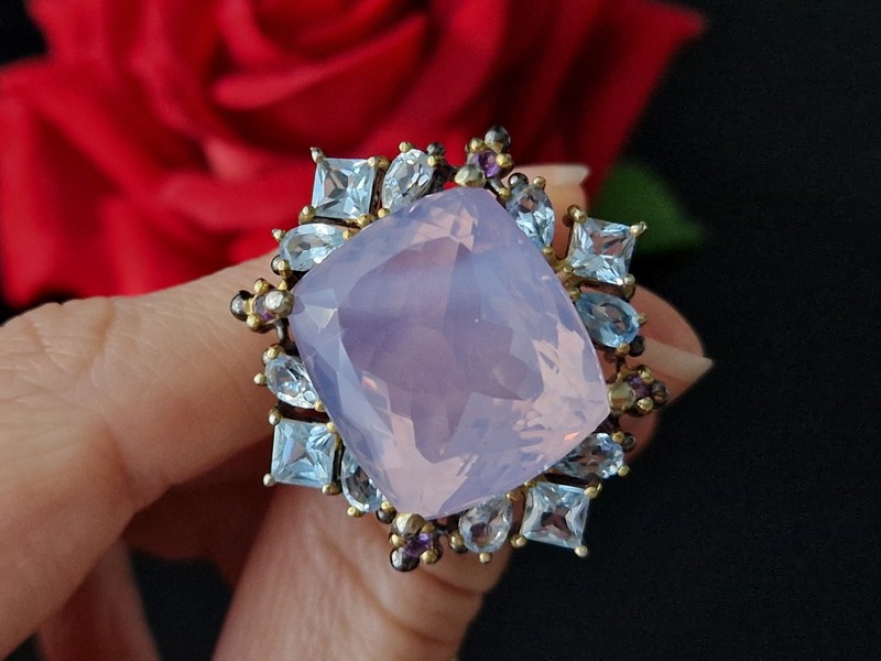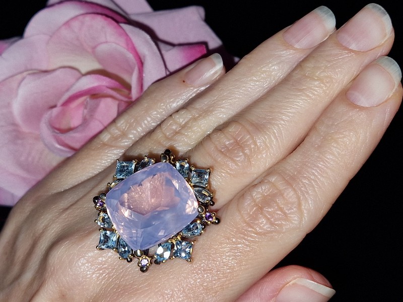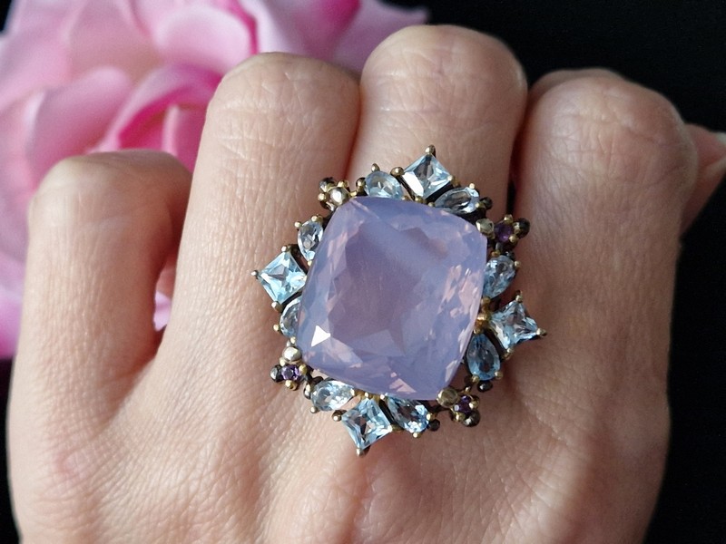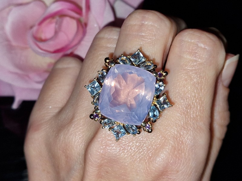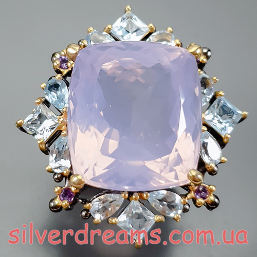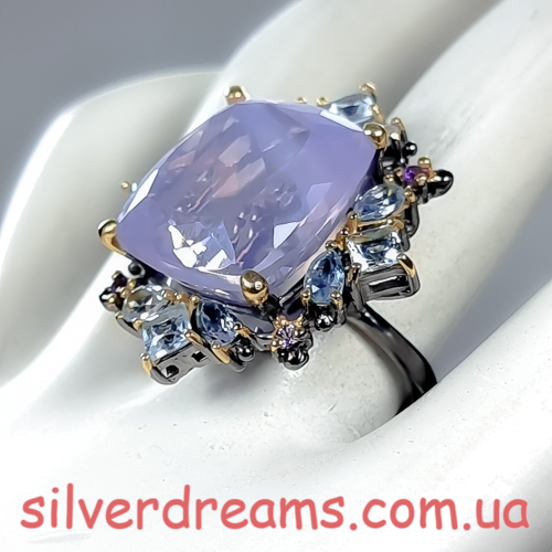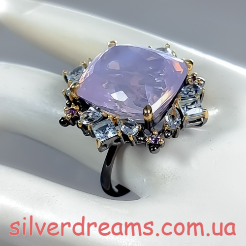 Уникальное кольцо ручной работы из серебра 925 пробы с двухцветным покрытием (чёрный родий + лимонное золото), инкрустировано крупным натуральным лавандовым кварцем в обрамлении природных топазов и аметистов.