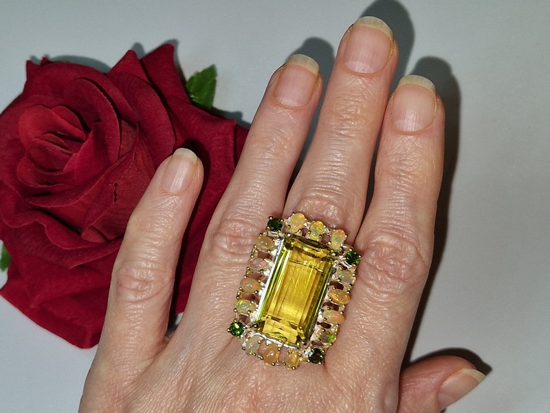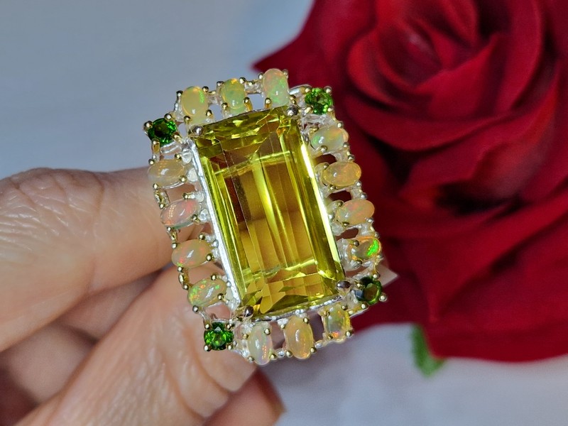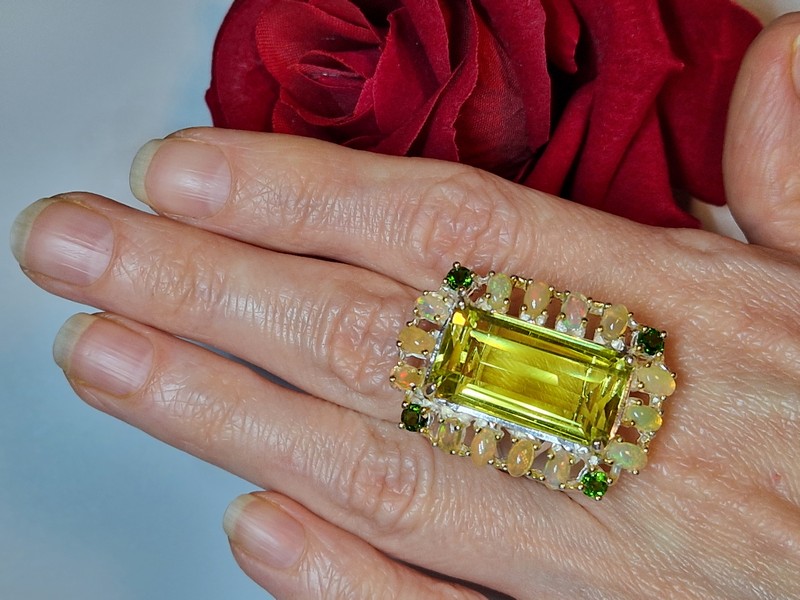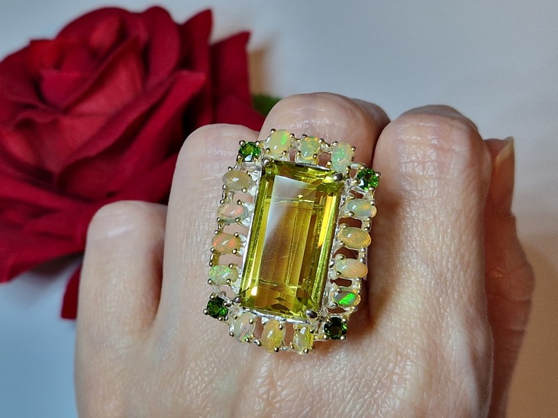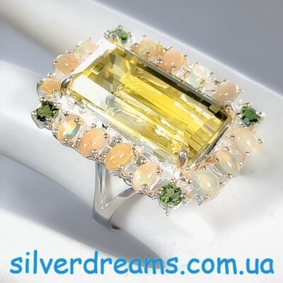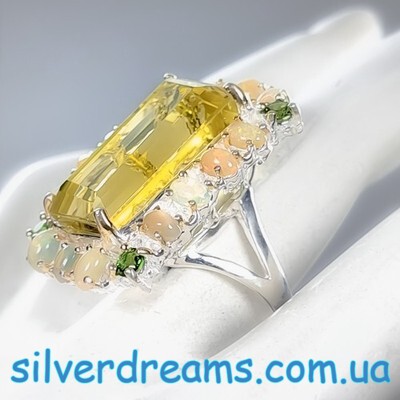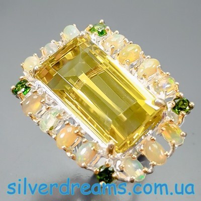 Размеры: лимонный кварц — 24х13 мм, опалы — 5х3 мм, диопсиды — 3 мм; корона кольца — 34х25 мм.