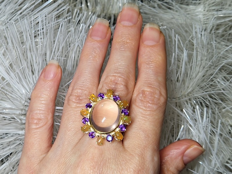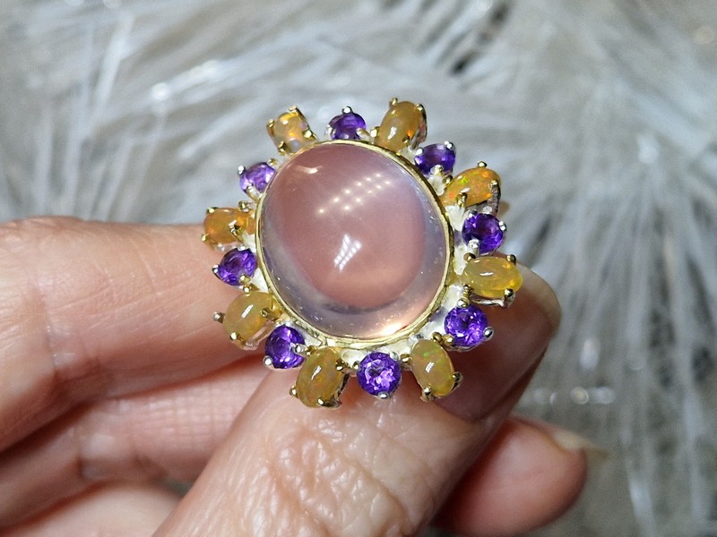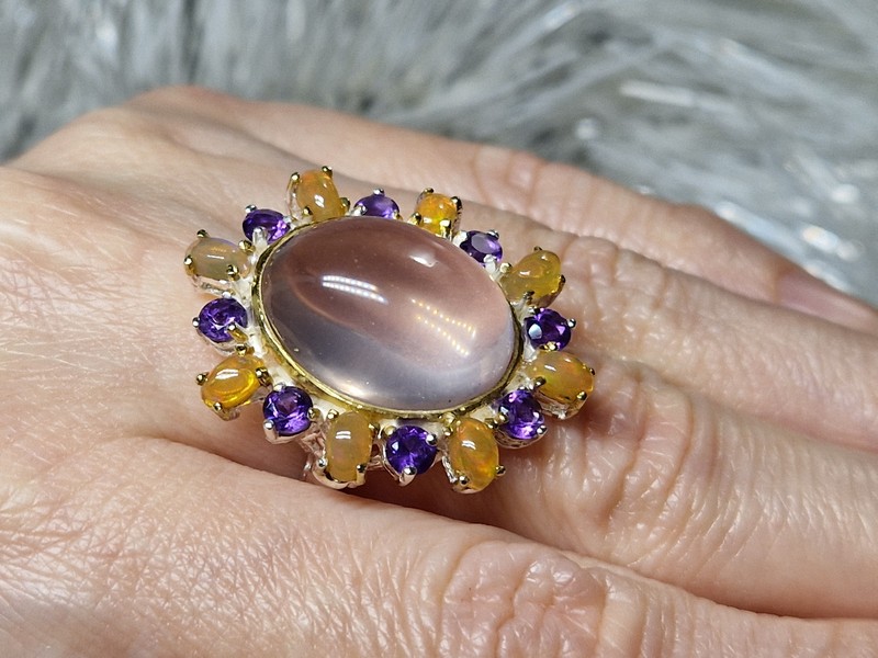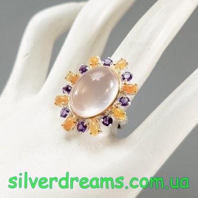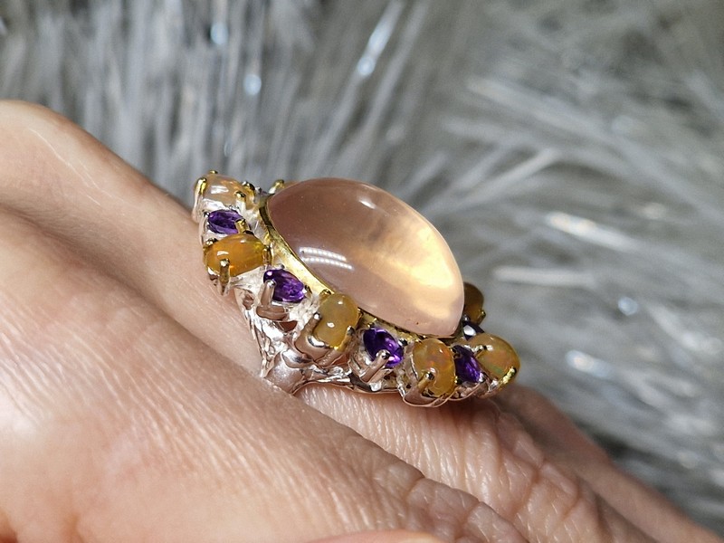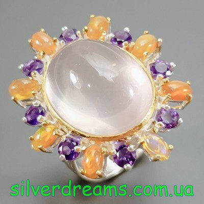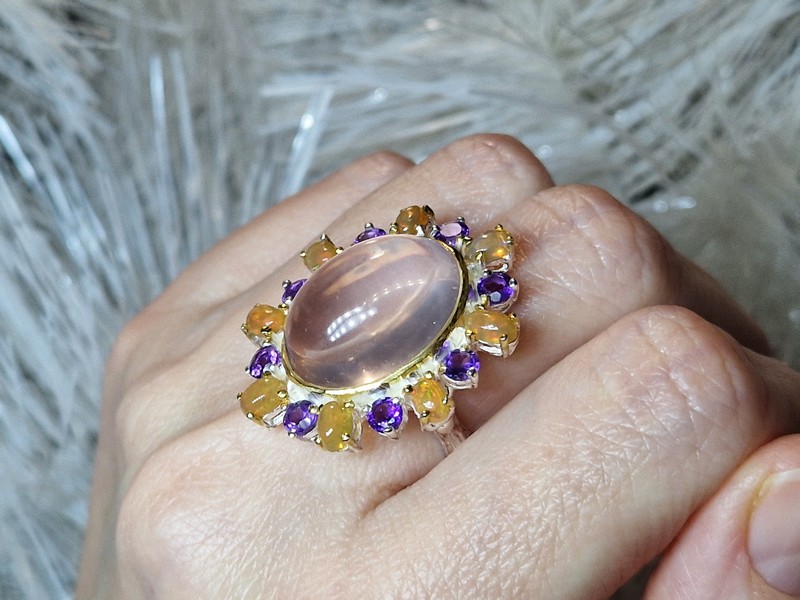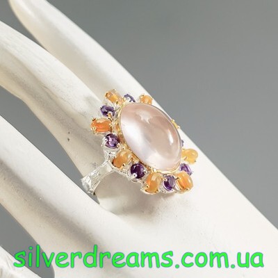 Уникальное кольцо ручной работы из серебра 925 пробы в двухцветной позолоте (белое + лимонное золото), инкрустировано крупным натуральным розовым кварцем в обрамлении природных огненных опалов и аметистов.