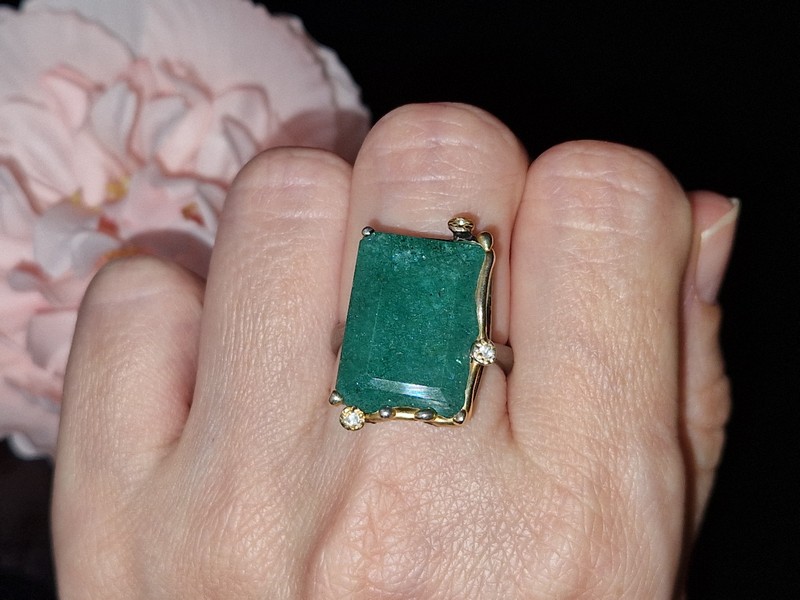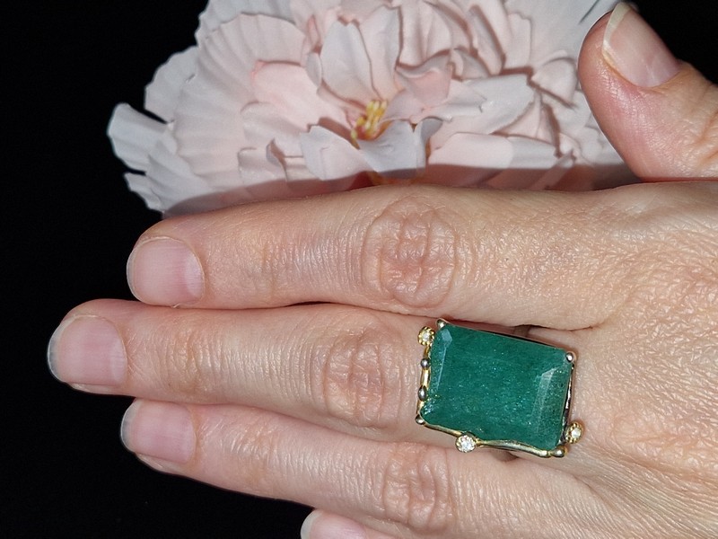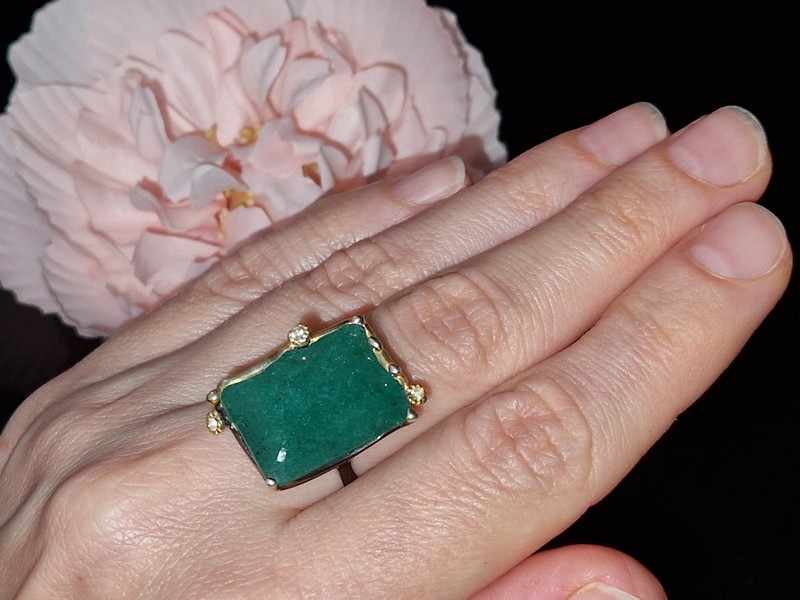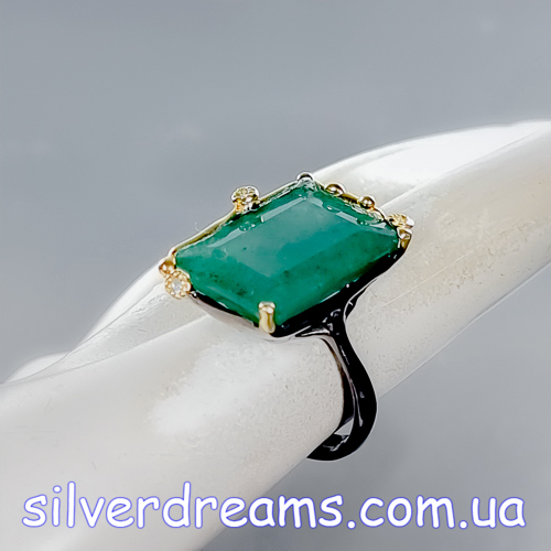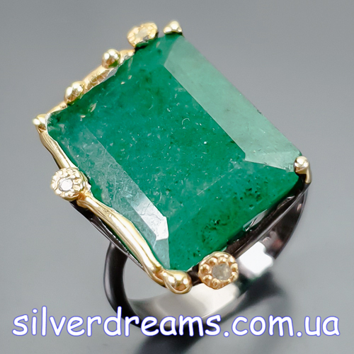 Уникальное кольцо ручной работы из серебра 925 пробы с двухцветным покрытием (чёрный родий + лимонное золото), инкрустировано крупным натуральным зелёным бериллом и природными топазами.