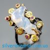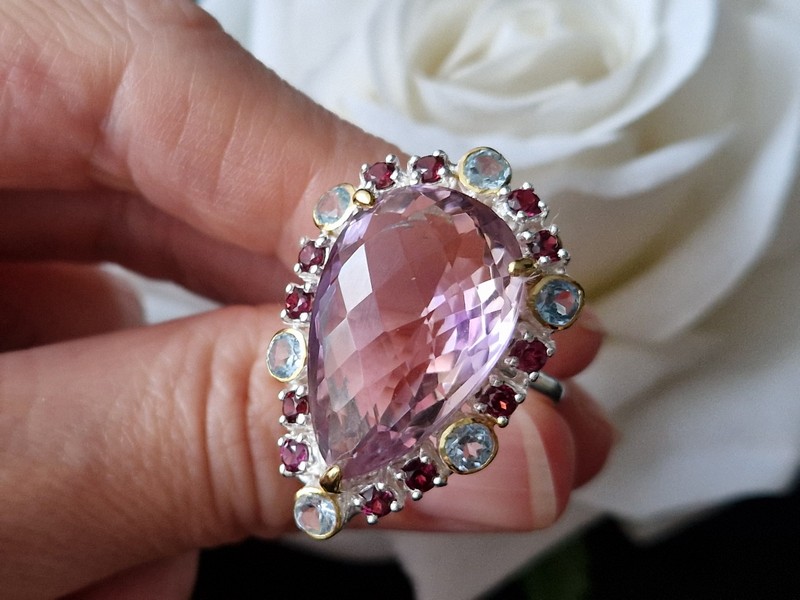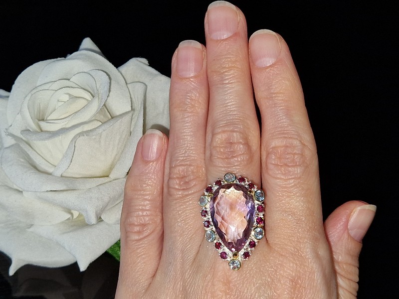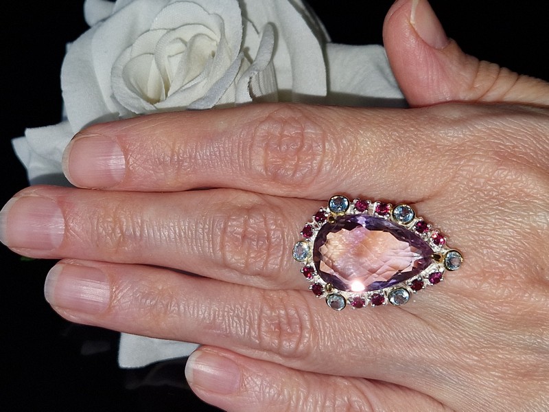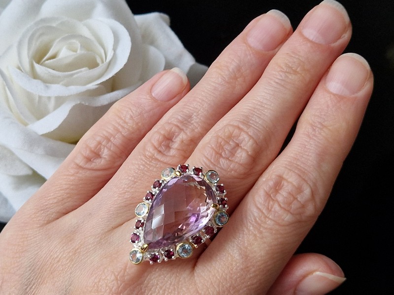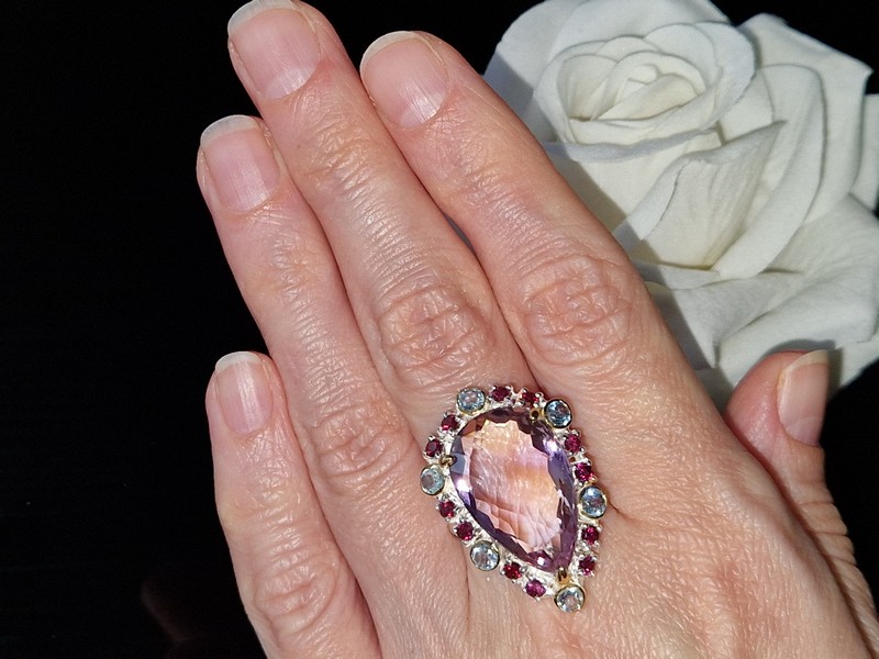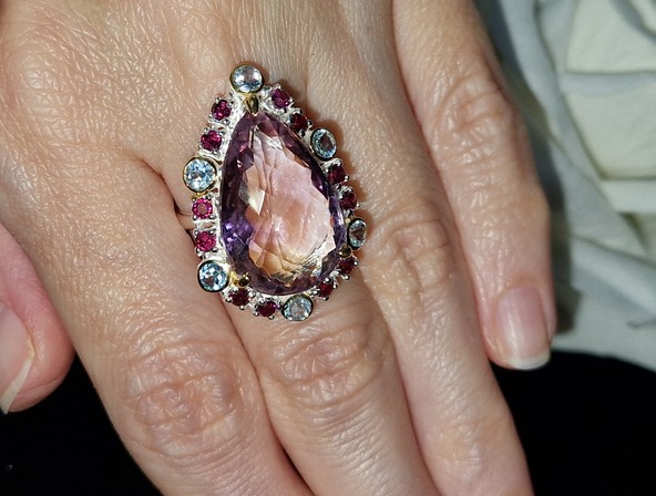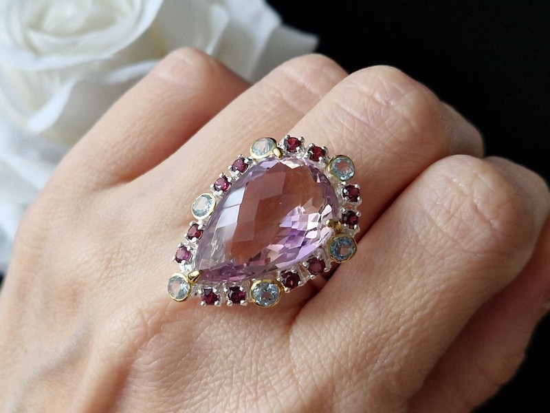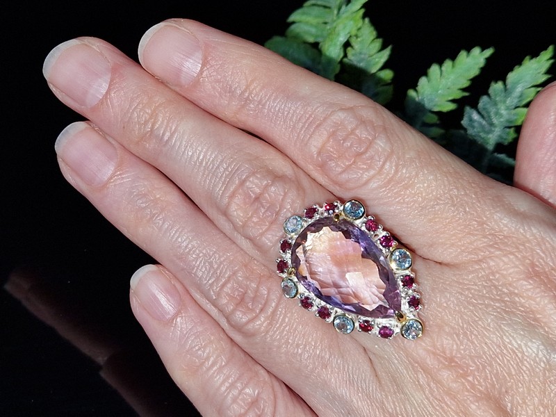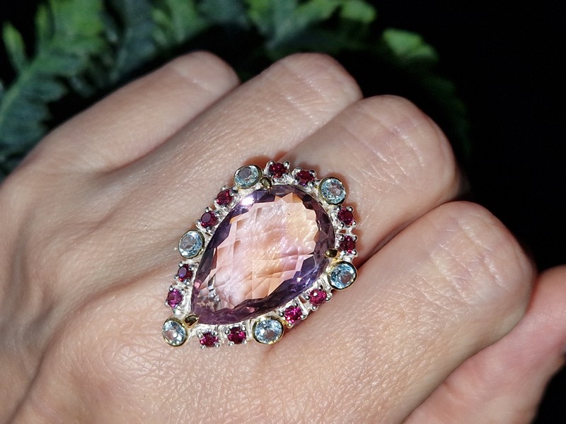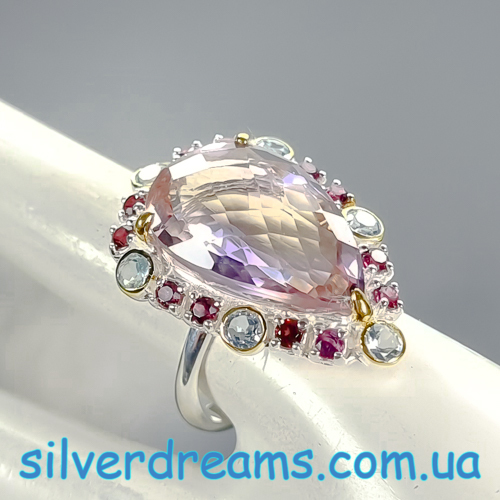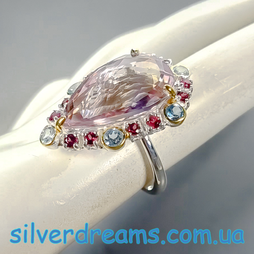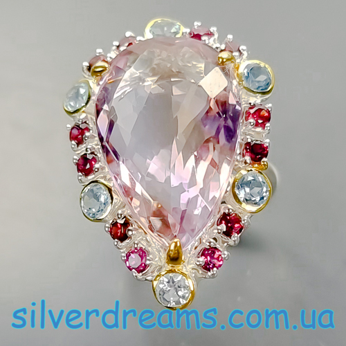 Уникальное кольцо ручной работы из серебра 925 пробы в двухцветной позолоте (белое + лимонное золото) с крупным натуральным аметрином, природными топазами и родолитами.