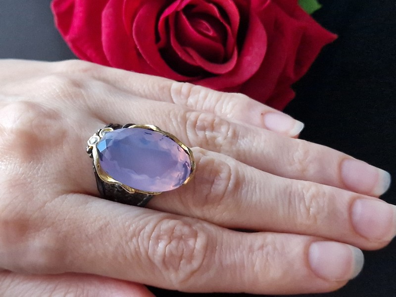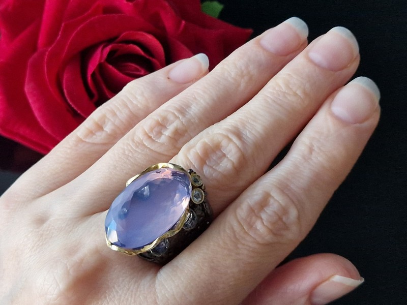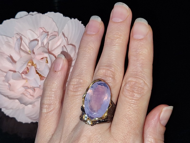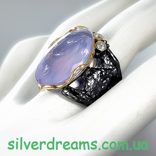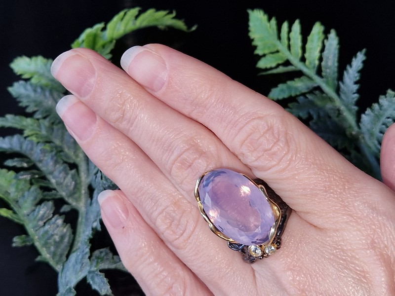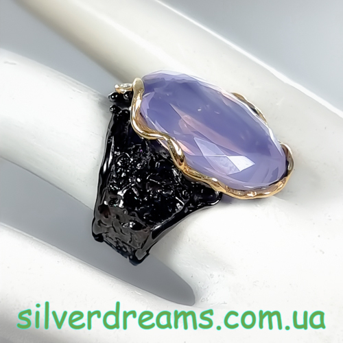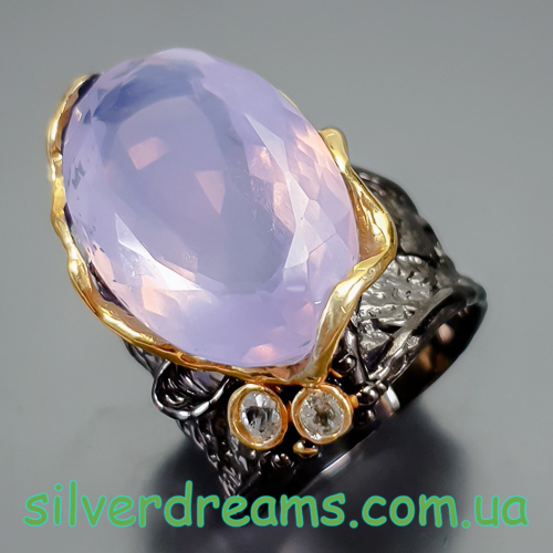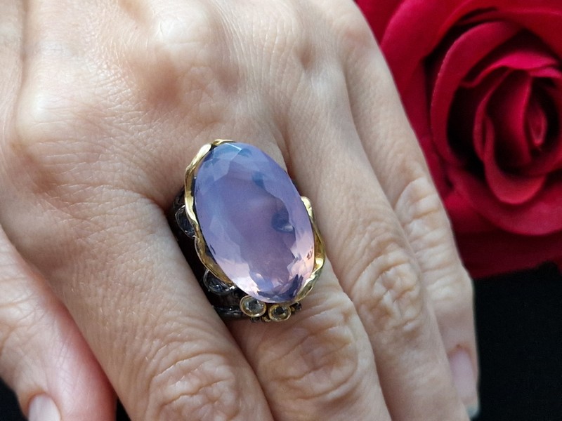 Уникальное кольцо ручной работы из серебра 925 пробы с двухцветным покрытием (чёрный родий + лимонное золото), инкрустировано крупным натуральным лавандовым кварцем и природными голубыми топазами.