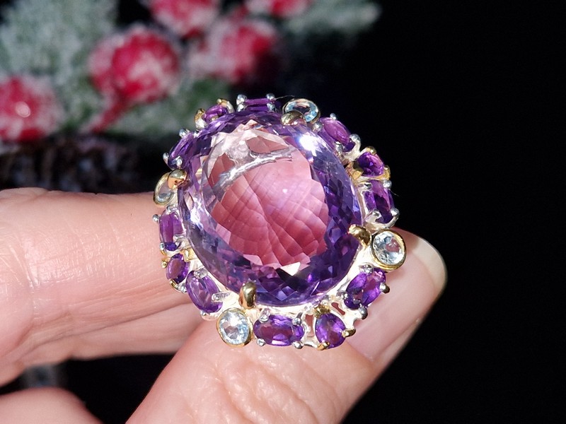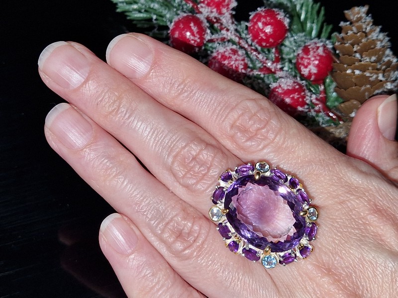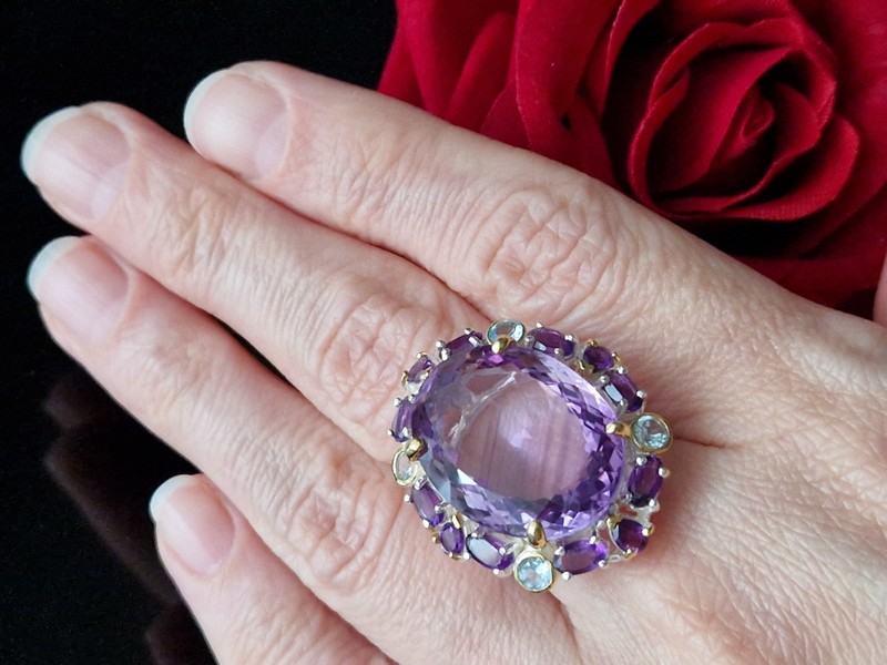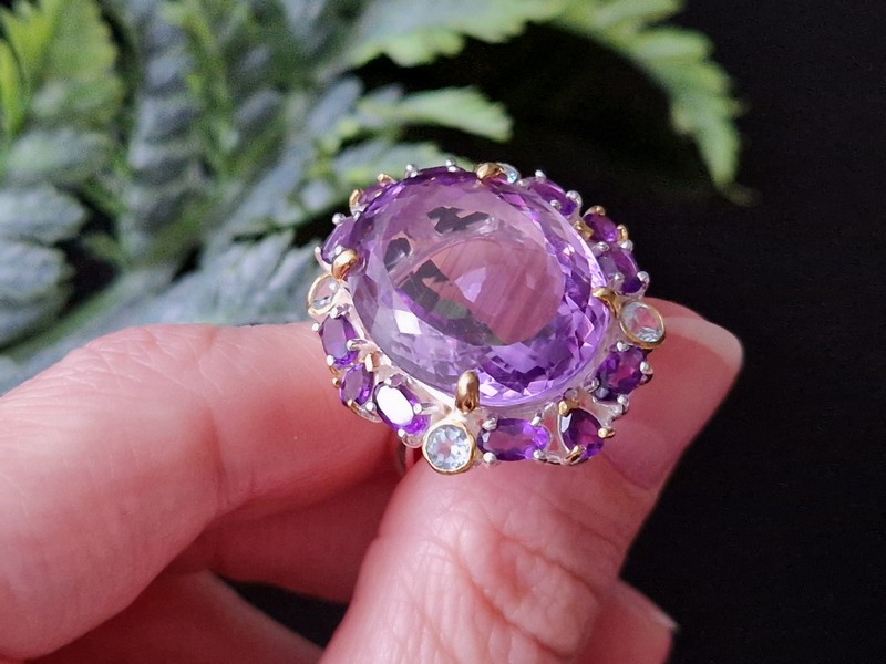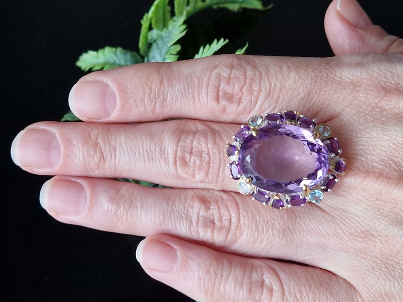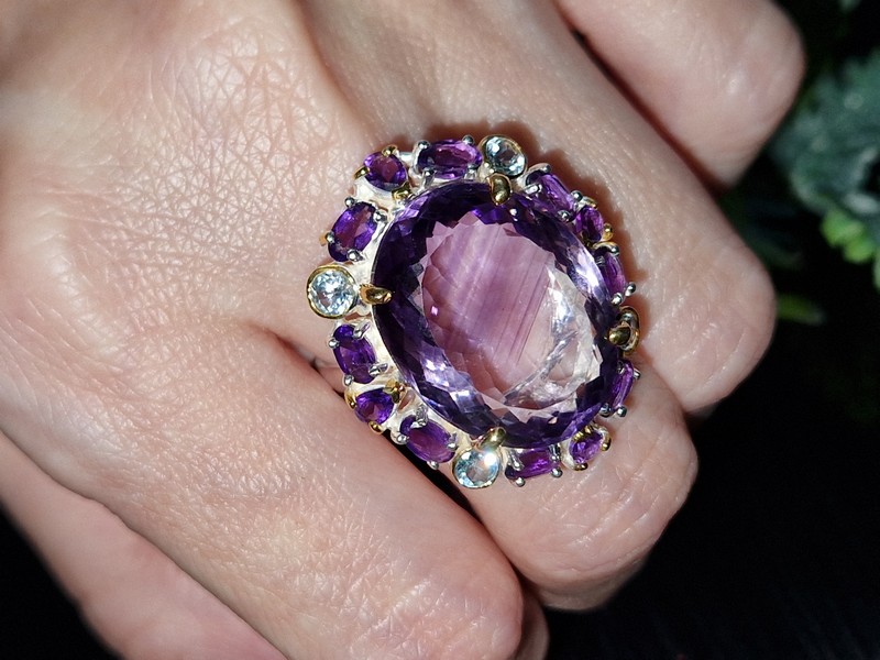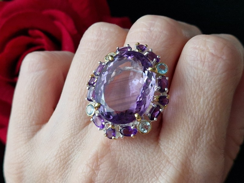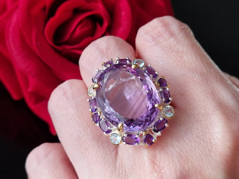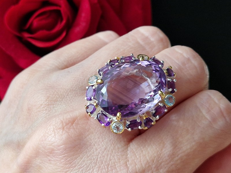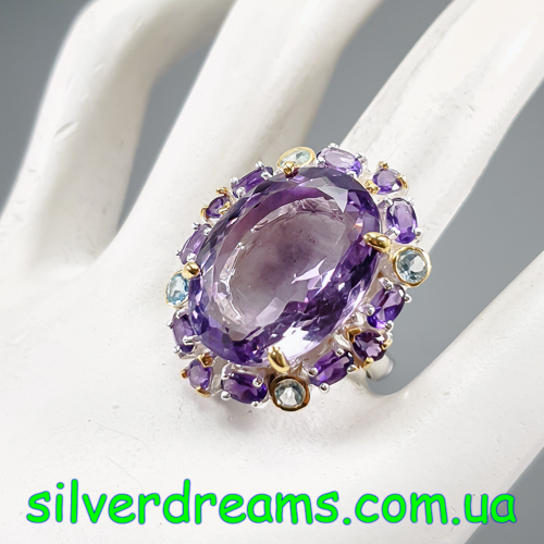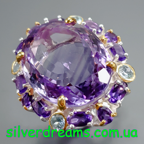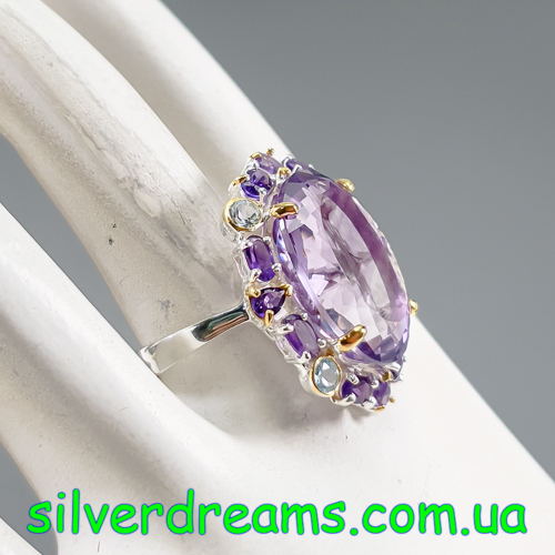 Уникальное кольцо ручной работы из серебра 925 пробы с двухцветным покрытием (белое + лимонное золото), инкрустировано крупным натуральным аметистом со «шторкой» в обрамлении природных аметистов и топазов.