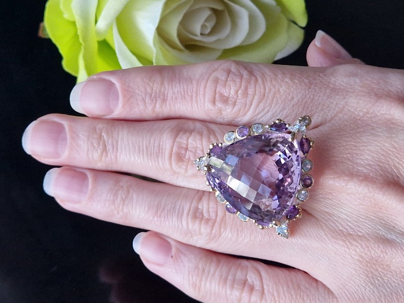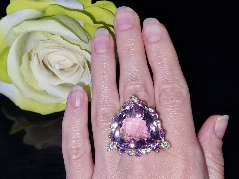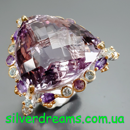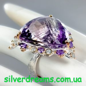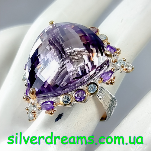 Уникальное кольцо ручной работы из серебра 925 пробы с двухцветным покрытием (белое + лимонное золото), инкрустировано крупным натуральным аметистом в обрамлении природных топазов и аметистов.