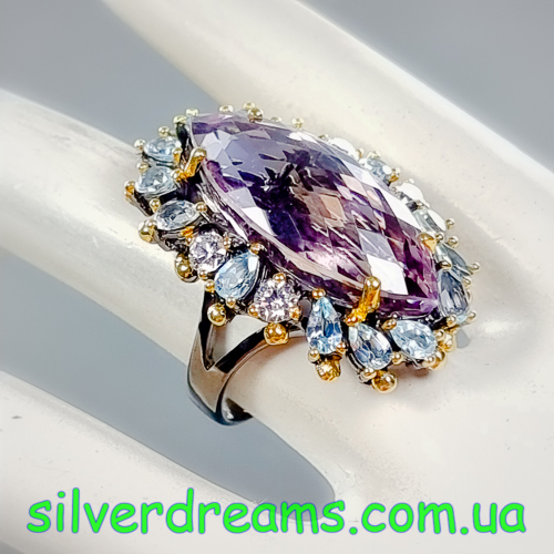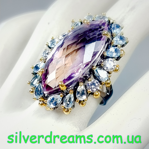 Дизайнерское кольцо из серебра 925 пробы с двухцветным покрытием (чёрный родий + лимонное золото), инкрустировано крупным натуральным аметрином, природными голубыми топазами и фианитами.