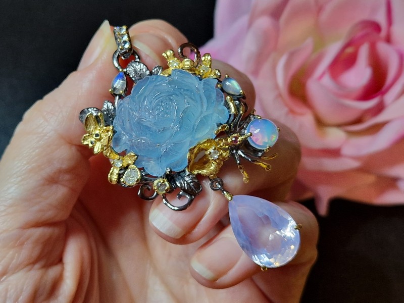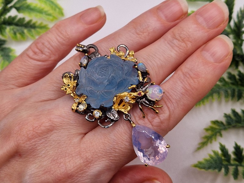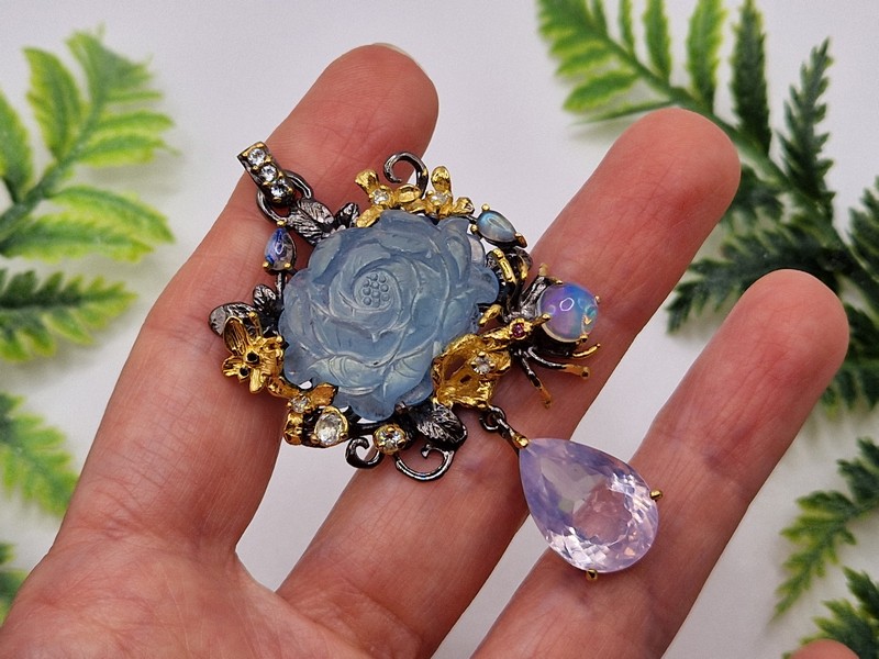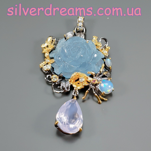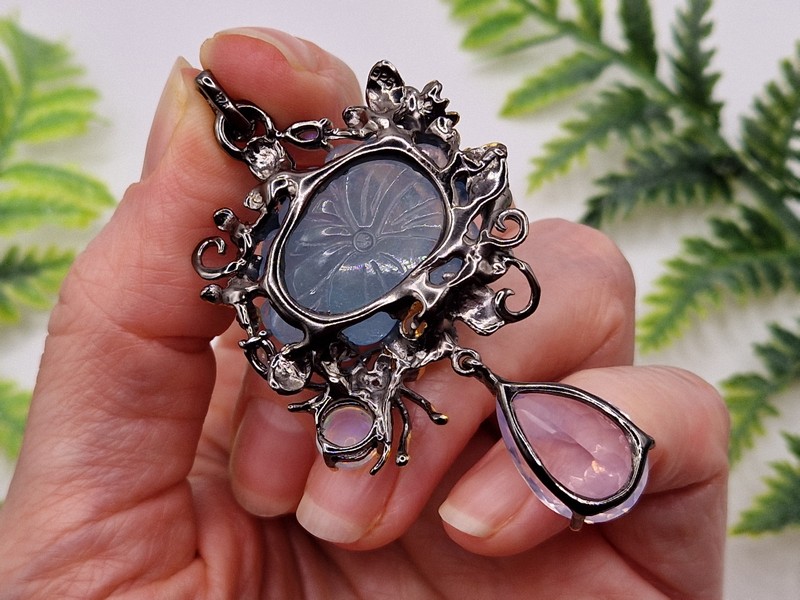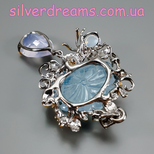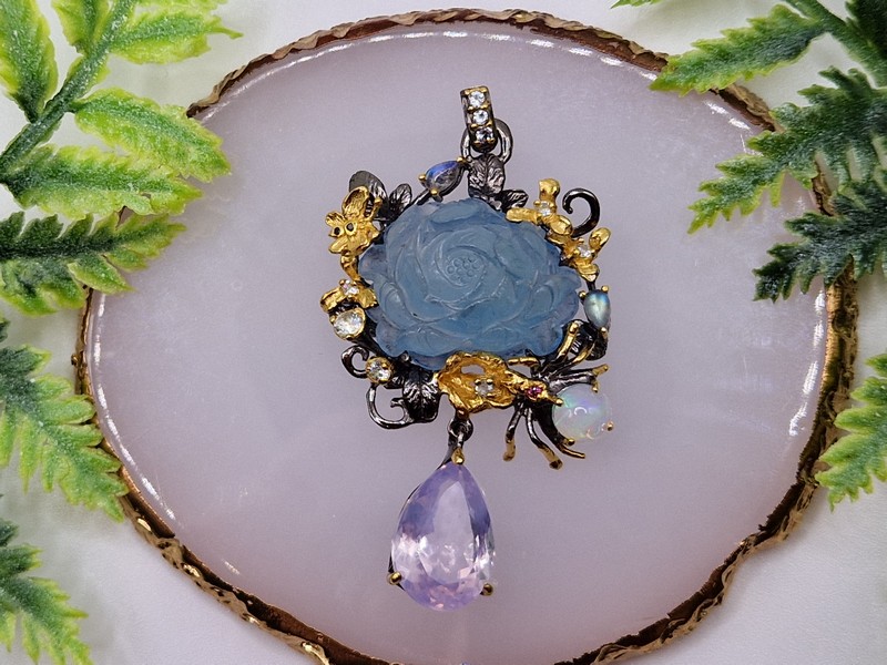Уникальный кулон ручной работы из серебра 925 пробы с двухцветным покрытием (чёрный родий + лимонное золото), инкрустирован крупным натуральным резным аквамарином, природным лавандовым кварцем, огненным опалом и лунным камнем адуляр.