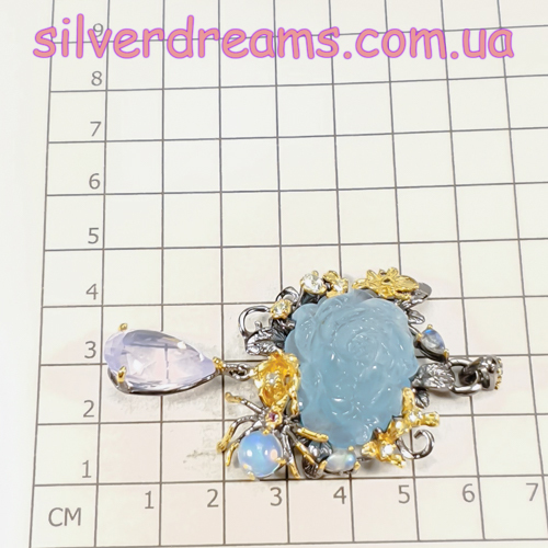 Размеры: аквамарин – 28х22 мм, лавандовый кварц – 18х12 мм, опал – 7 мм; кулон – 64x37x14 мм.