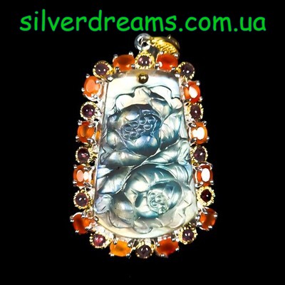 Огранка: резной цветок, каплевидный кабошон, фасетный круг.