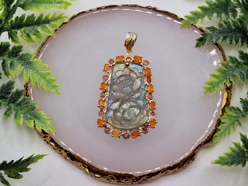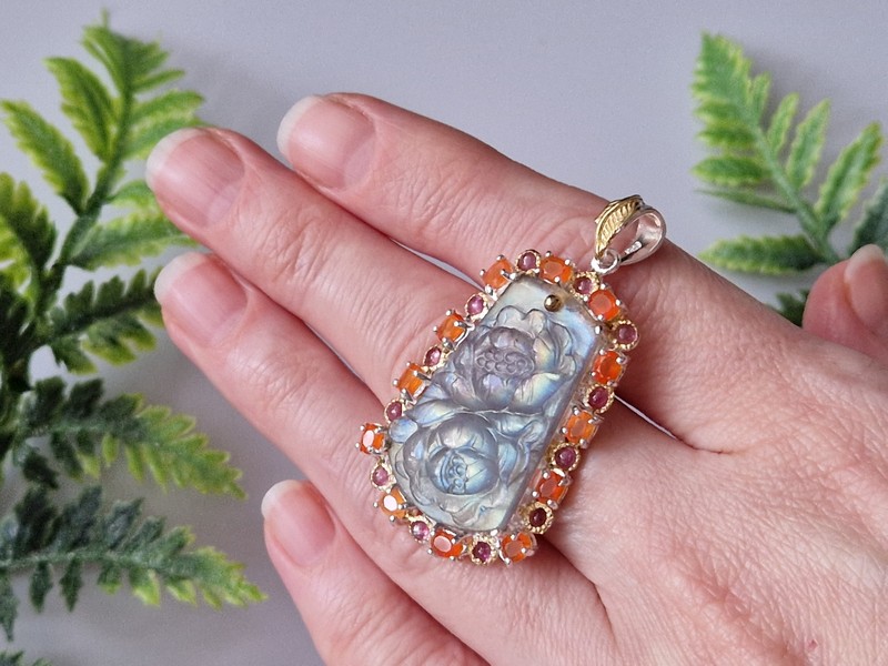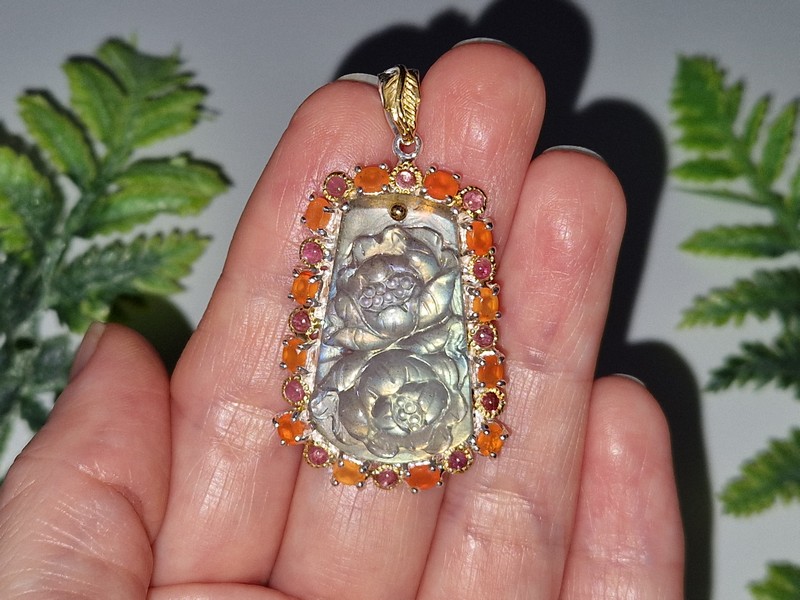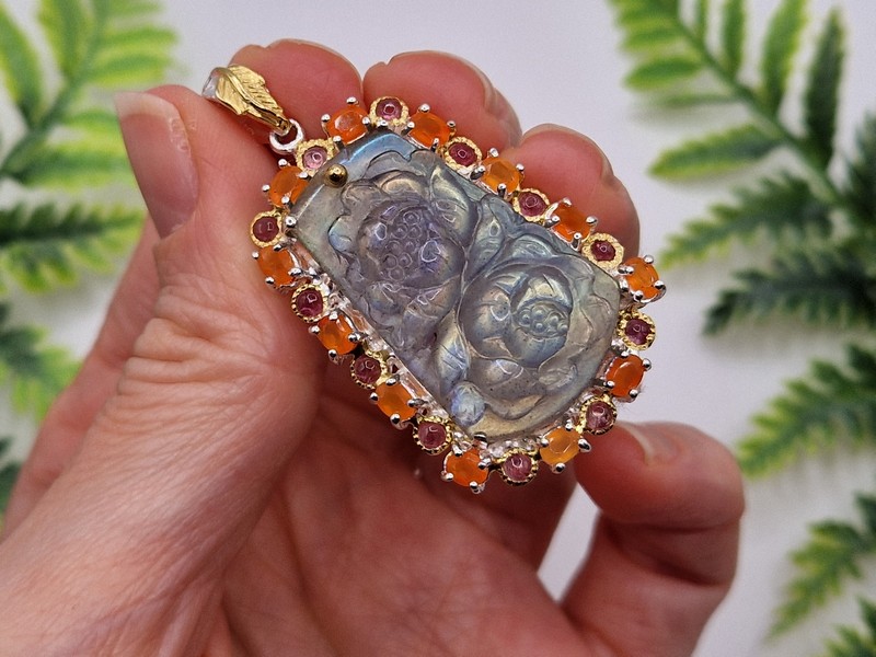 Уникальный кулон ручной работы из серебра 925 пробы в двухцветной позолоте (белое + лимонное золото), инкрустирован крупным натуральным лабрадоритом, природным сердоликом и турмалином.